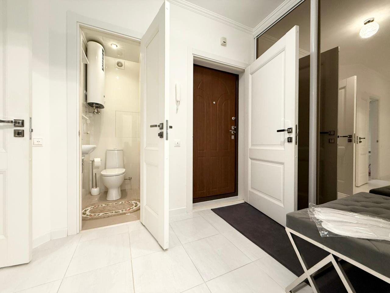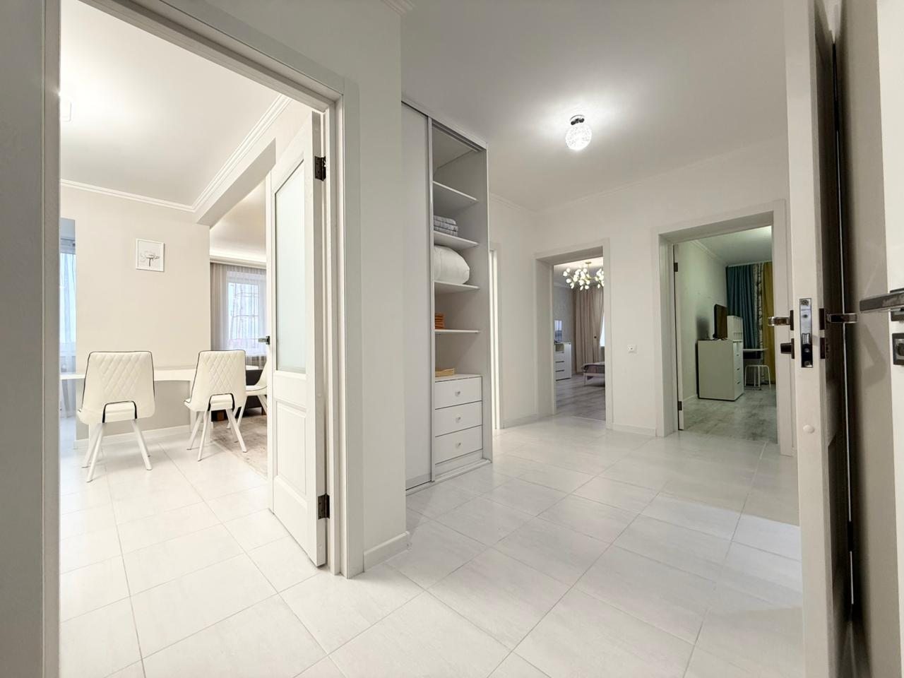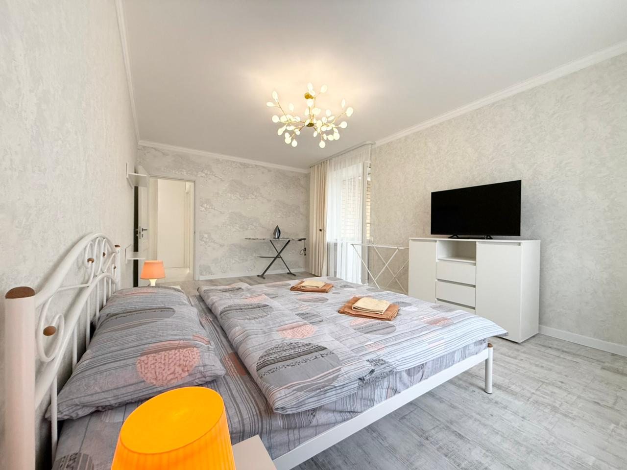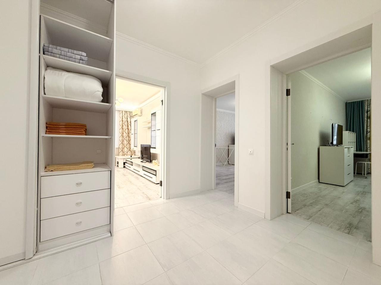 На просторной площади 87 квадратных метров имеется большая и удобная двуспальная кровать, кондиционер, прикроватные лампы, телевизор с комодом, гладильные принадлежности, вместительный шкаф, балкон, диван, а также ванная комната со стиральной машиной.