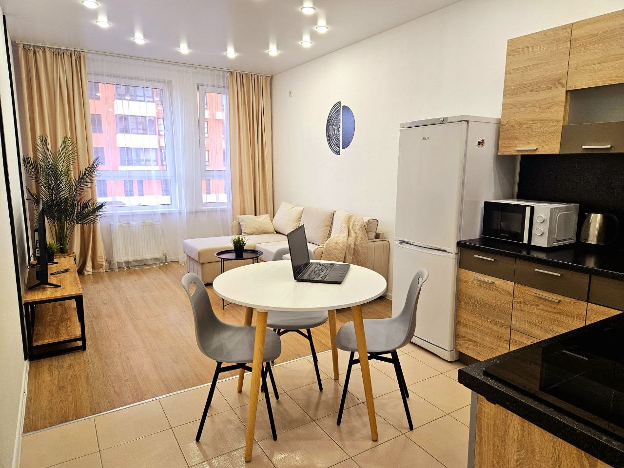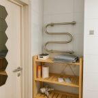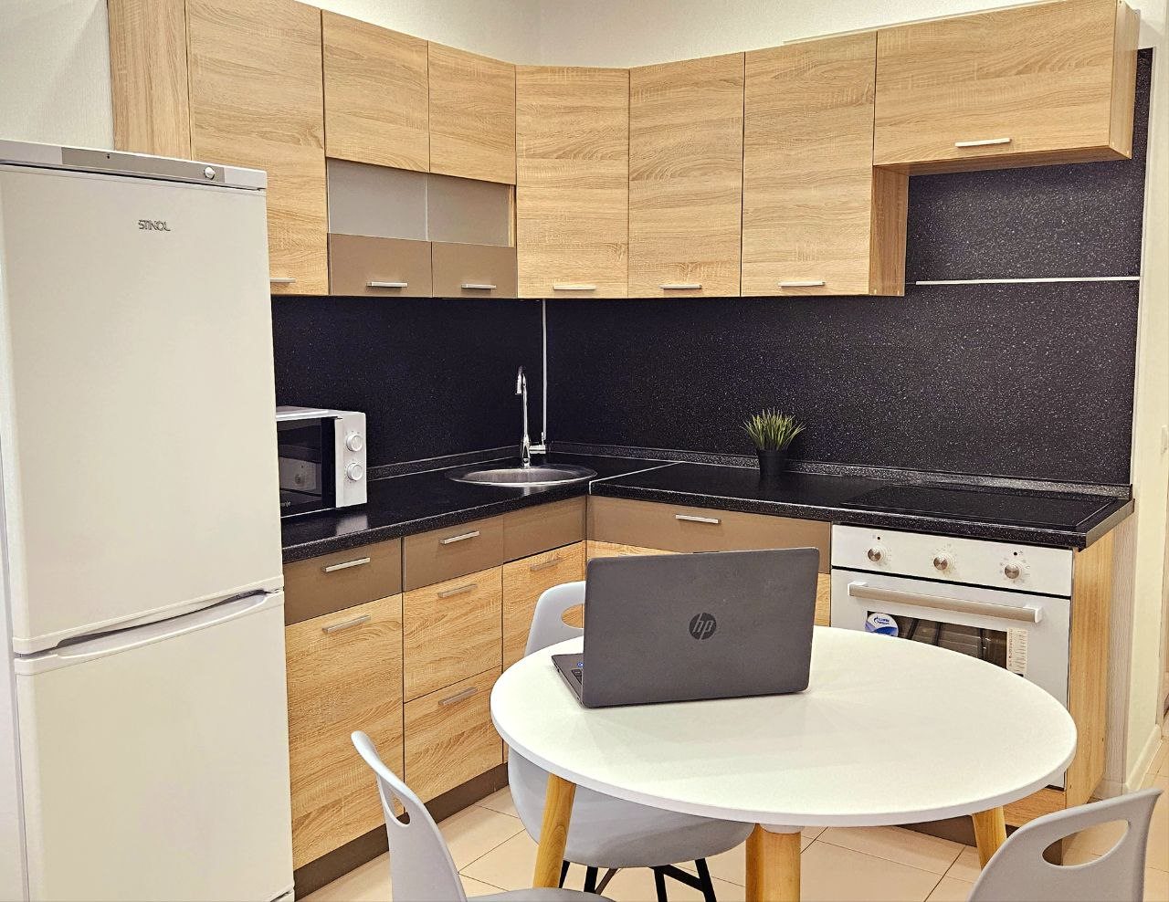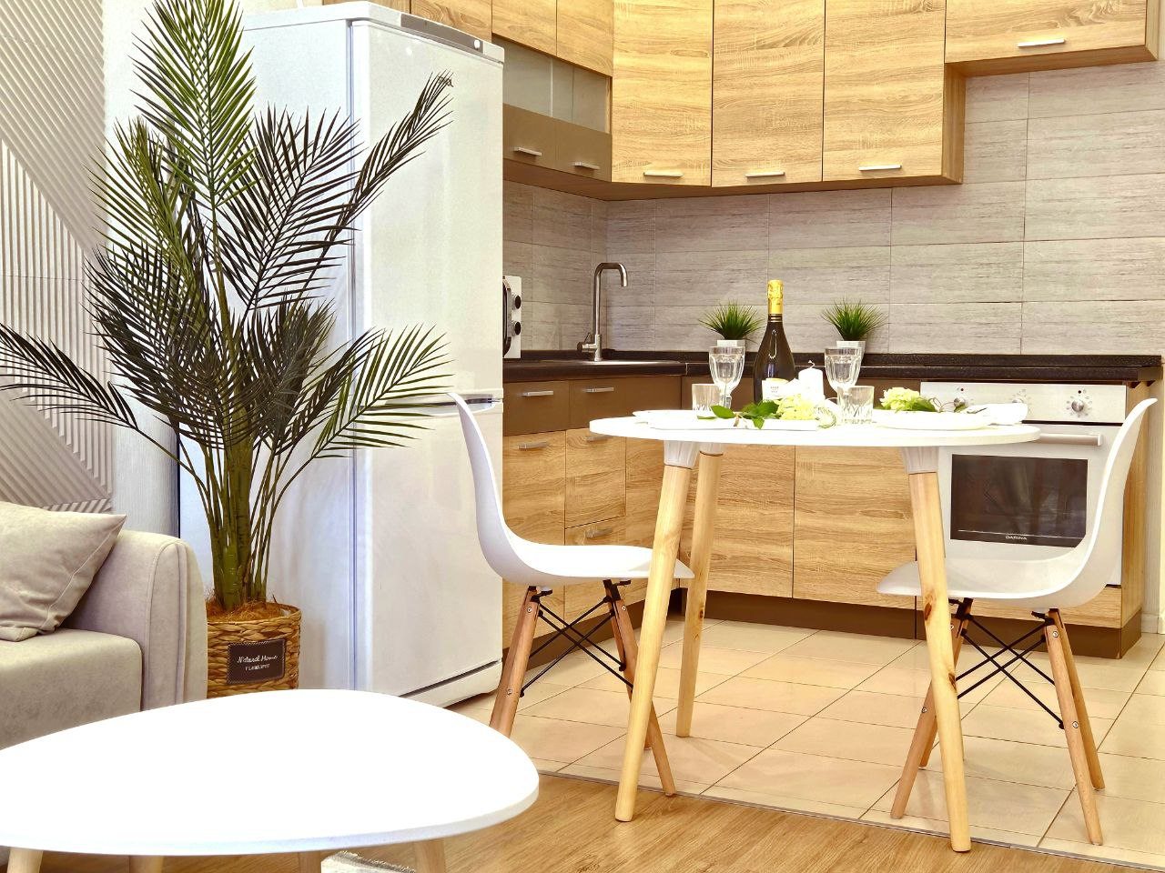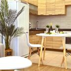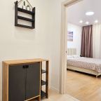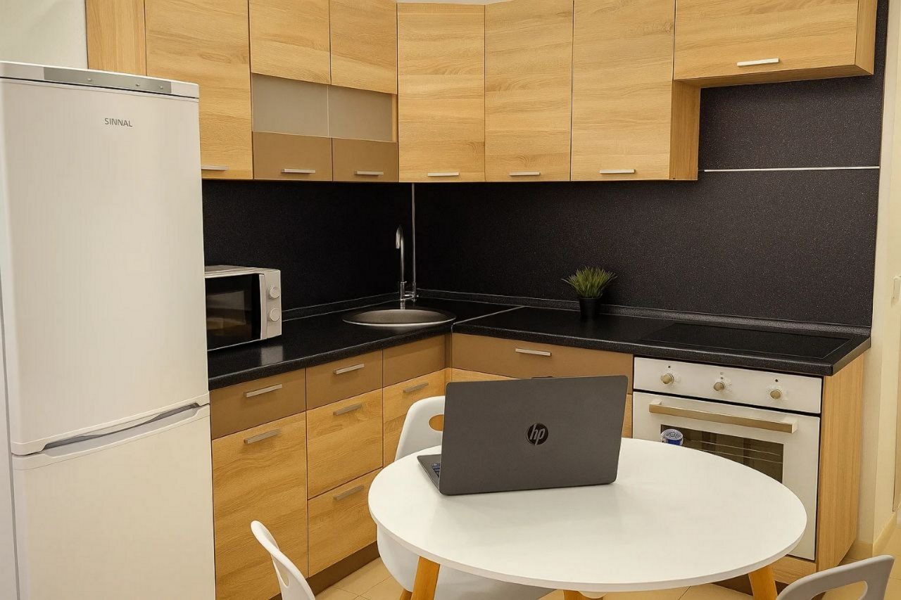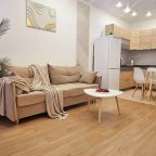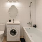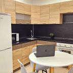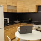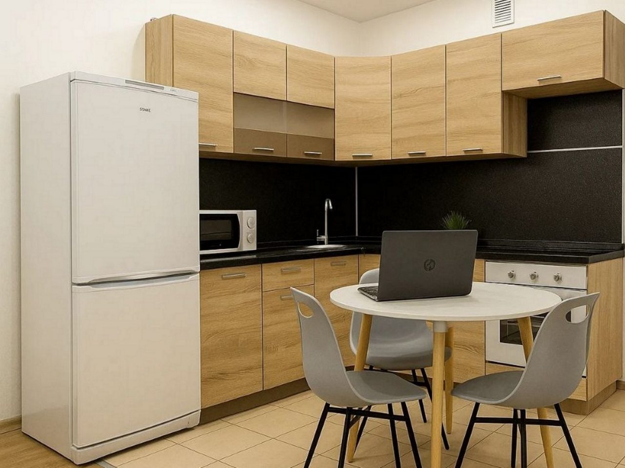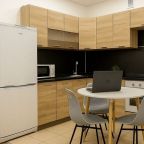 На кухонной зоне имеются бытовые приборы: холодильник, микроволновая печь, духовой шкаф и плита. В пешей доступности есть кондитерская и пиццерия.