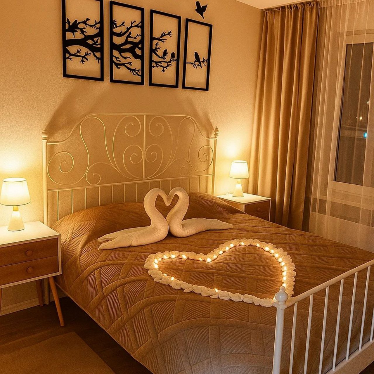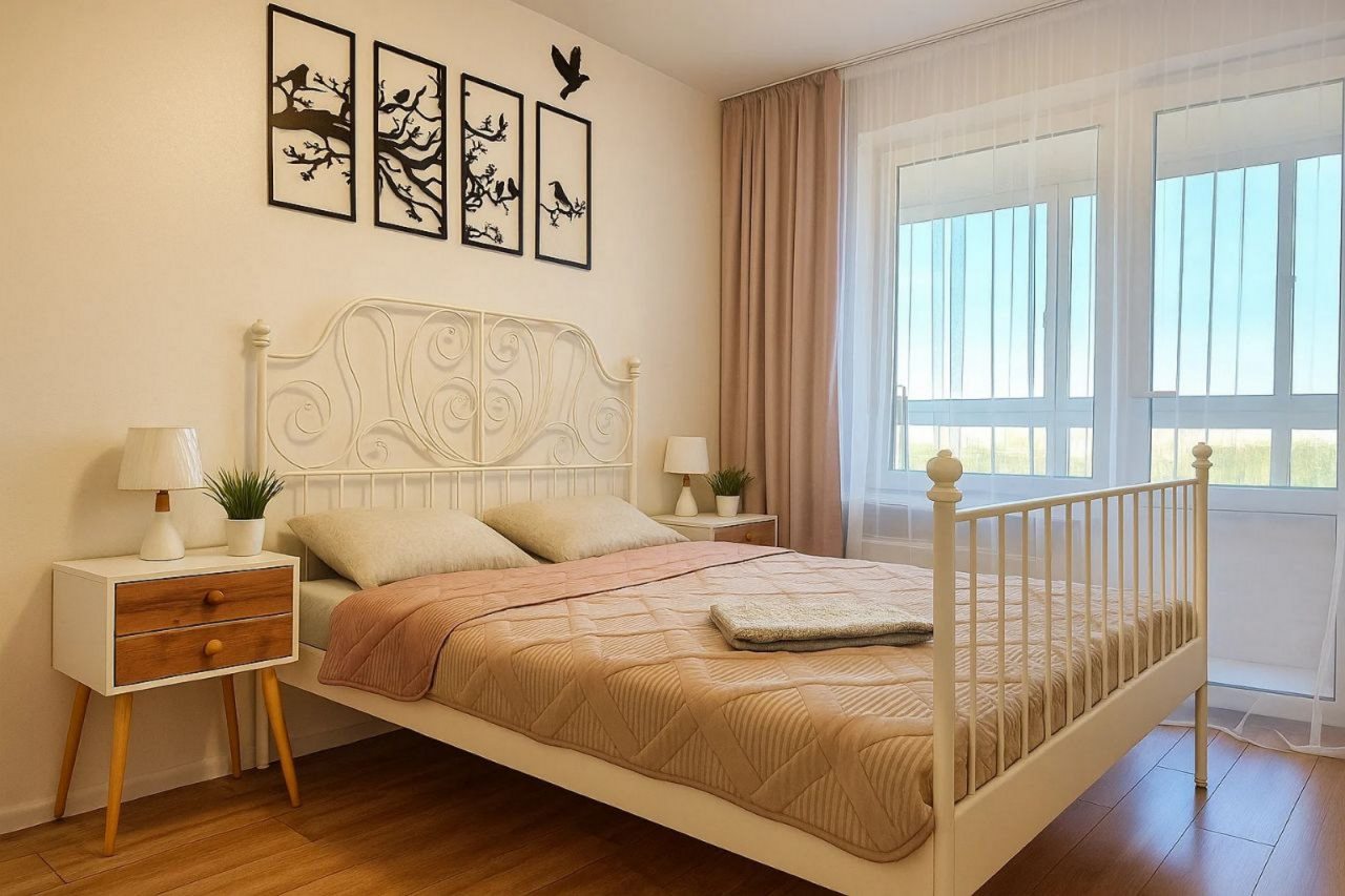 - Доступно размещение до четырёх человек (одна двуспальная кровать и один раскладной диван). Чистое постельное бельё (по одному двуспальному комплекту на кровать) входит в стоимость проживания.