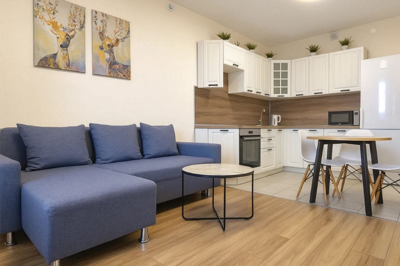 Светлая кухня укомплектована бытовой техникой для организации питания: микроволновая печь, электрочайник, холодильник, варочная панель, духовой шкаф и посуда. Обеденный стол на две персоны отлично подойдет для совместных завтраков и романтических ужинов. Недалеко есть кондитерская, где можно насладиться десертами.