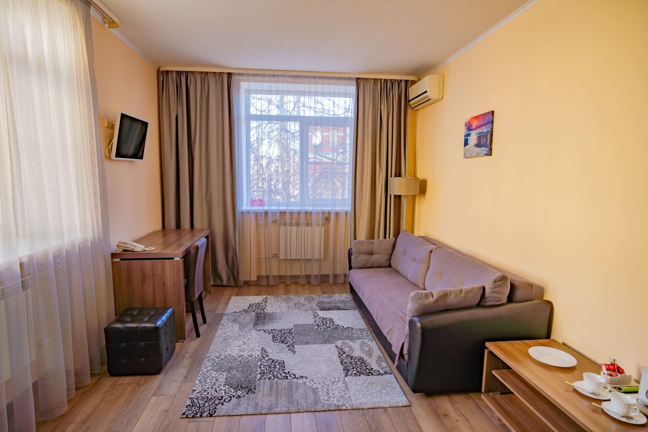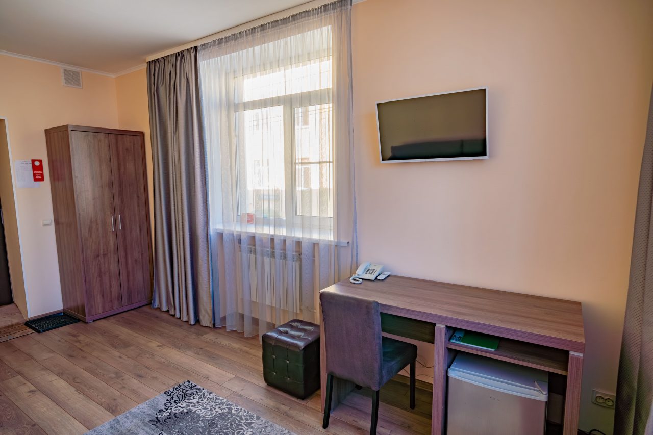 отель расположен очень удачно, есть где машину оставить. тихое спокойное место, напротив первая достопримечательность, за углом еще и ты окунаешься в Калугу. удобные номера, в номерах все есть, что необходимо на сутки. отель очень вместительный, хотя и не высокий. в цокольном этаже расположено кафе - завтрак был прекрасен. при заселении нам предложили разные варианты размещения на выбор - для нас с мужем двухспальную кровать, а для дочерей две раздельных кровати. выспались, отдохнули. Спасибо.