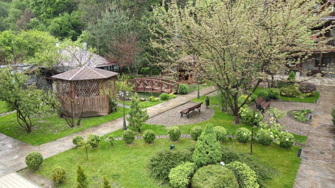 Красивый дворик, пруд, туи, есть мангальная удобная зона, теплый бассейн с подсветкой, номер просторный, нам все понравилось