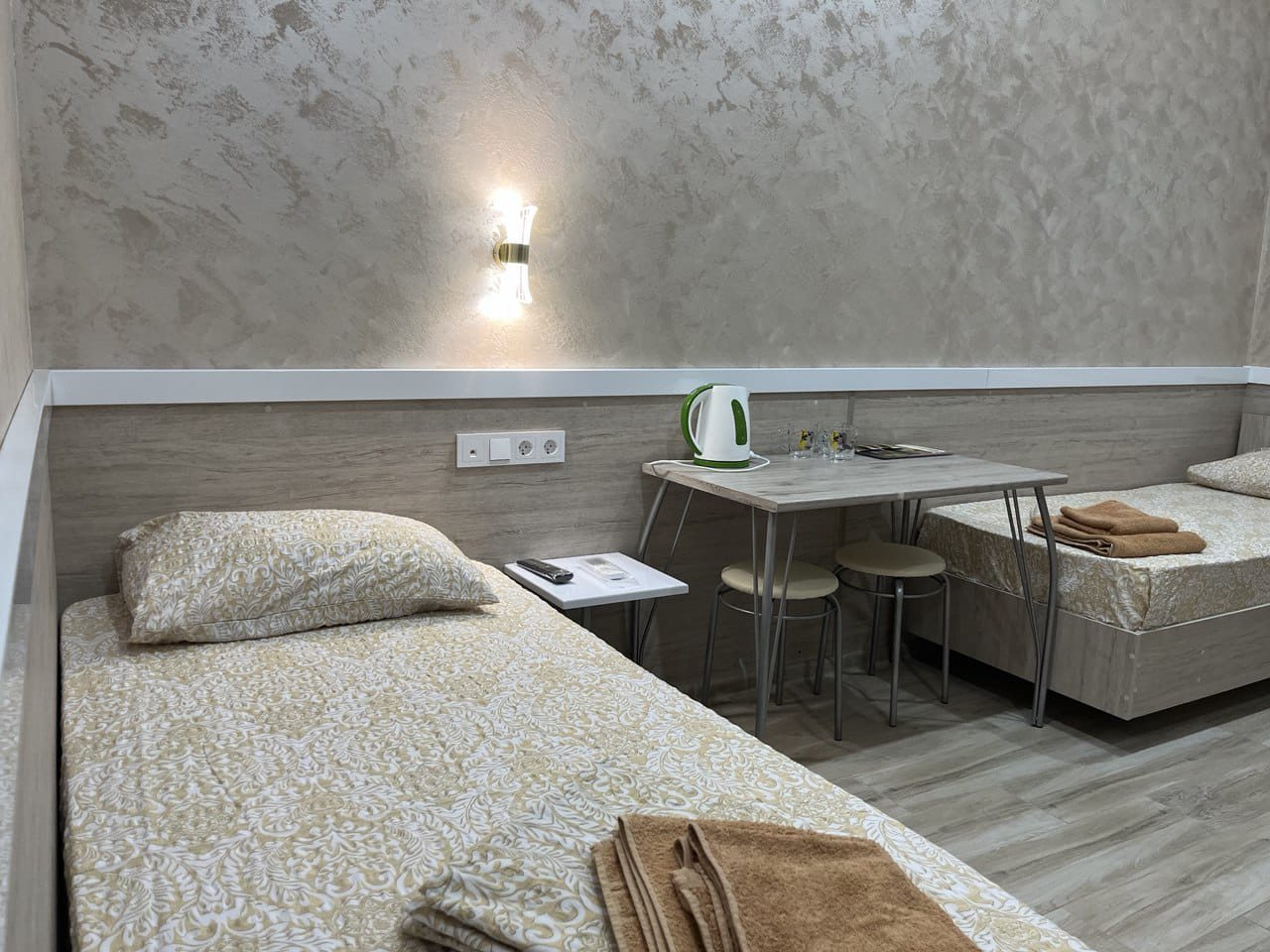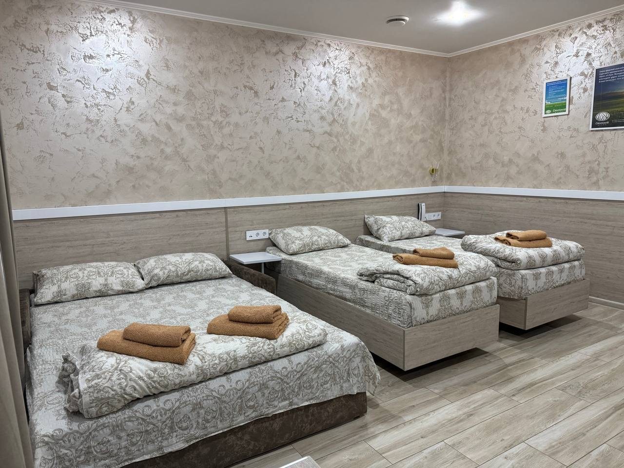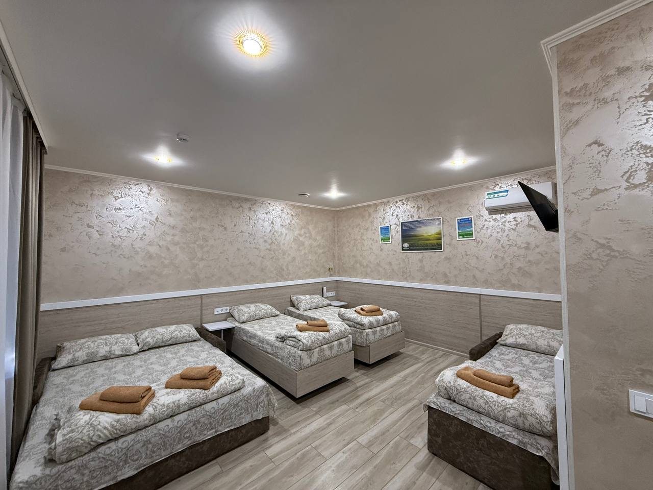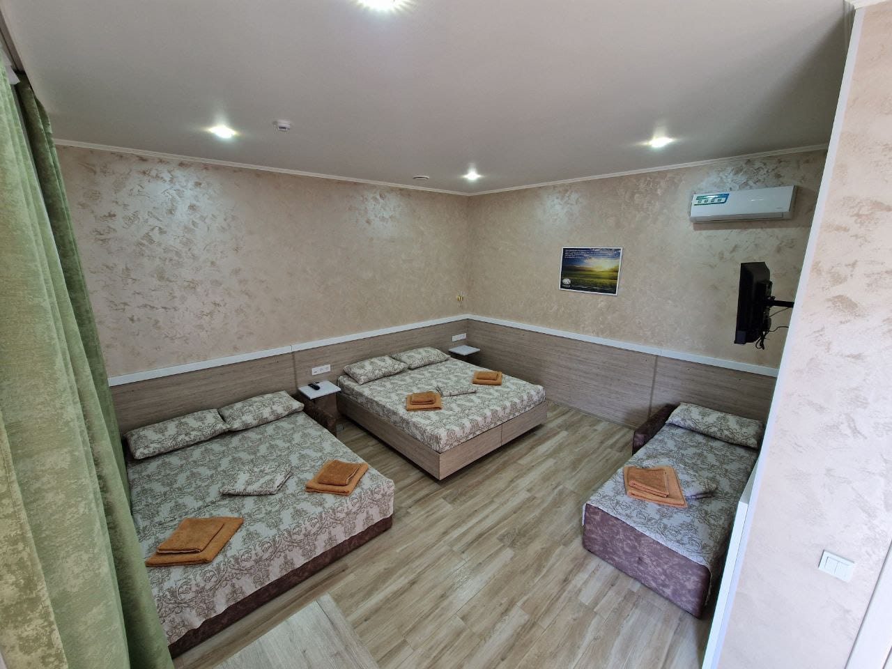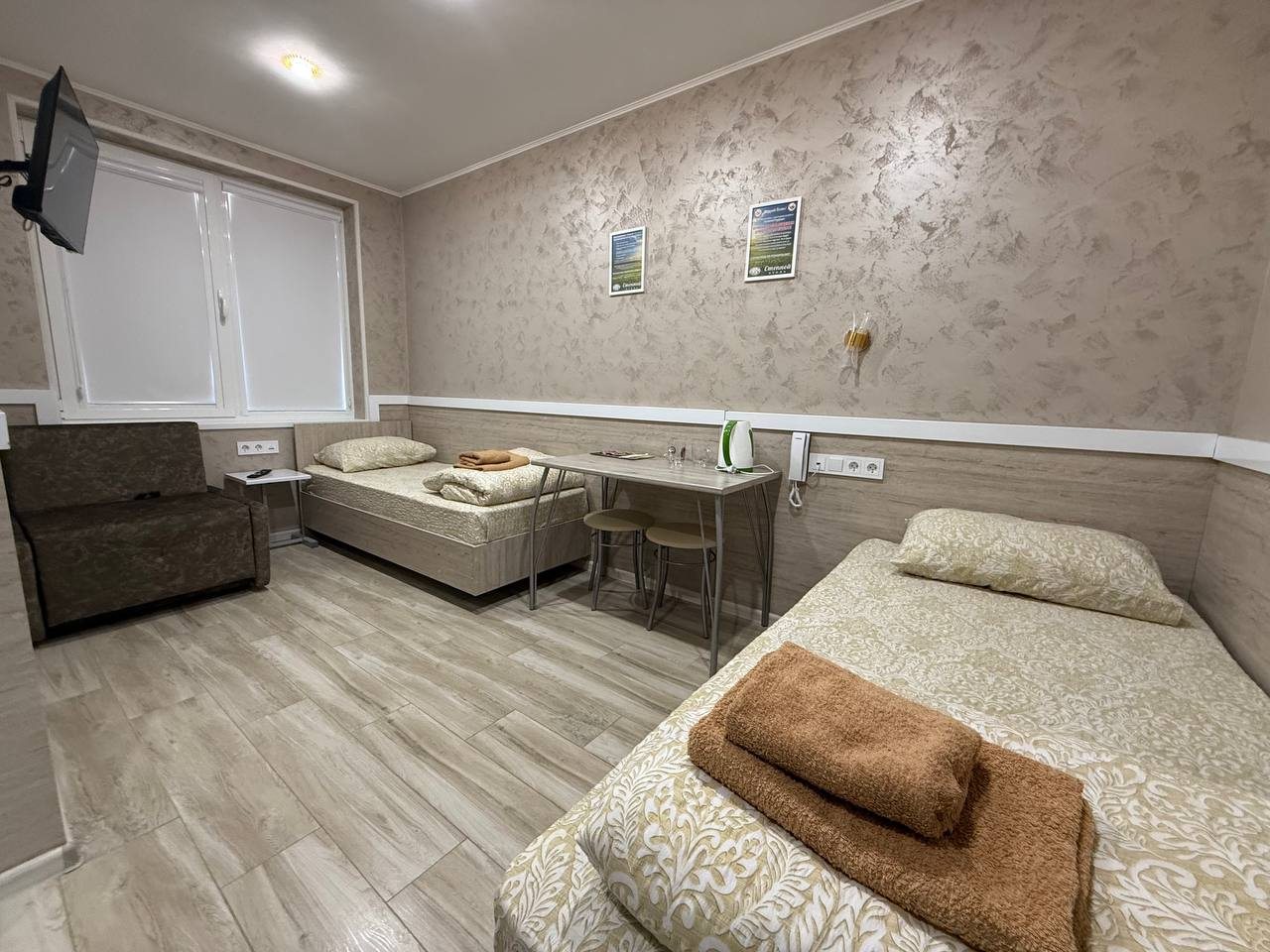 - Четырехместный (Стандартный четырехместный номер две односпальные кровати и двуспальный диван)