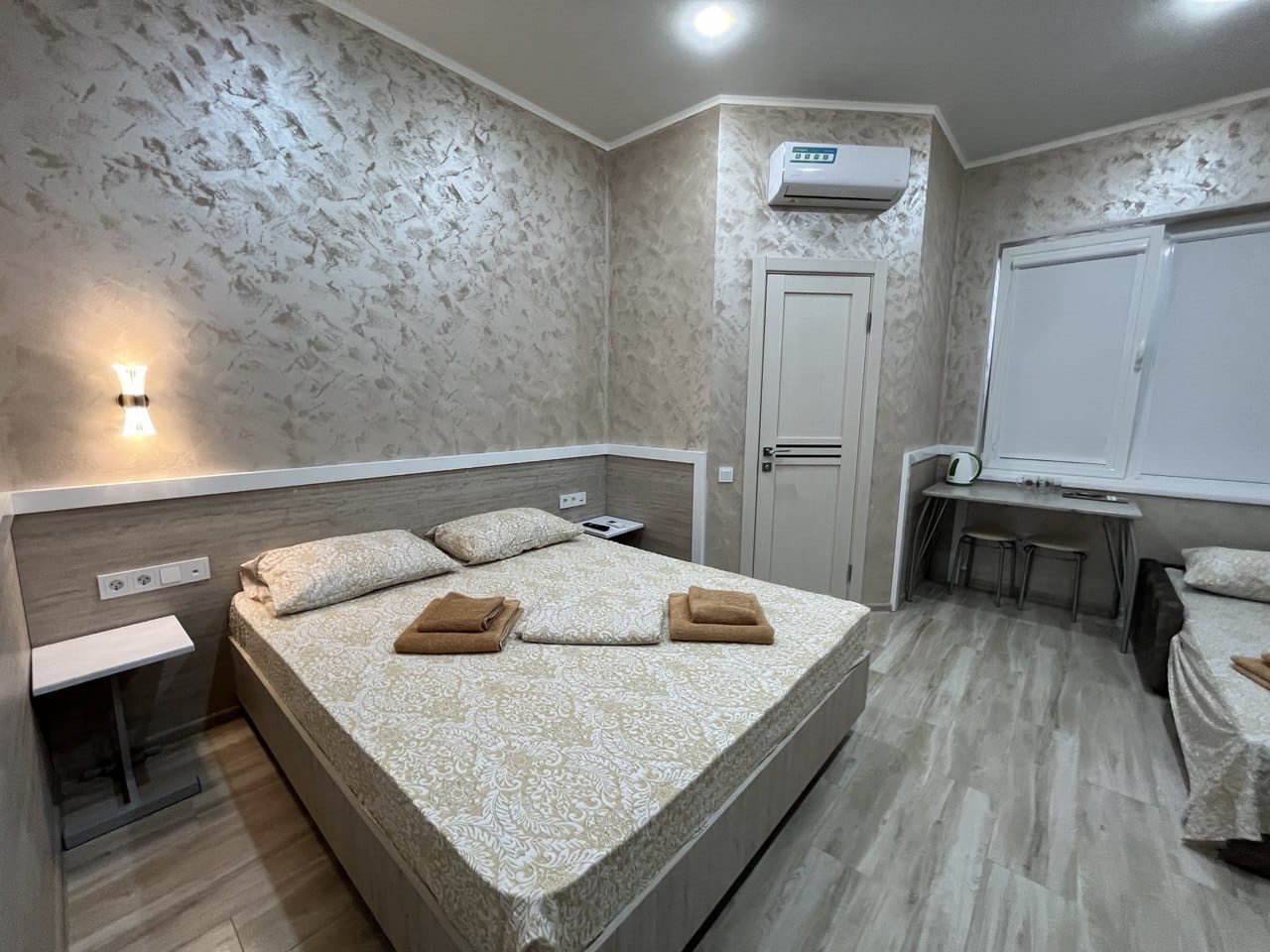 - Четырехместный (Стандартный четырехместный номер двуспальная кровать и двуспальный диван)