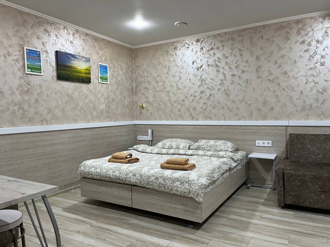 - Четырехместный (Стандартный четырехместный номер двуспальная кровать двуспальный диван и кресло кровать)