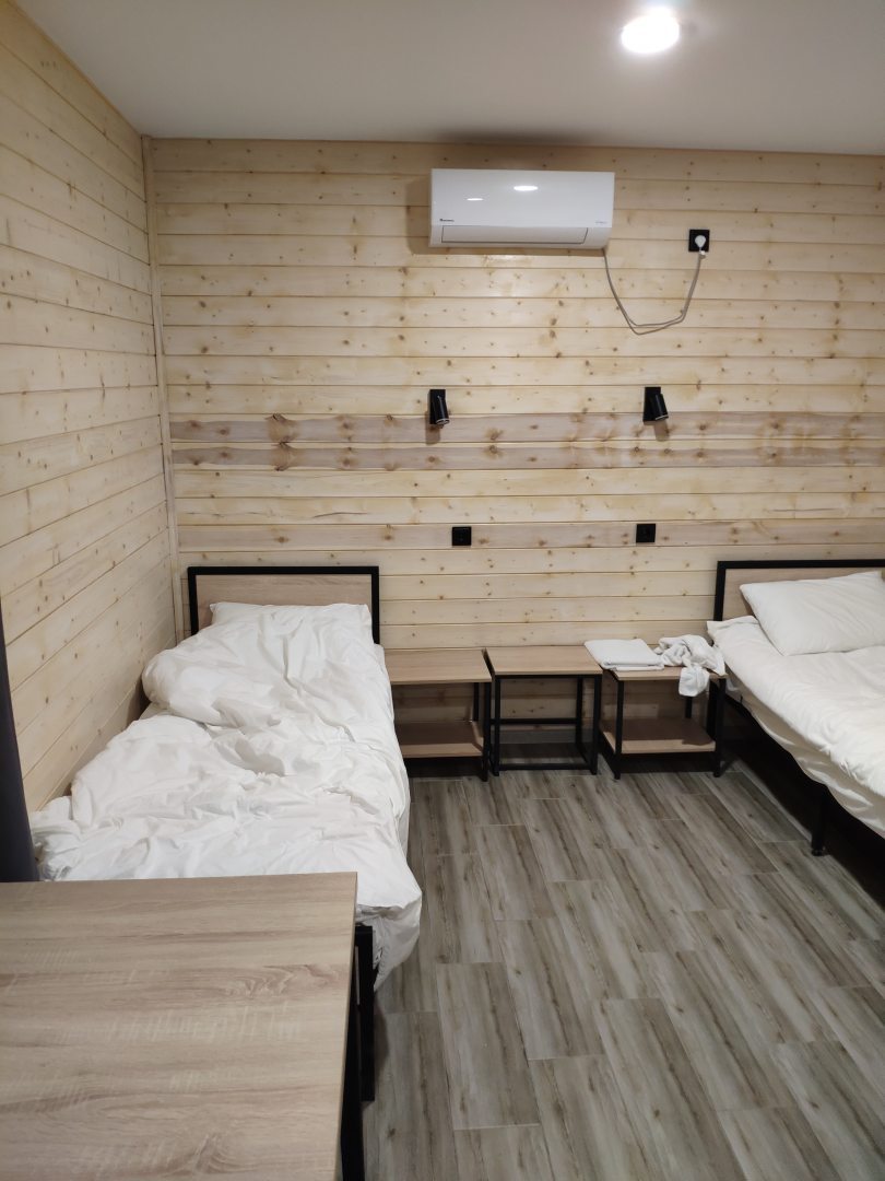 Внутри есть всё для качественного отдыха, включая мягкие кровати, комплект свежих полотенец и постельного белья, мягкий диван, телевидение, лампы, стеллаж с крючками для одежды, а также собственный санузел с душевой.