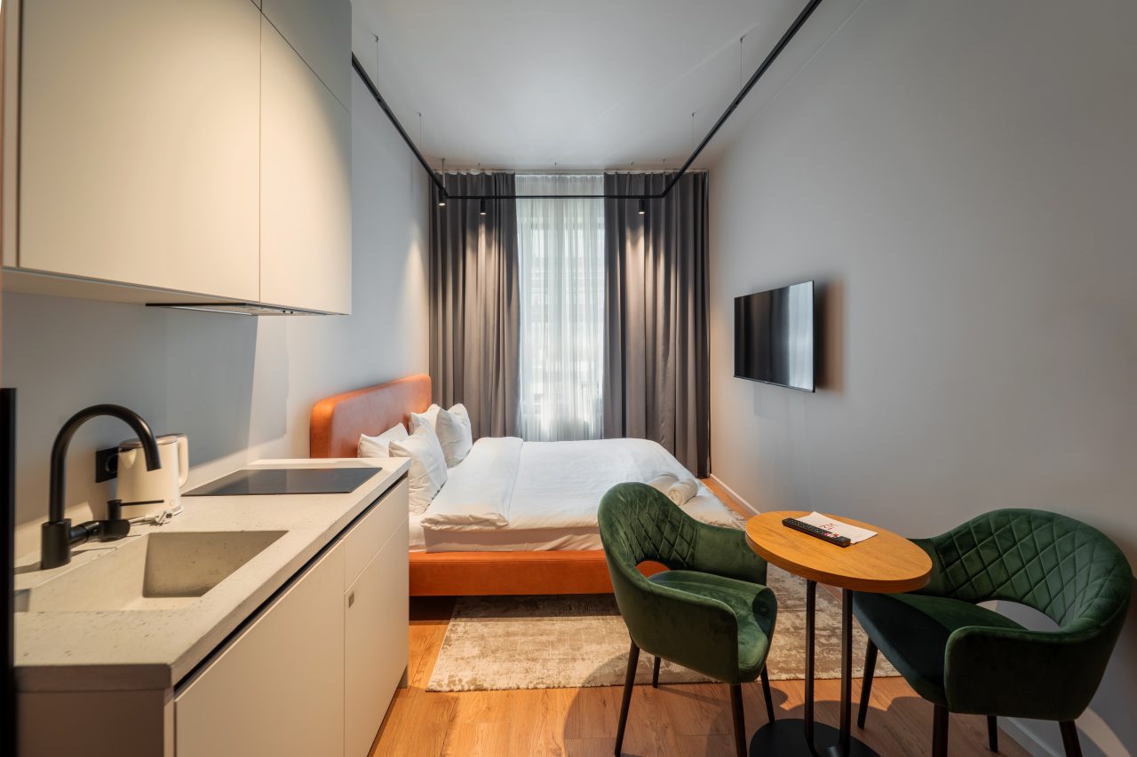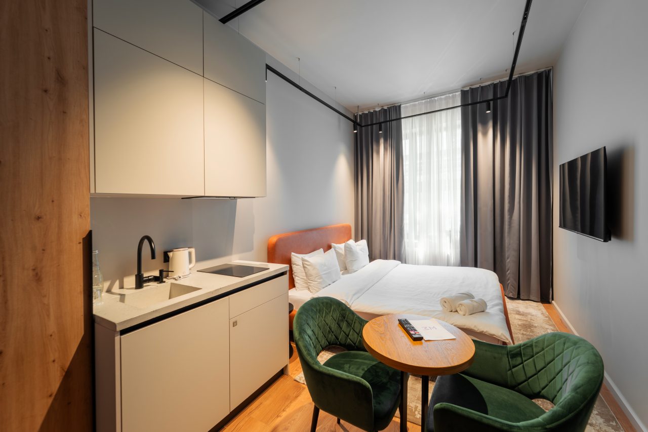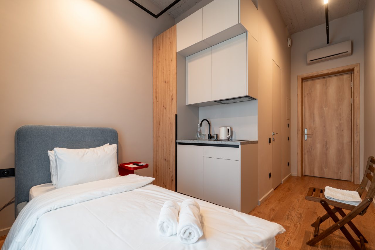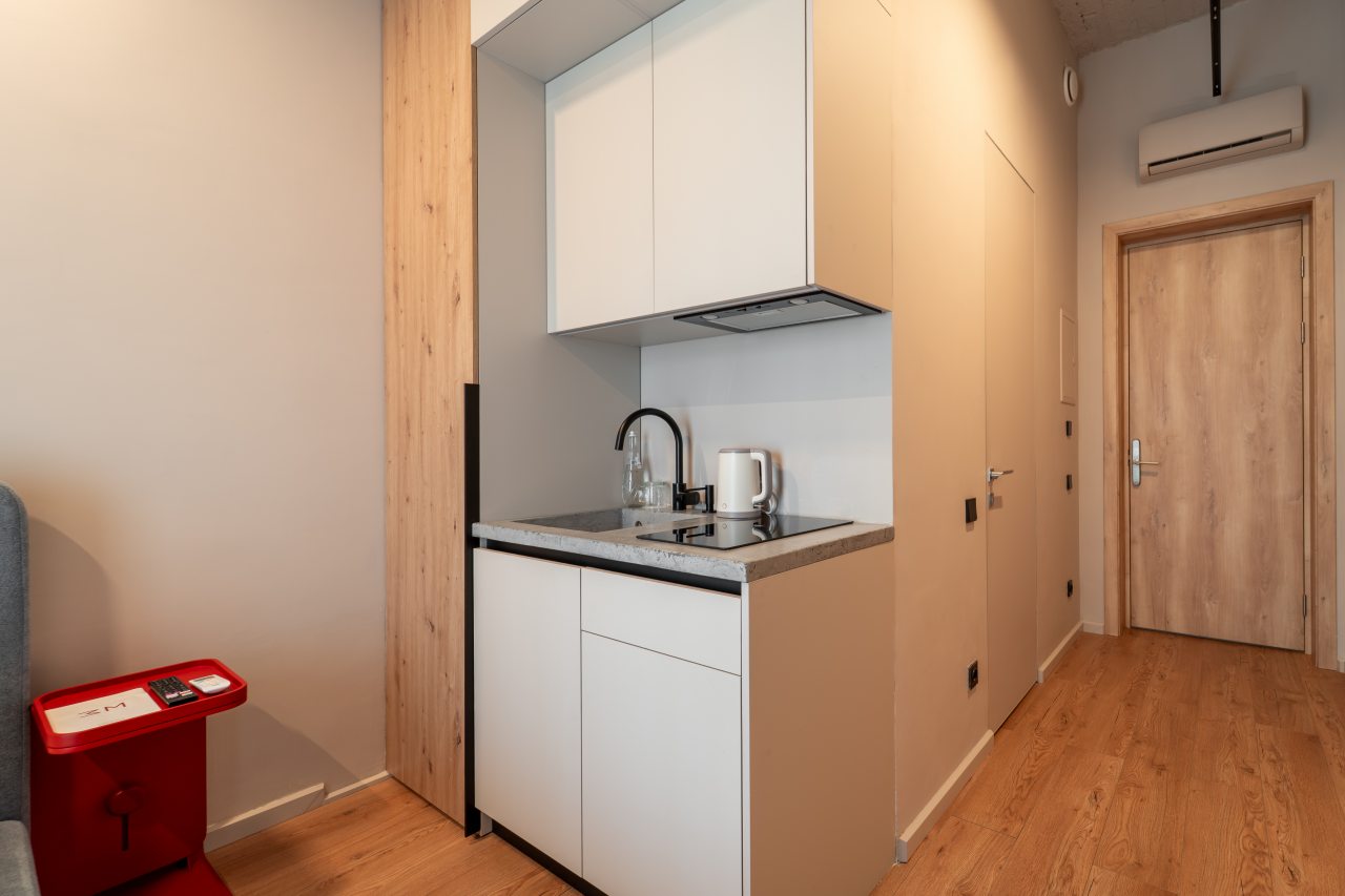 На компактной кухне есть все, чтобы вы могли в любое время побаловать себя любимым горячим напитком или перекусом. Варочная панель, чайник, встроенная вытяжка — к вашим услугам. Также при отеле работает ресторан, где вы можете попробовать изысканные блюда от шеф-поваров.