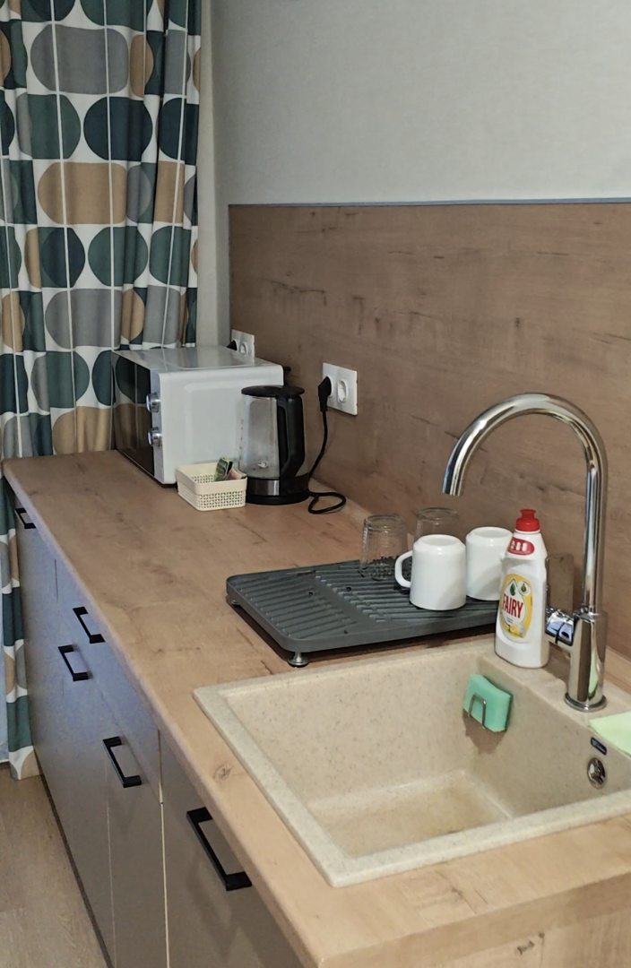 Очень понравились апартаменты. Есть все необходимое: микроволновка, плита, чайник. И даже стиральная машина. Номер небольшой, но для двух человек вполне комфортно.