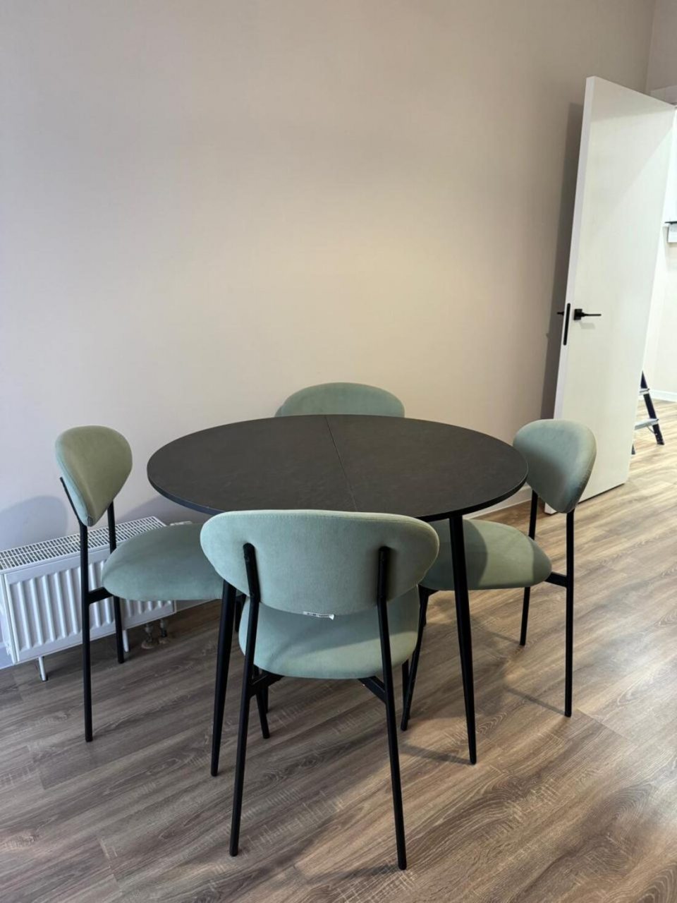 На современной кухне будет приятно готовить, так как в наличии варочная панель, СВЧ, красивая обеденная зона, чайник и холодильник.