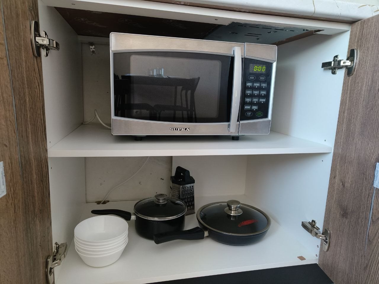 Кухня оснащена варочной панелью, холодильником, микроволновой печью, электрочайником, обеденным столом и набором посуды. Пообедать можно в ближайшем заведении.