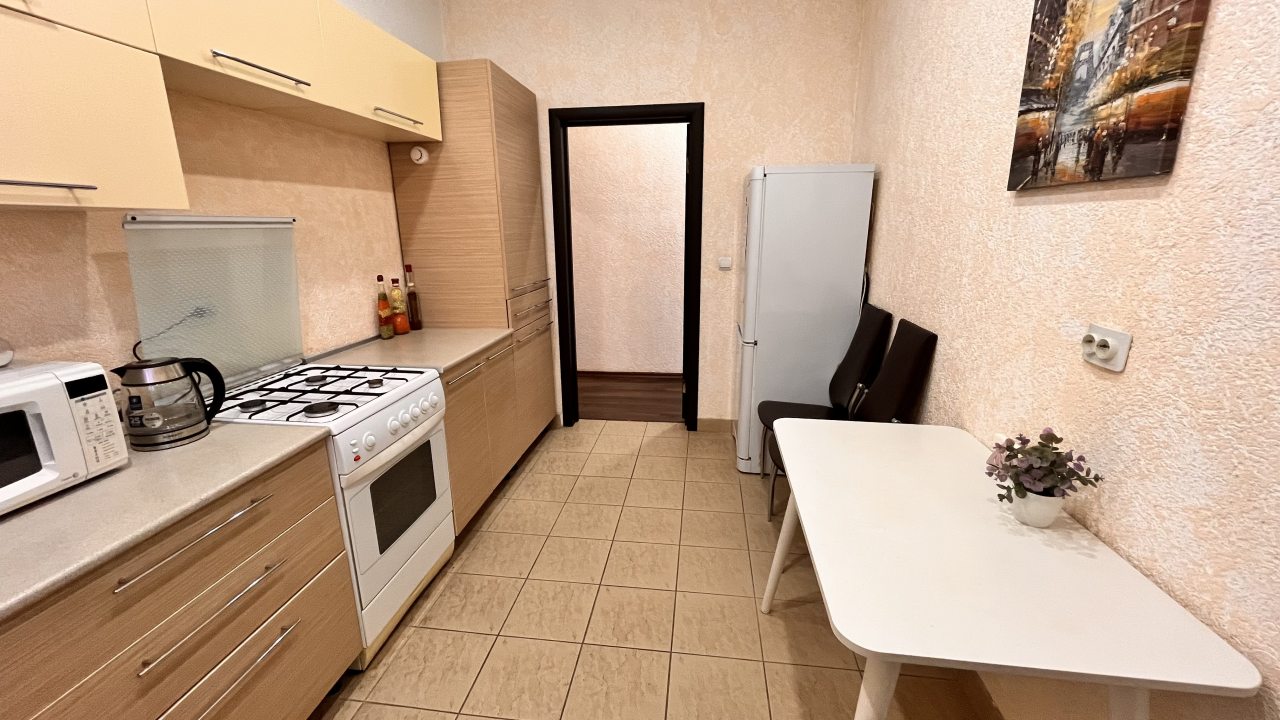 Оборудованная кухня подходит для самостоятельного приготовления блюд, так как там имеется бытовая техника, посуда и столовые приборы. Поблизости находится продуктовый магазин «Пятёрочка», чуть далее пиццерия «Папа Джонс».