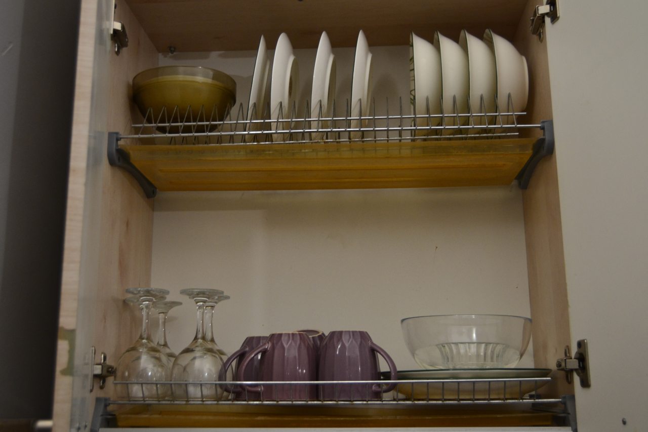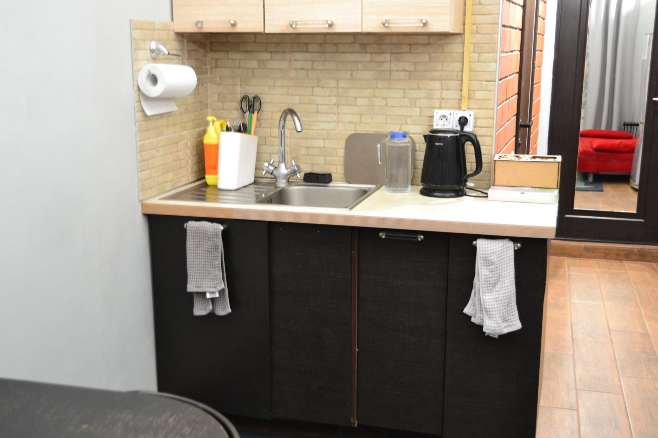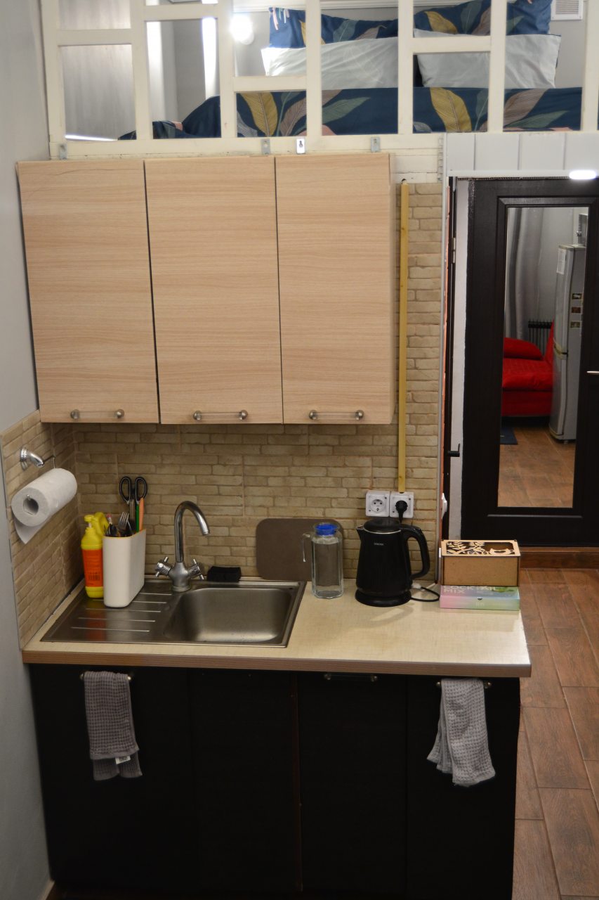 Мини-кухня оборудована гарнитуром с раковиной и холодильником, есть посуда и чайник, варочная панель.