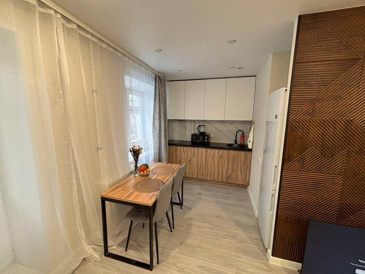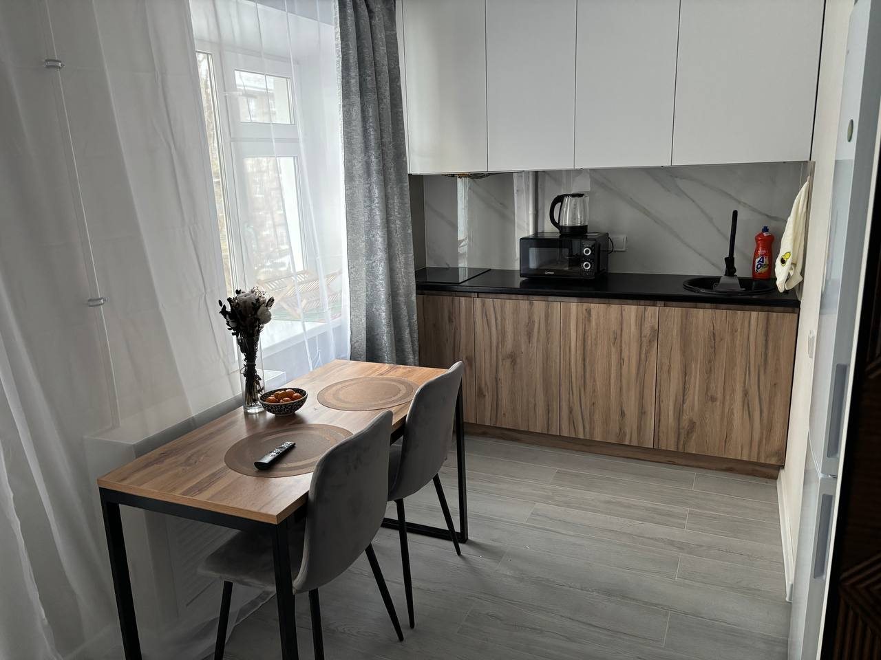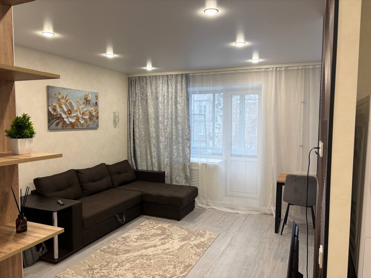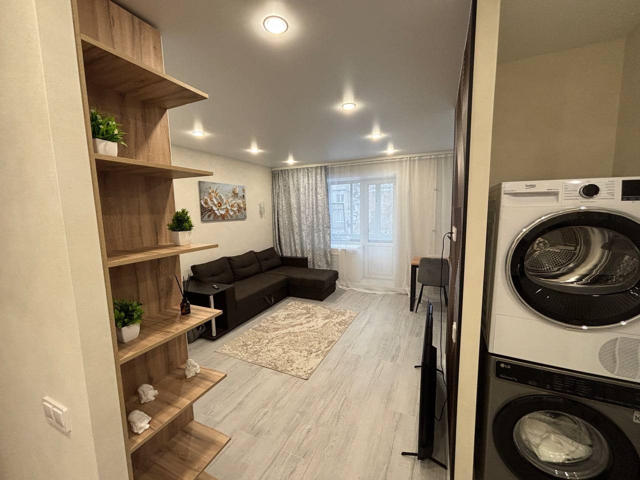 Стильные апартаменты с современным ремонтом укомплектованы двуспальной кроватью, диваном, большими окнами, розетками возле спального места, небольшой рабочей зоной с письменным столом, шкафом и др. Санузел оборудован комплектом качественной сантехники, стиральной машиной. Доступна точка wi-fi.