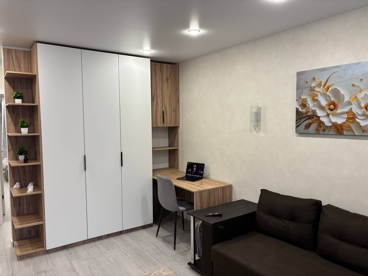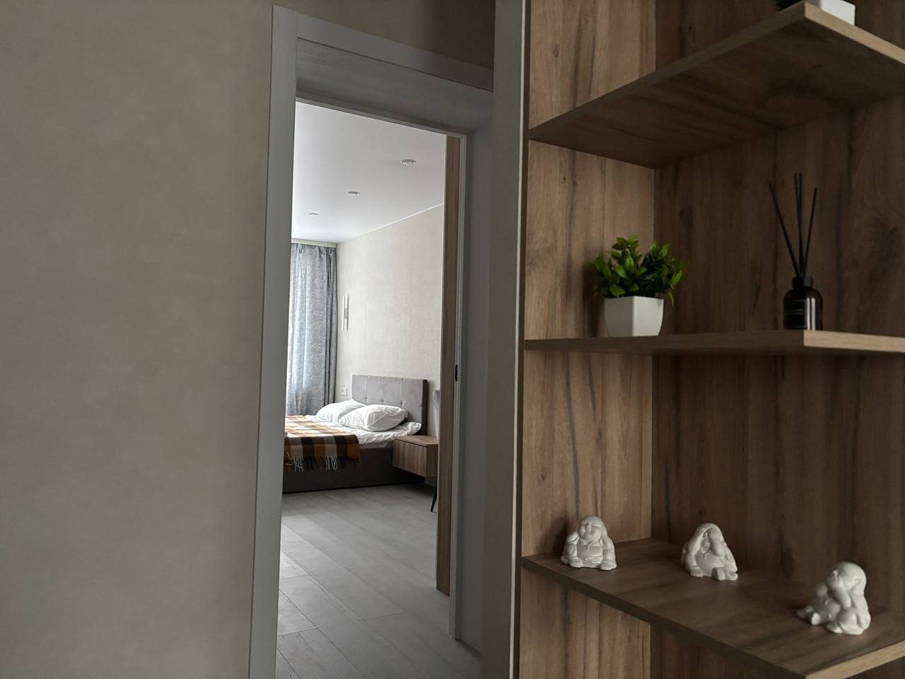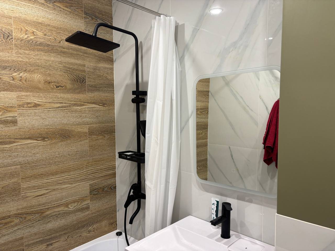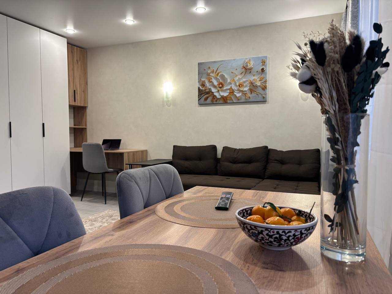 Стильные апартаменты с современным ремонтом укомплектованы двуспальной кроватью, диваном, большими окнами, розетками возле спального места, небольшой рабочей зоной с письменным столом, шкафом и др. Санузел оборудован комплектом качественной сантехники, стиральной машиной. Доступна точка wi-fi.