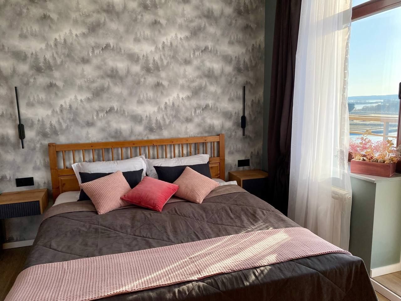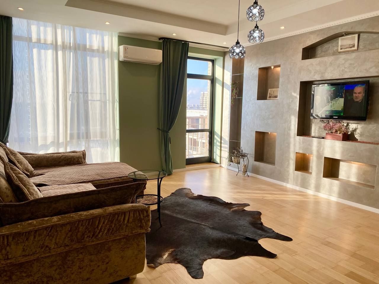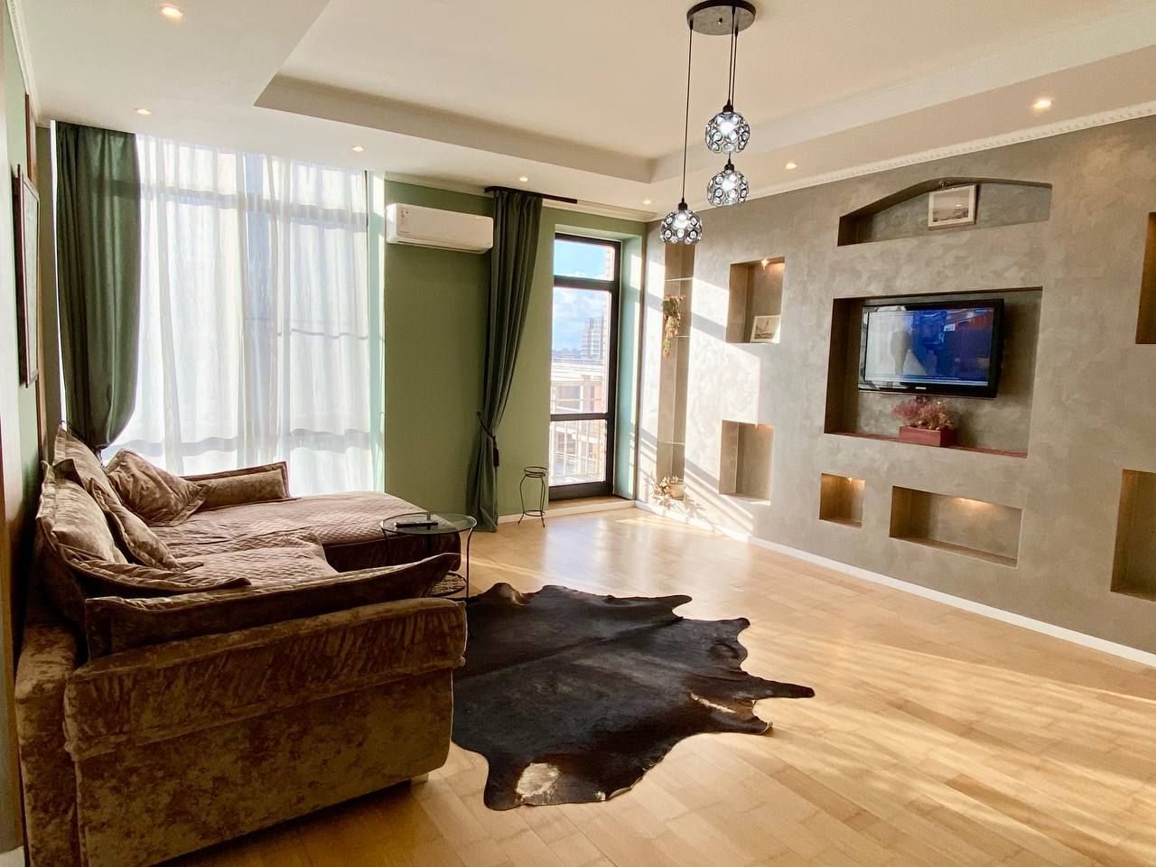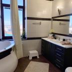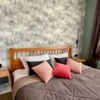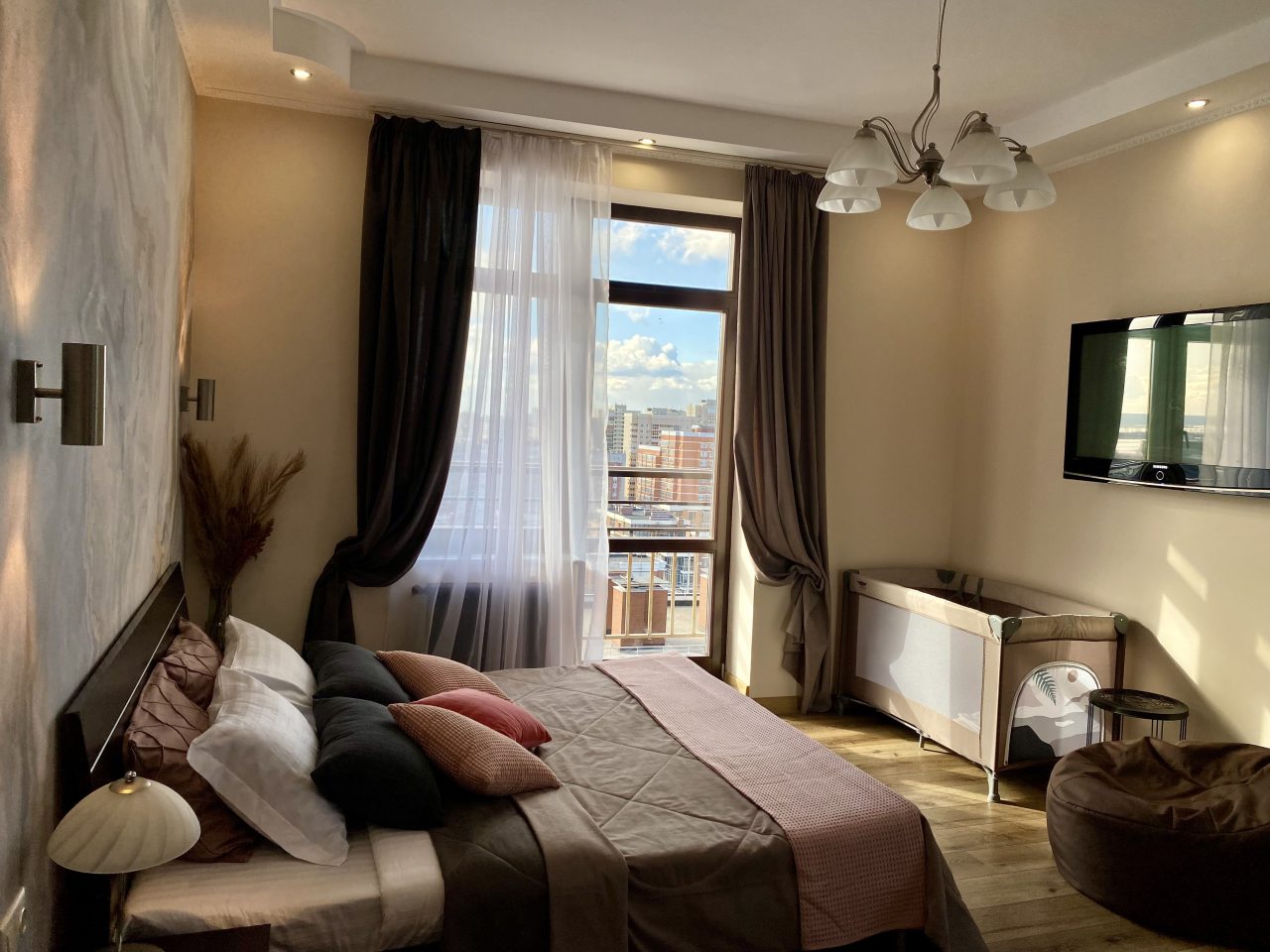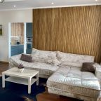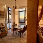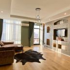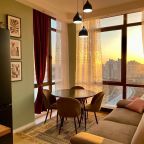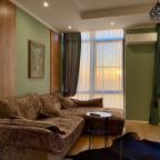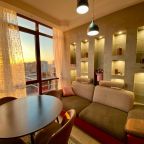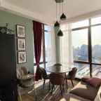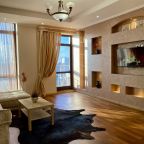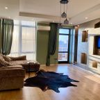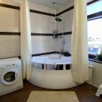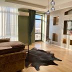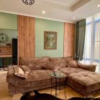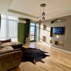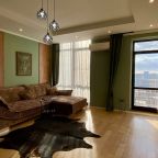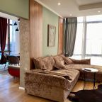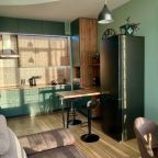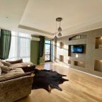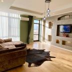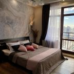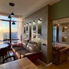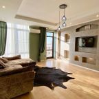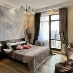 Апартаменты со стильным и необычным дизайном обустроены удобной мебелью и техникой: гостиная с большим диваном и телевизором, спальня с двуспальной кроватью, просторная ванная комната с джакузи, стиральная машина, Wi-Fi, панорамные окна с красивым видом.