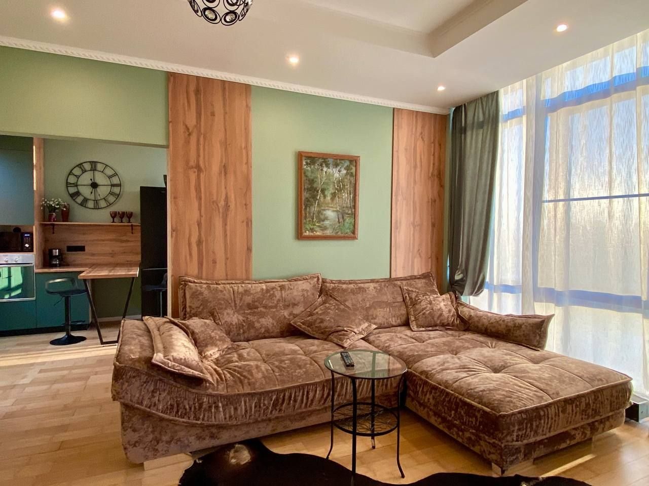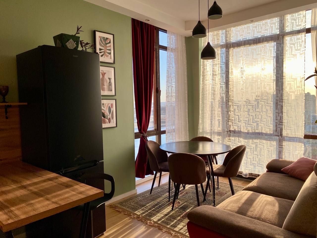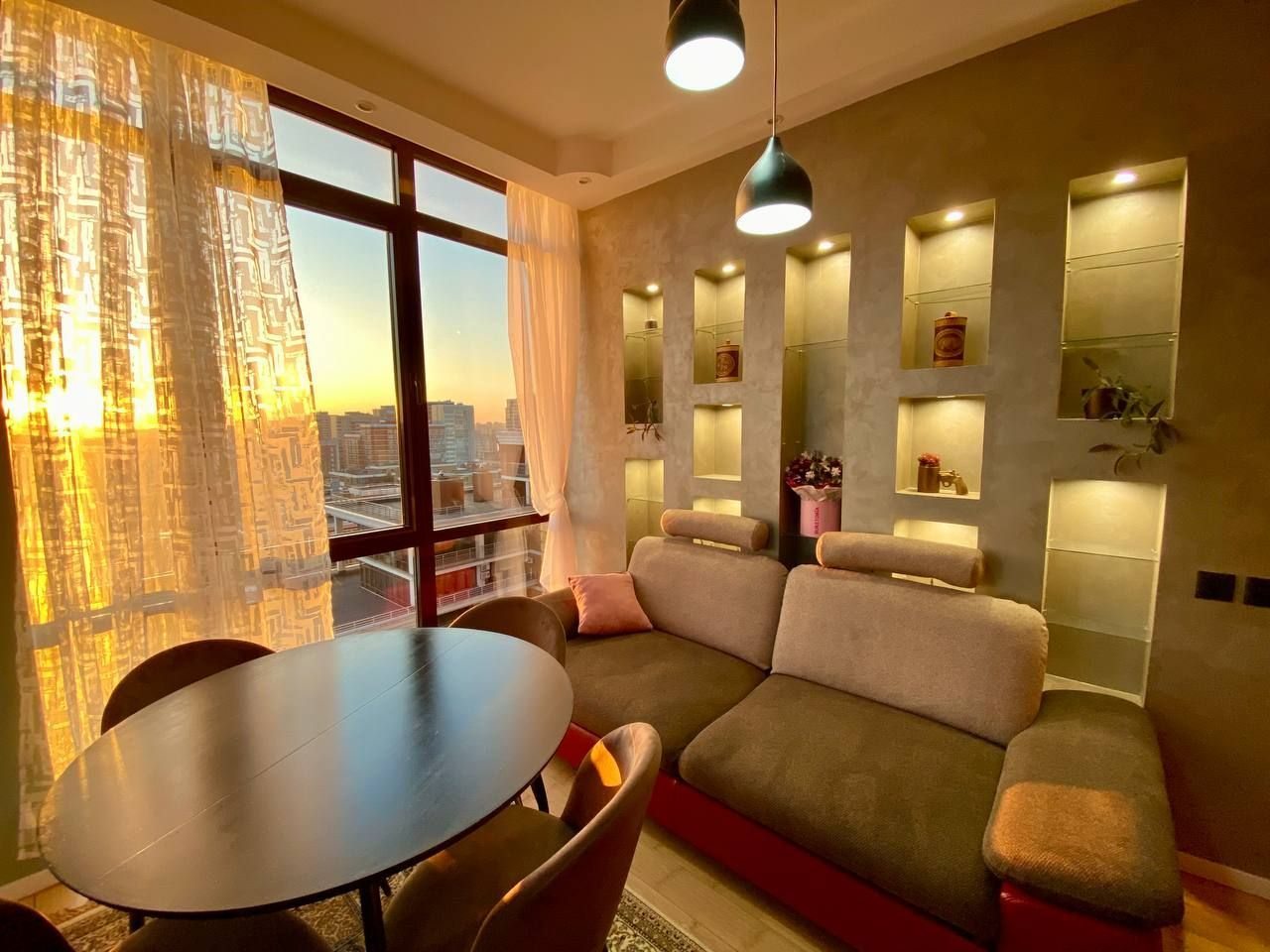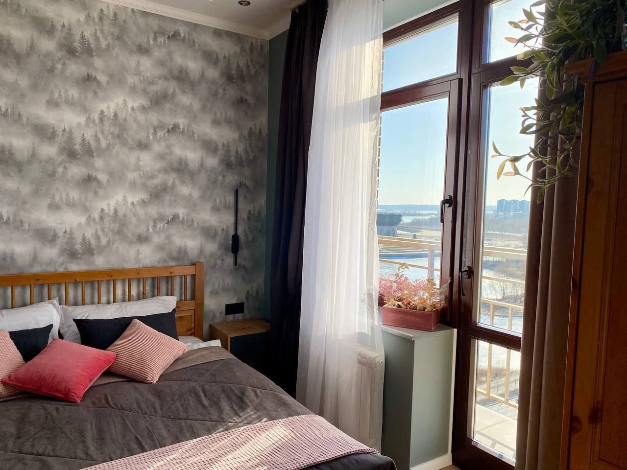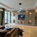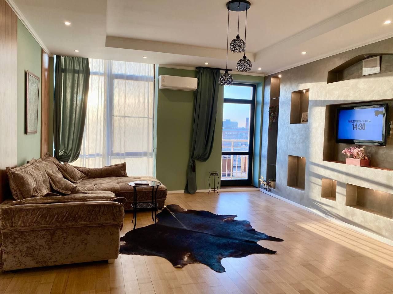 Апартаменты со стильным и необычным дизайном обустроены удобной мебелью и техникой: гостиная с большим диваном и телевизором, спальня с двуспальной кроватью, просторная ванная комната с джакузи, стиральная машина, Wi-Fi, панорамные окна с красивым видом.