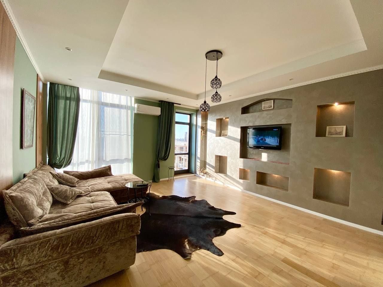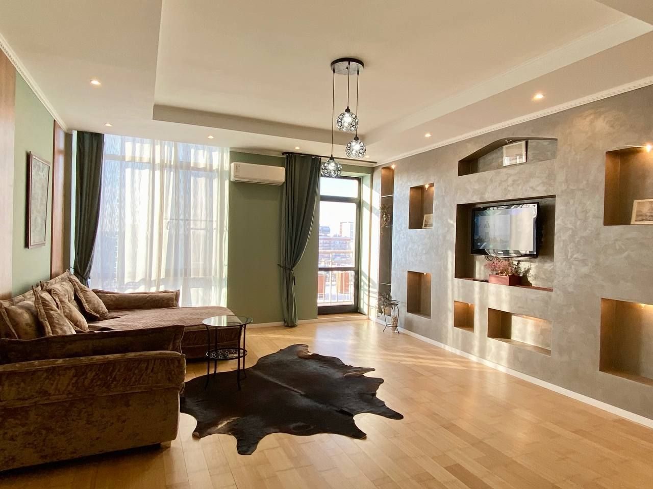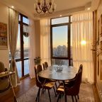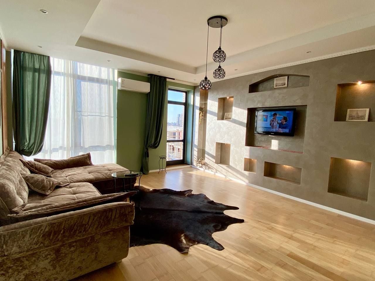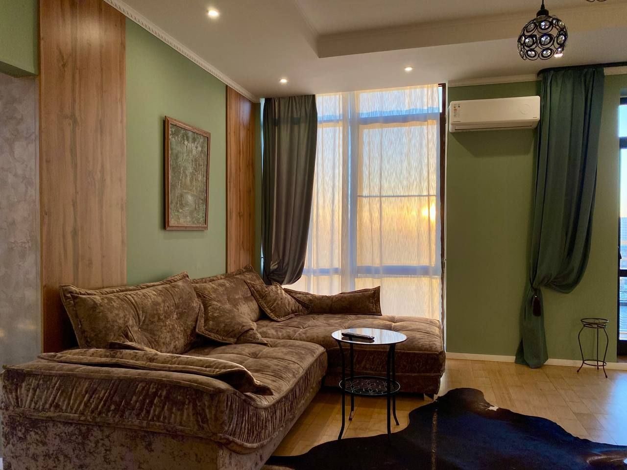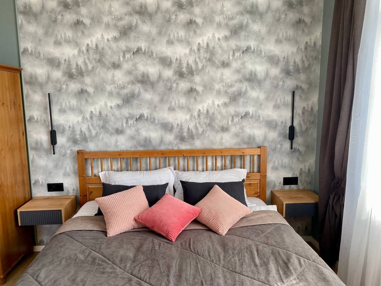 Апартаменты со стильным и необычным дизайном обустроены удобной мебелью и техникой: гостиная с большим диваном и телевизором, спальня с двуспальной кроватью, просторная ванная комната с джакузи, стиральная машина, Wi-Fi, панорамные окна с красивым видом.