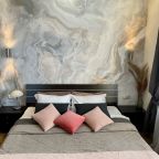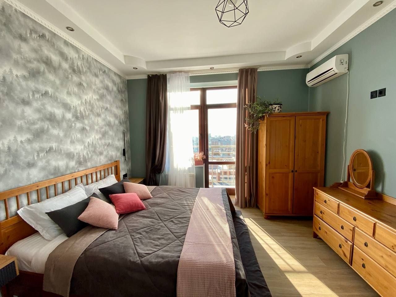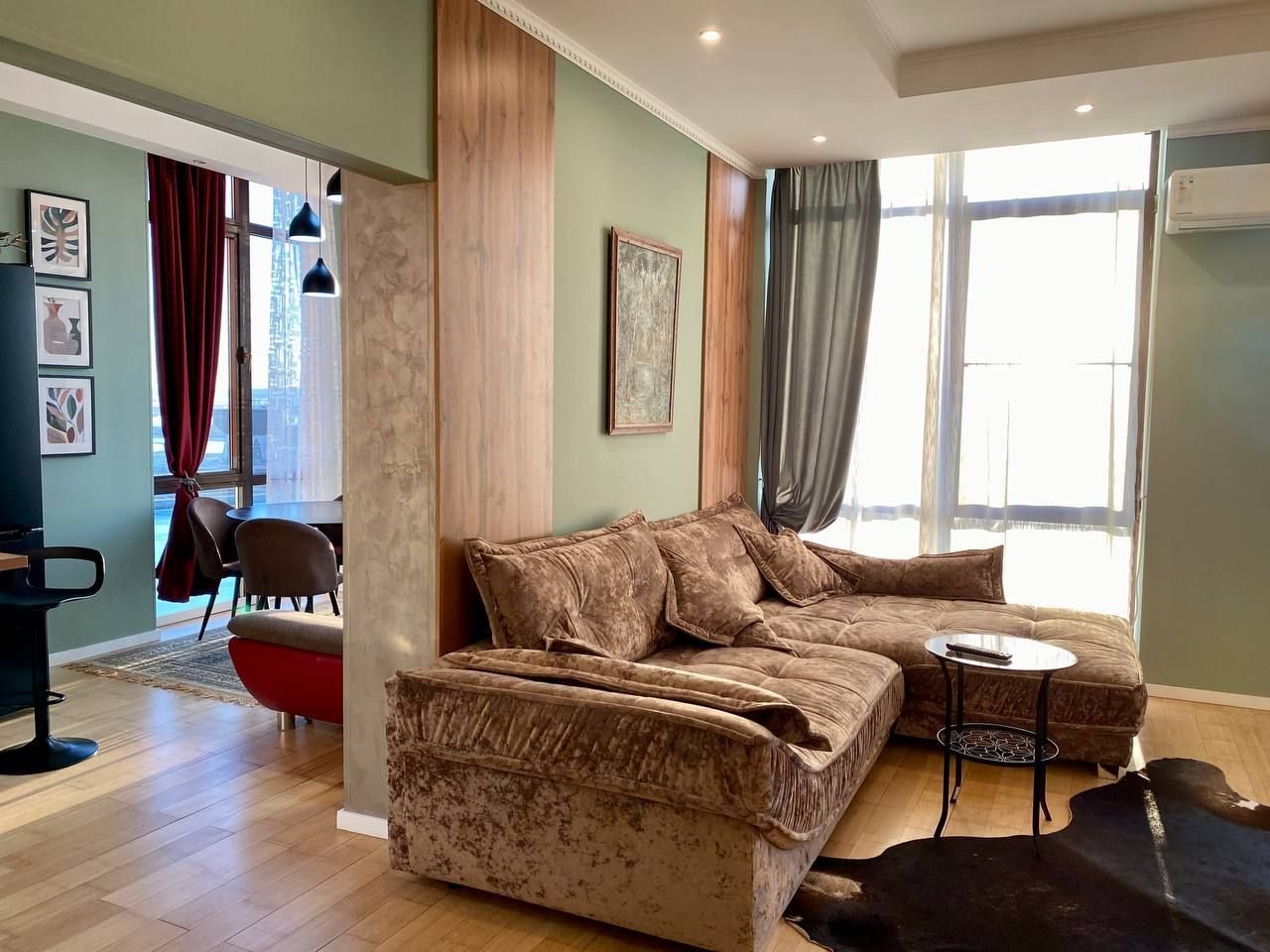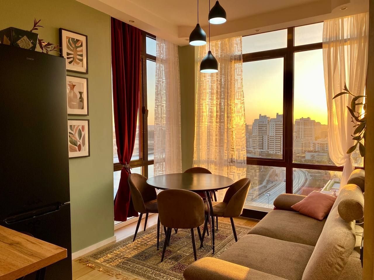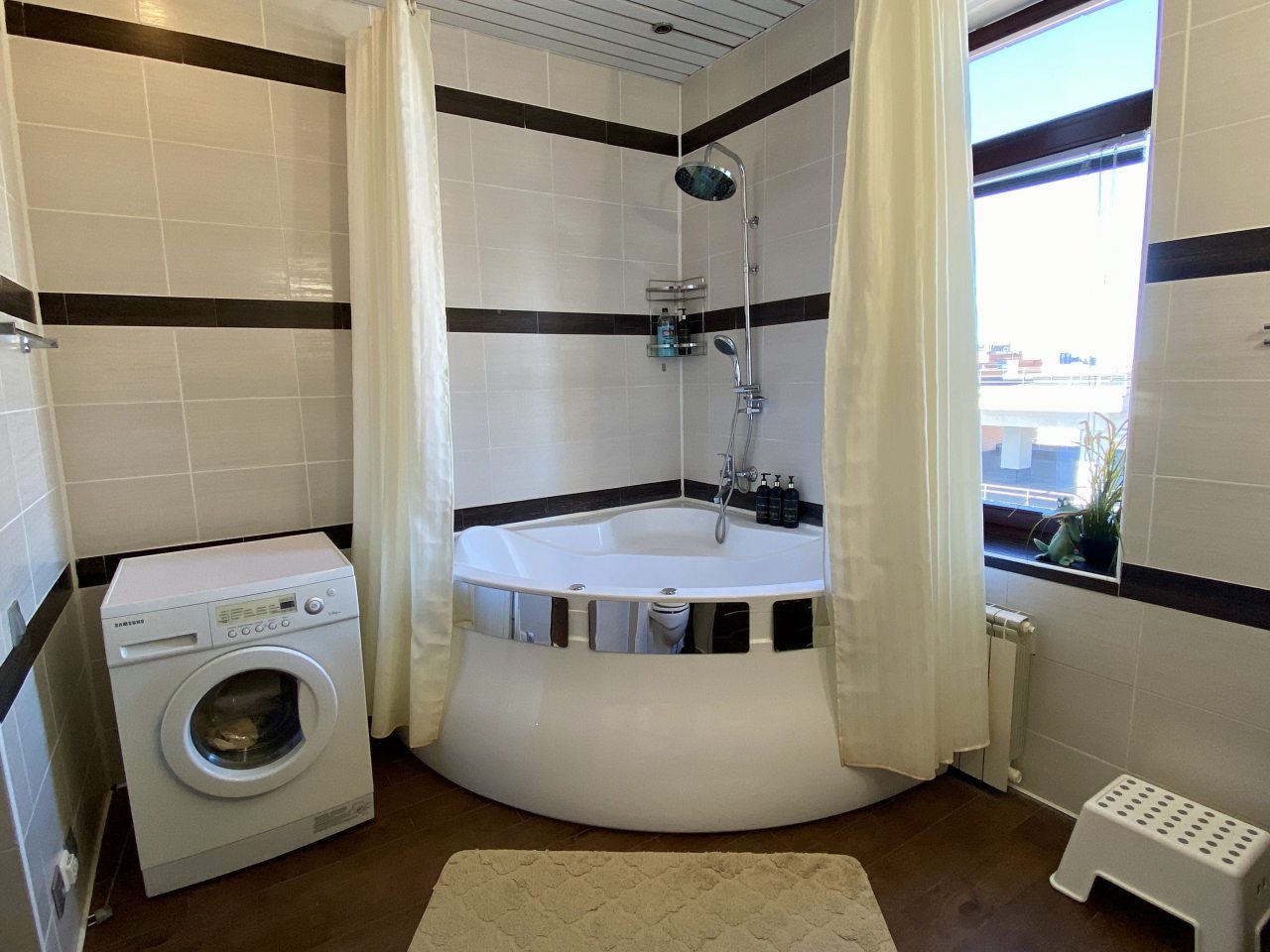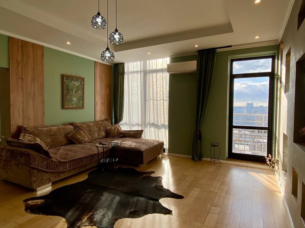 Апартаменты со стильным и необычным дизайном обустроены удобной мебелью и техникой: гостиная с большим диваном и телевизором, спальня с двуспальной кроватью, просторная ванная комната с джакузи, стиральная машина, Wi-Fi, панорамные окна с красивым видом.