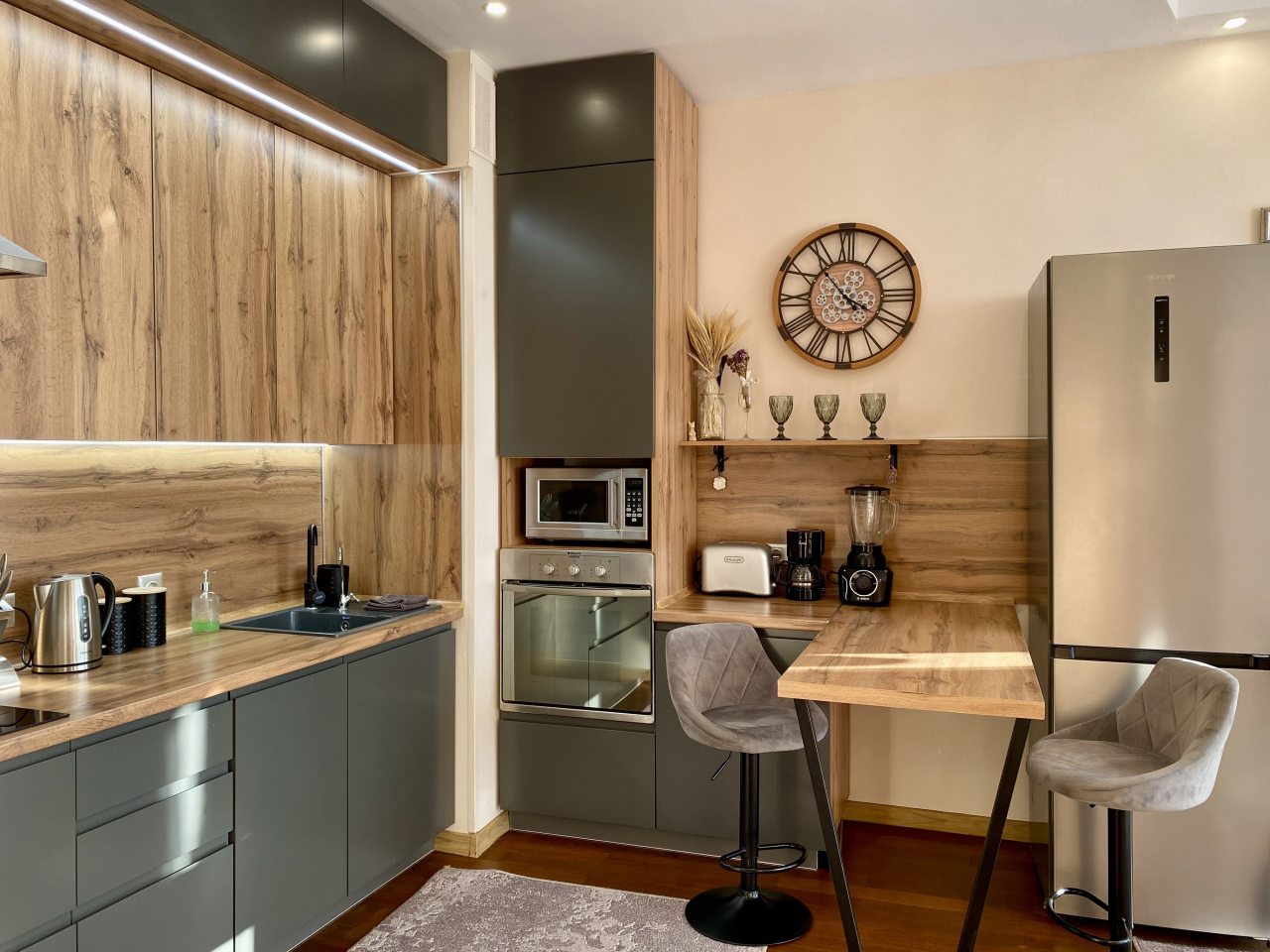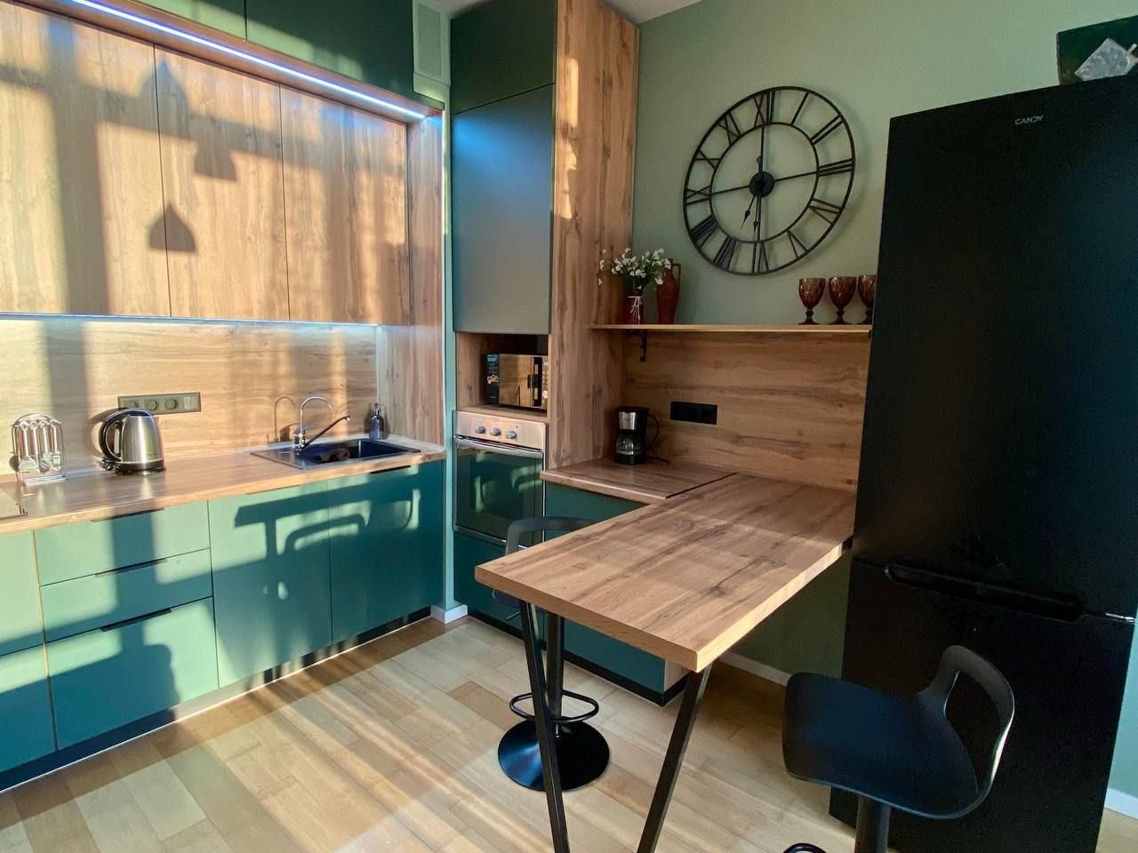 На кухне установлена необходимая бытовая техника, имеется посуда и столовые приборы. В округе работает множество разнообразных ресторанов и кафе.