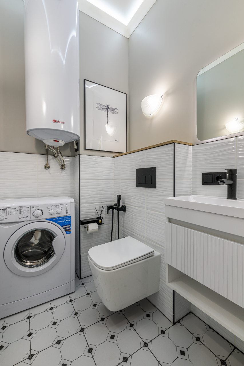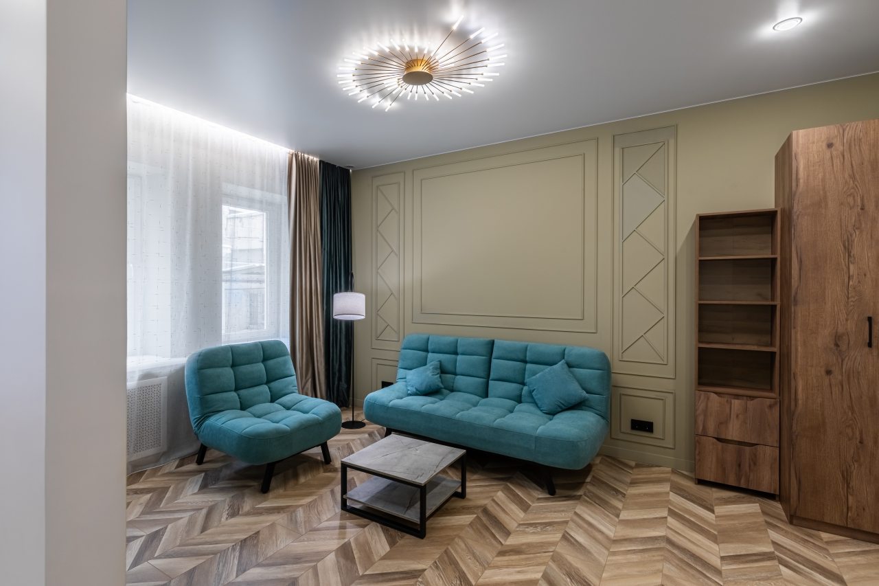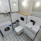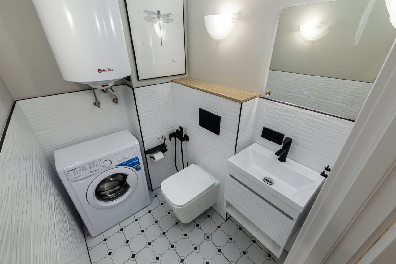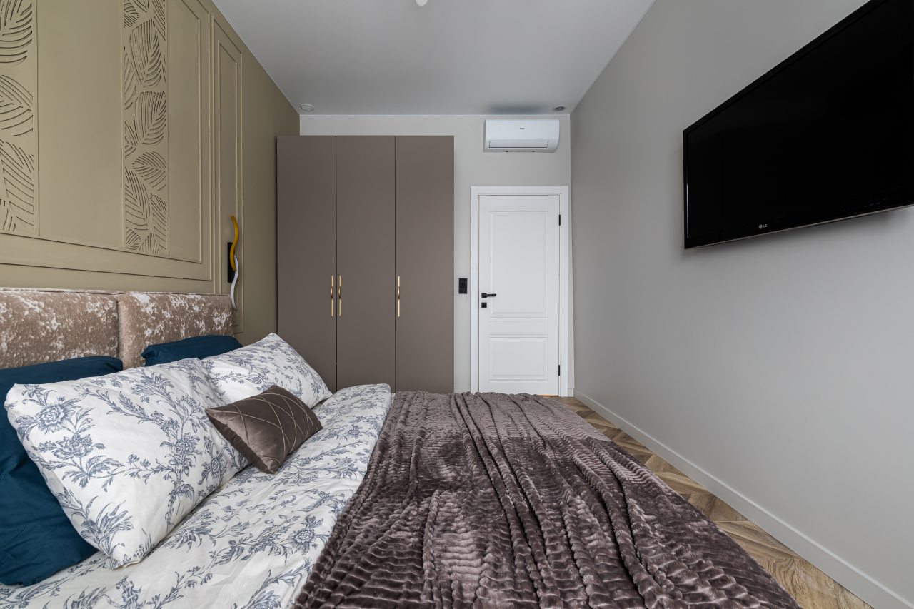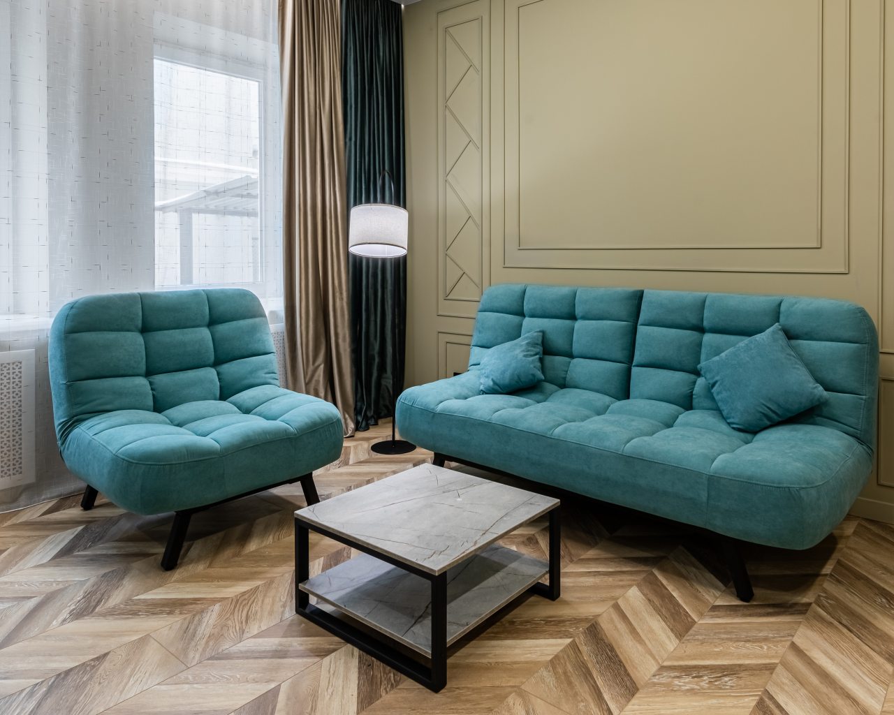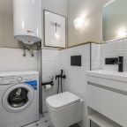 Помимо стильного и современного интерьера, внутри вас также ожидает качественная мебель и техника, в том числе двуспальная кровать с удобным матрасом, настенные светильники для уютного вечернего света, вместительные шкафы, мягкий диван и кресло в гостиной, телевизор, а также ванная комната со стиральной машиной.