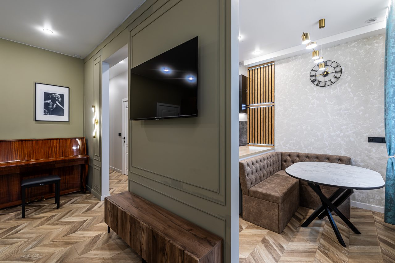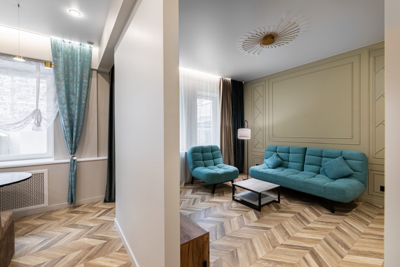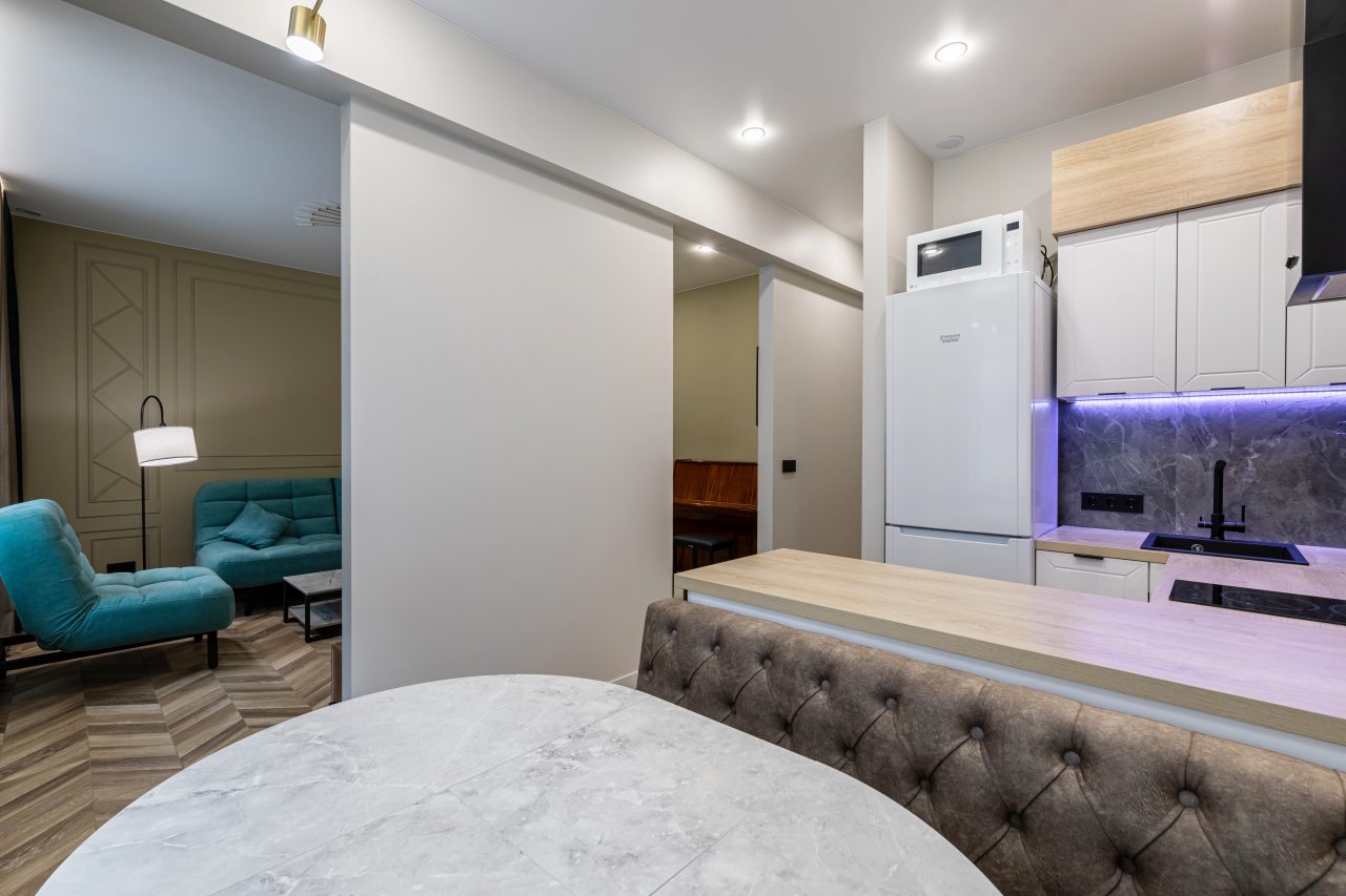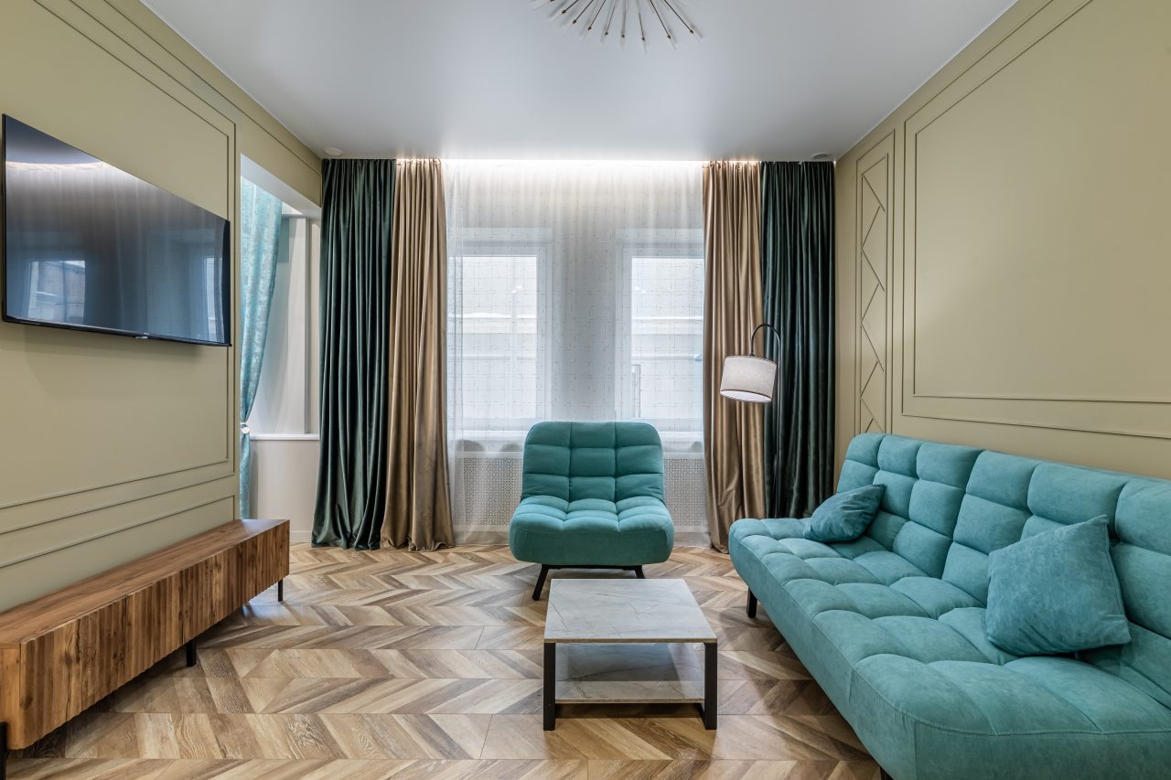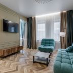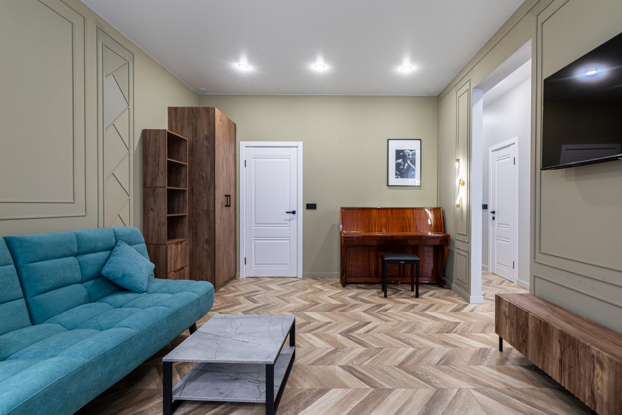 Помимо стильного и современного интерьера, внутри вас также ожидает качественная мебель и техника, в том числе двуспальная кровать с удобным матрасом, настенные светильники для уютного вечернего света, вместительные шкафы, мягкий диван и кресло в гостиной, телевизор, а также ванная комната со стиральной машиной.