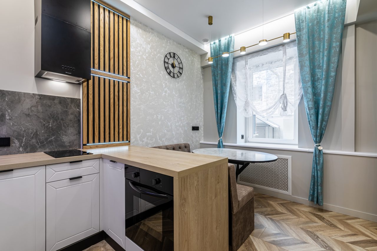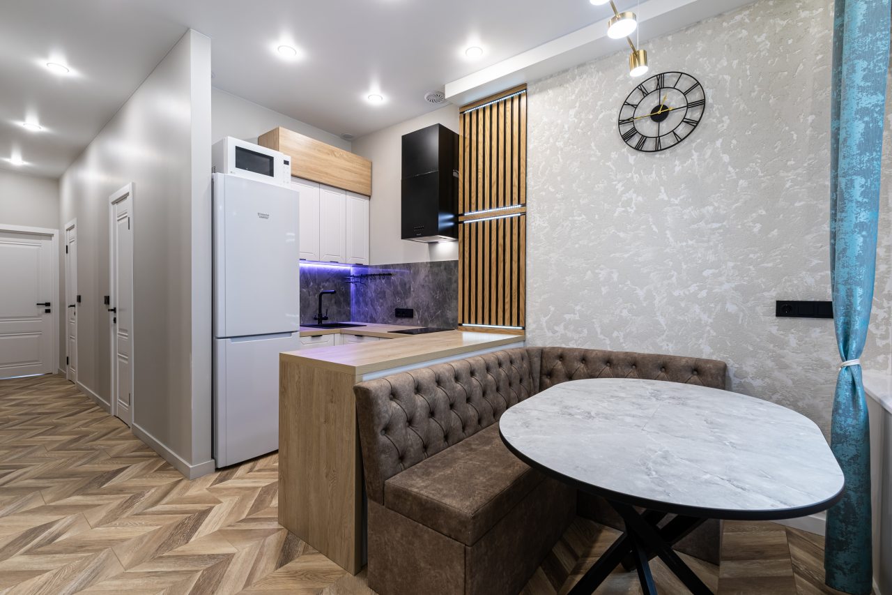 Для приготовления любимой домашней еды и напитков предусмотрена кухня с красивой обеденной зоной, холодильником, плитой, чайником, СВЧ-печью и духовым шкафом.