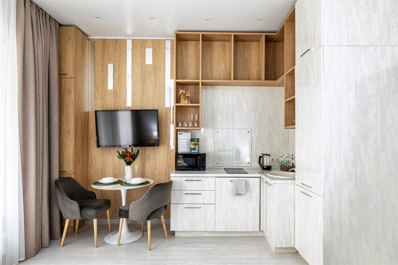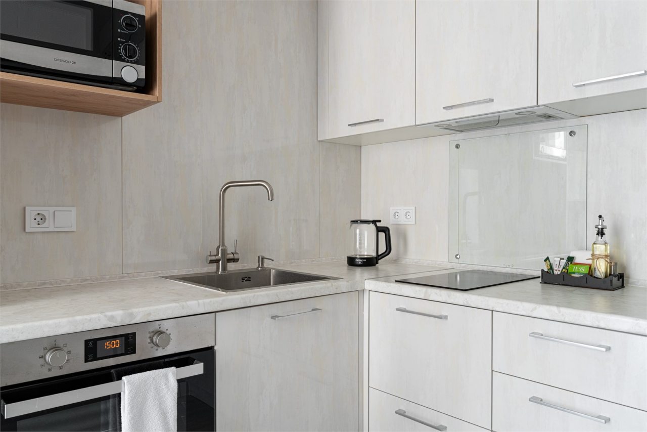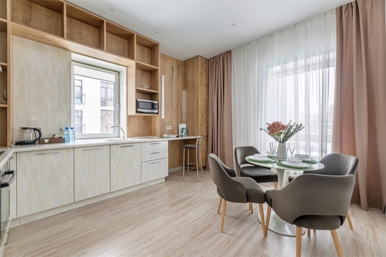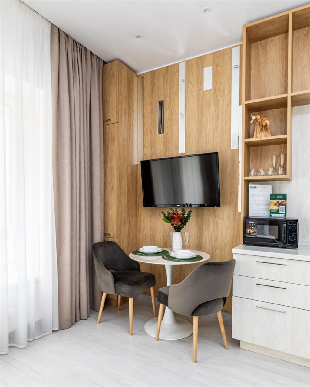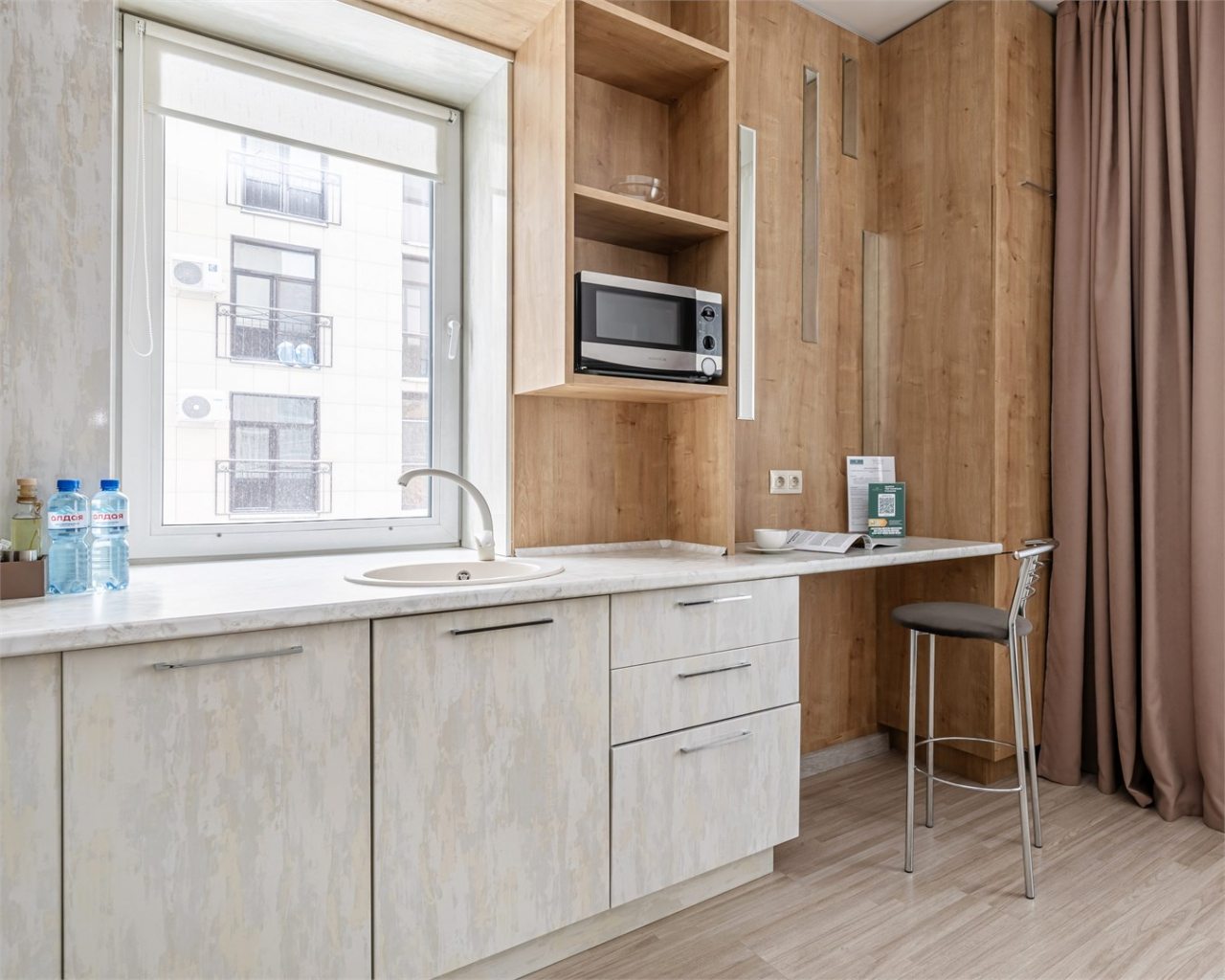 Кухня укомплектована посудой, обеденной зоной и бытовой техникой для самостоятельной организации питания.