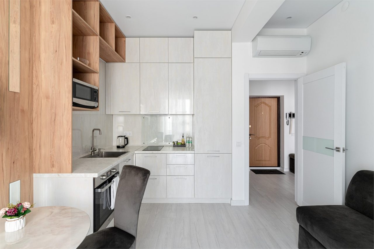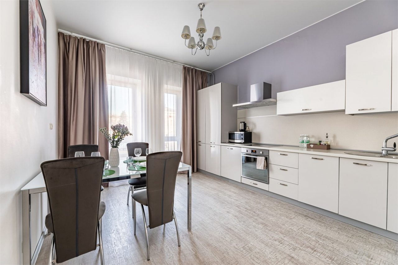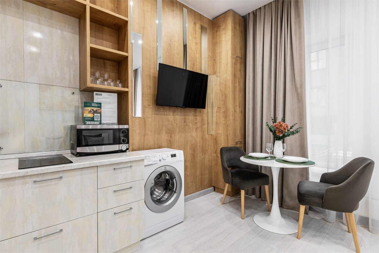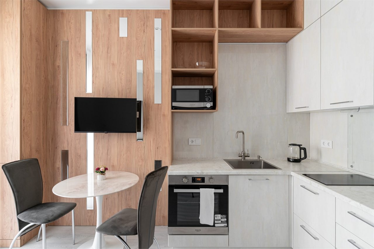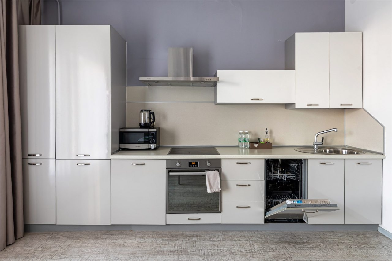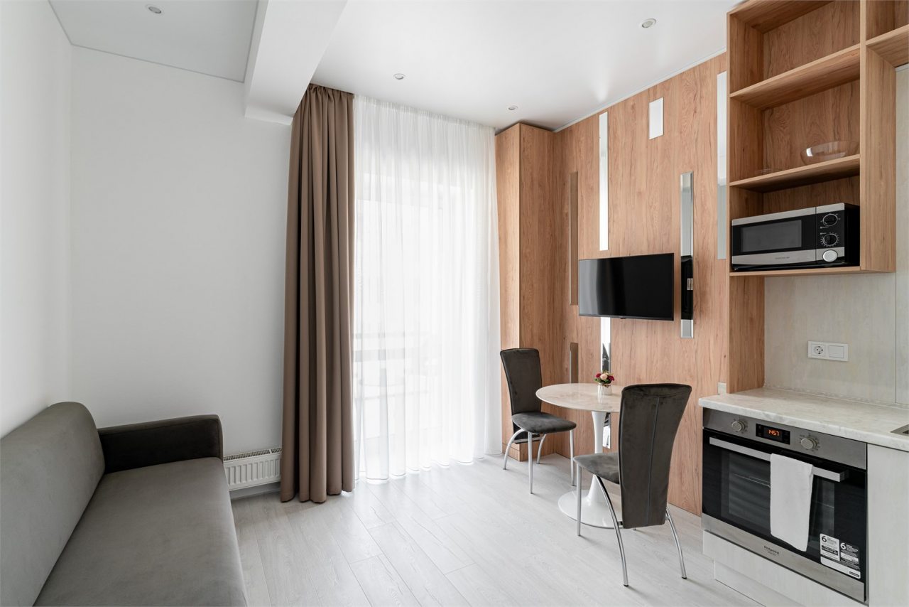 Кухня укомплектована посудой, обеденной зоной и бытовой техникой для самостоятельной организации питания.