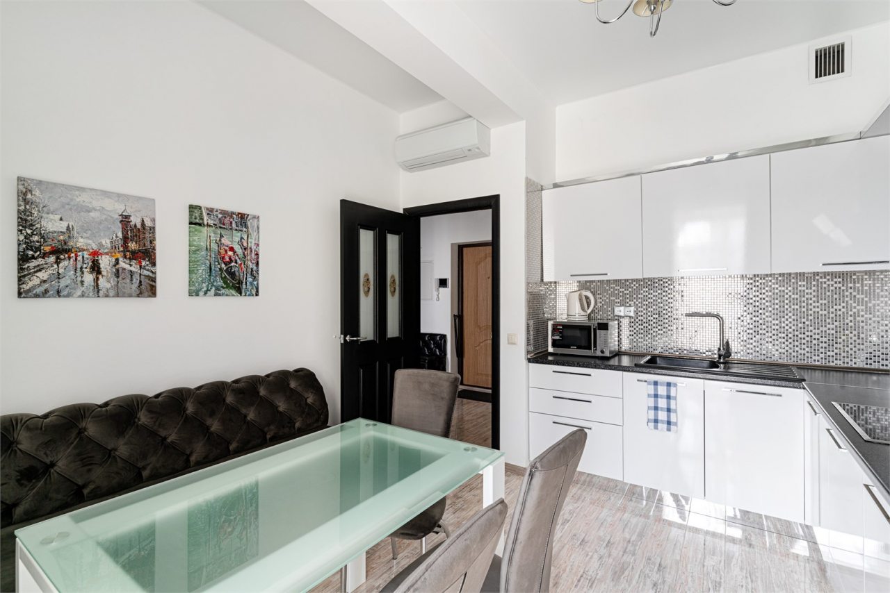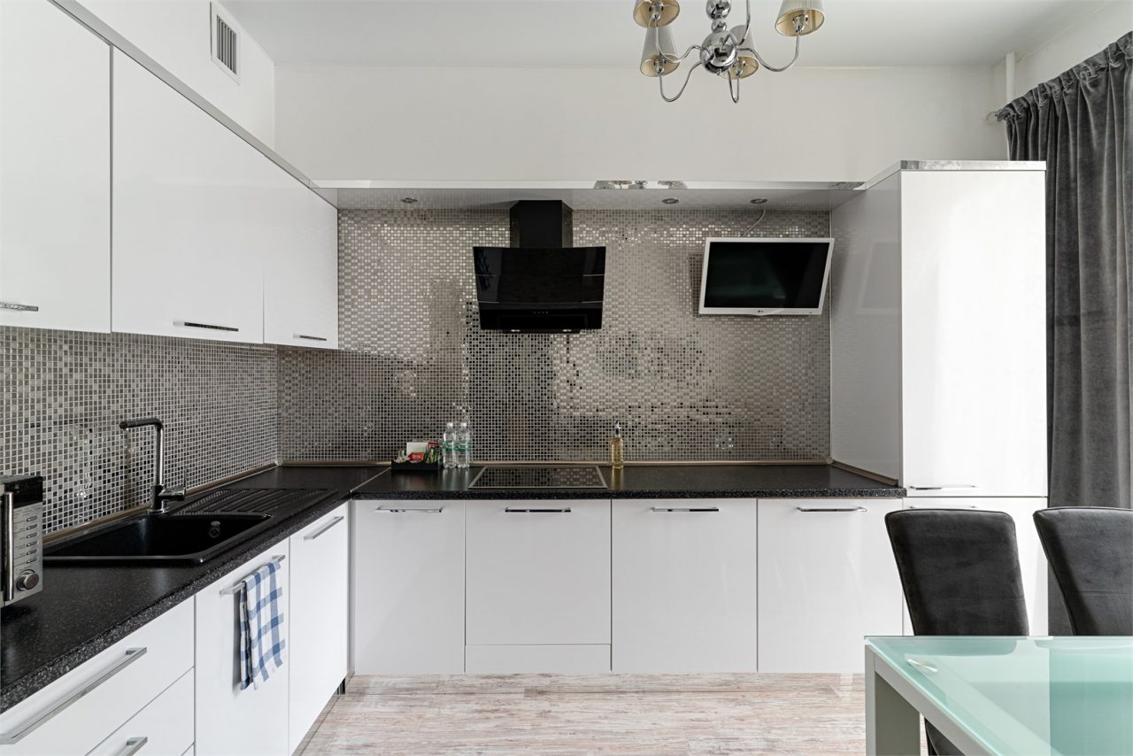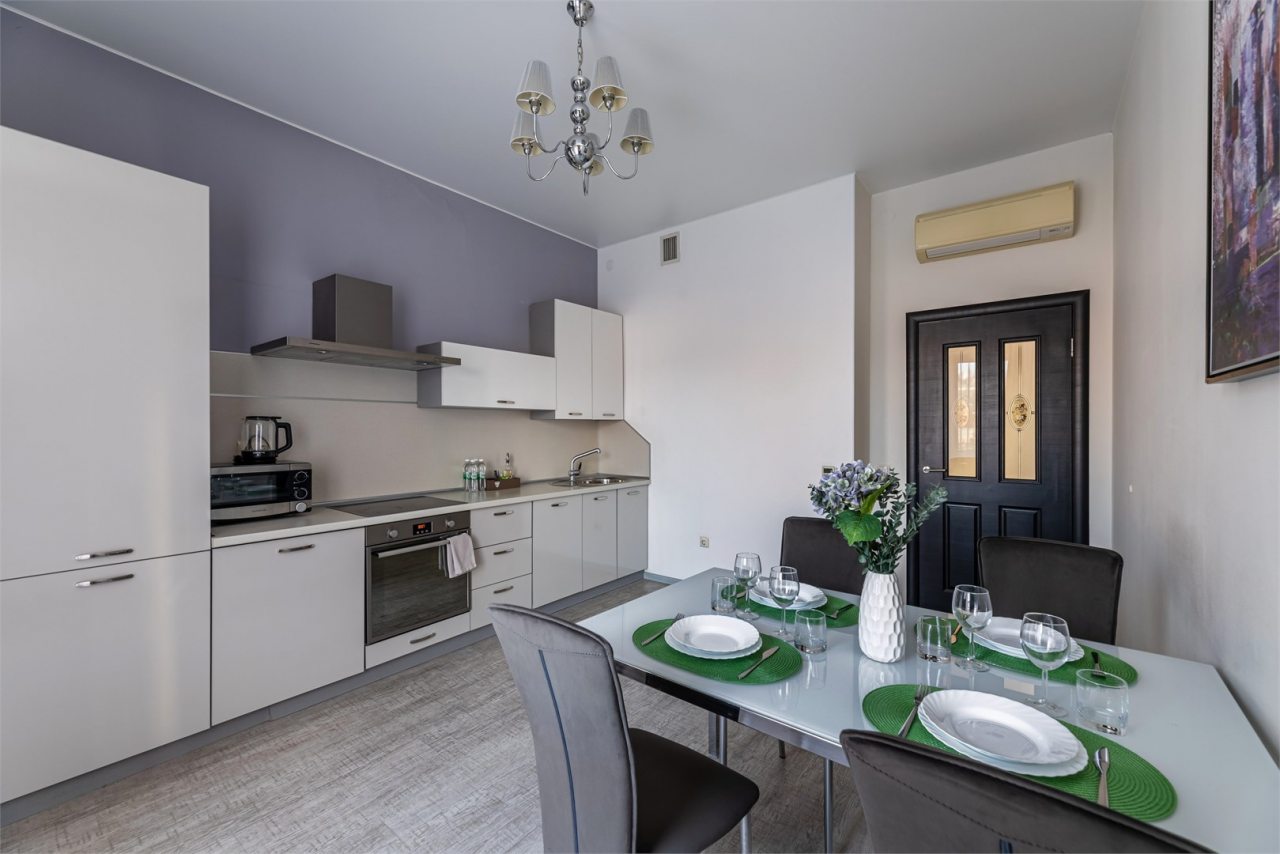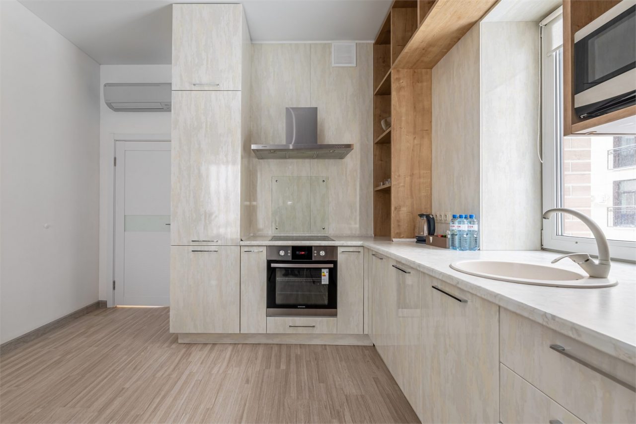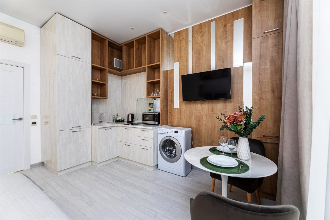 Кухня укомплектована посудой, обеденной зоной и бытовой техникой для самостоятельной организации питания.