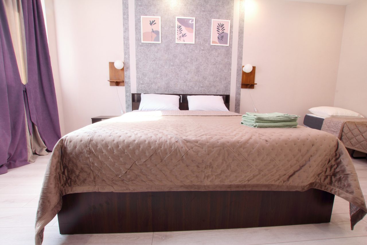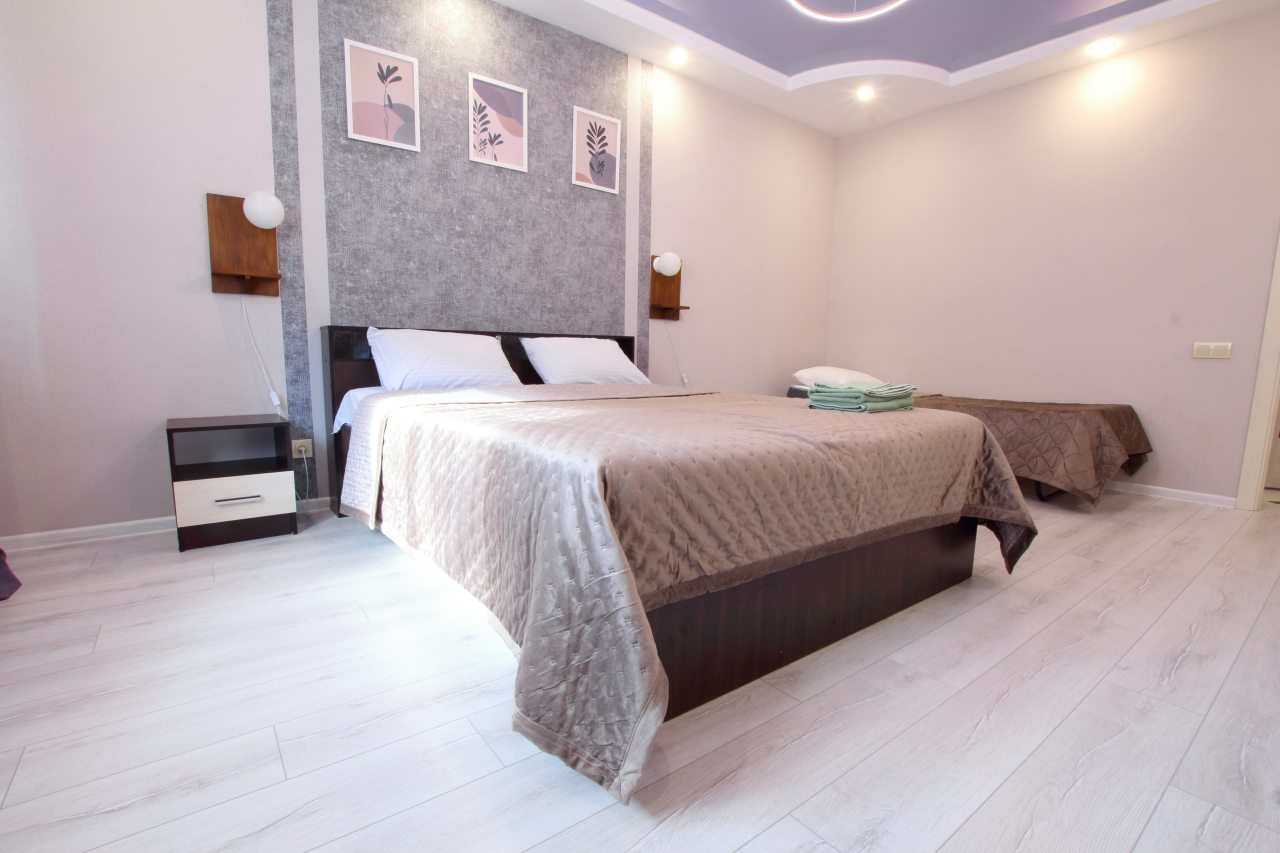 Внутри имеется большая и удобная двуспальная кровать, раскладушка, диван, вместительный шкаф-купе с зеркалом, прикроватные тумбы и лампы, полотенца, санузел с душевой.