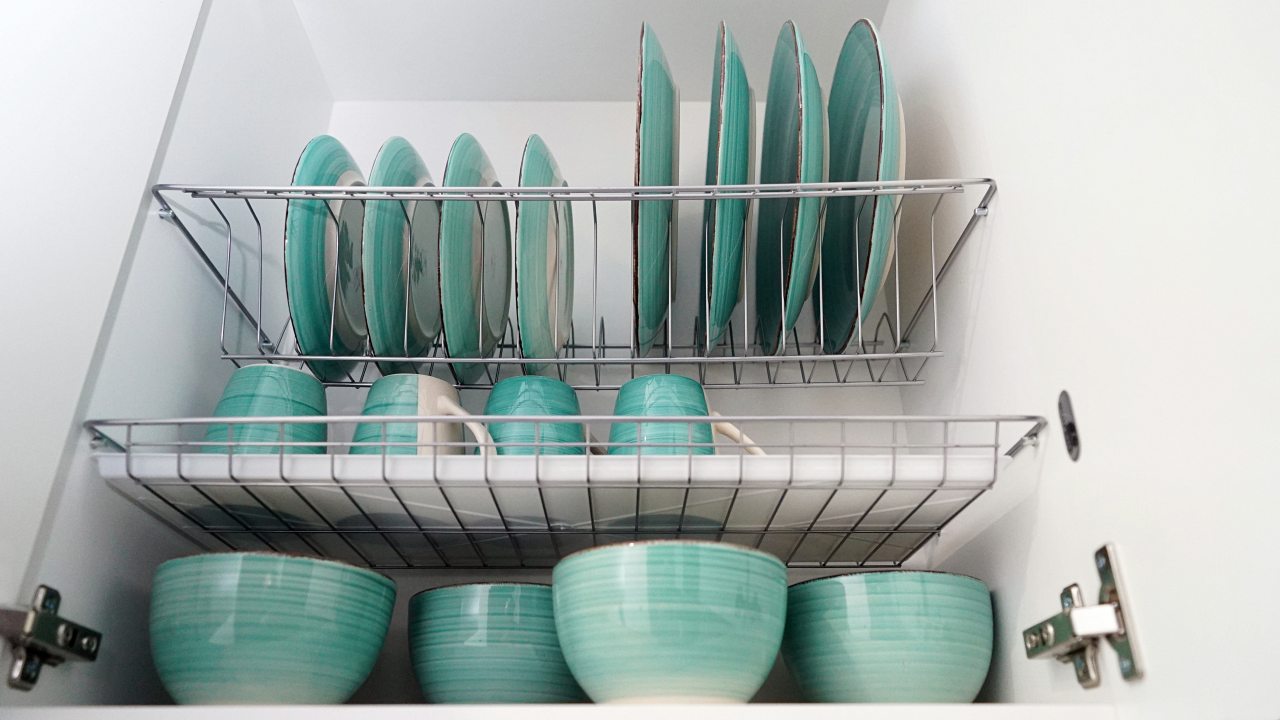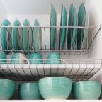 Зона кухни укомплектована СВЧ, чайником, необходимой посудой, холодильником, обеденным столом и стульями.