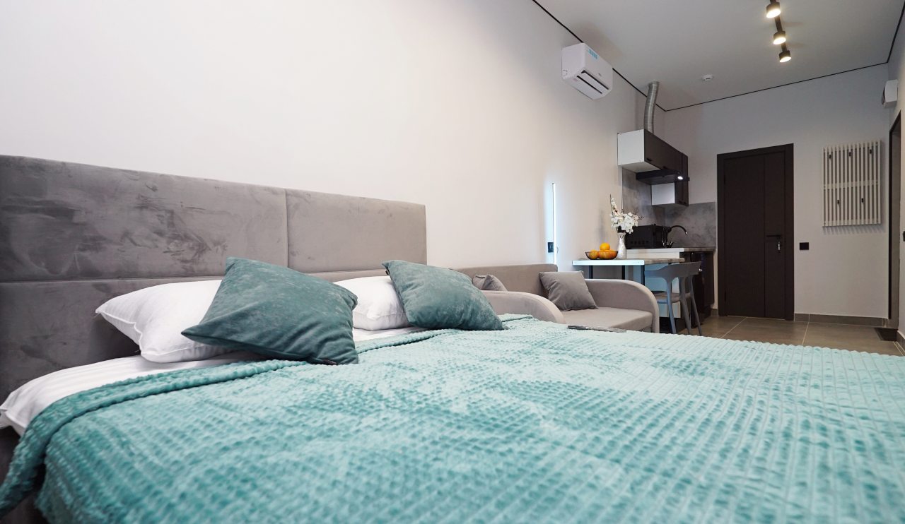 Среди основных удобств, которые вас ожидают внутри, — двуспальная кровать, диван, телевизор, затемненные шторы, кондиционер, а также санузел с душевой и стиральной машиной.
