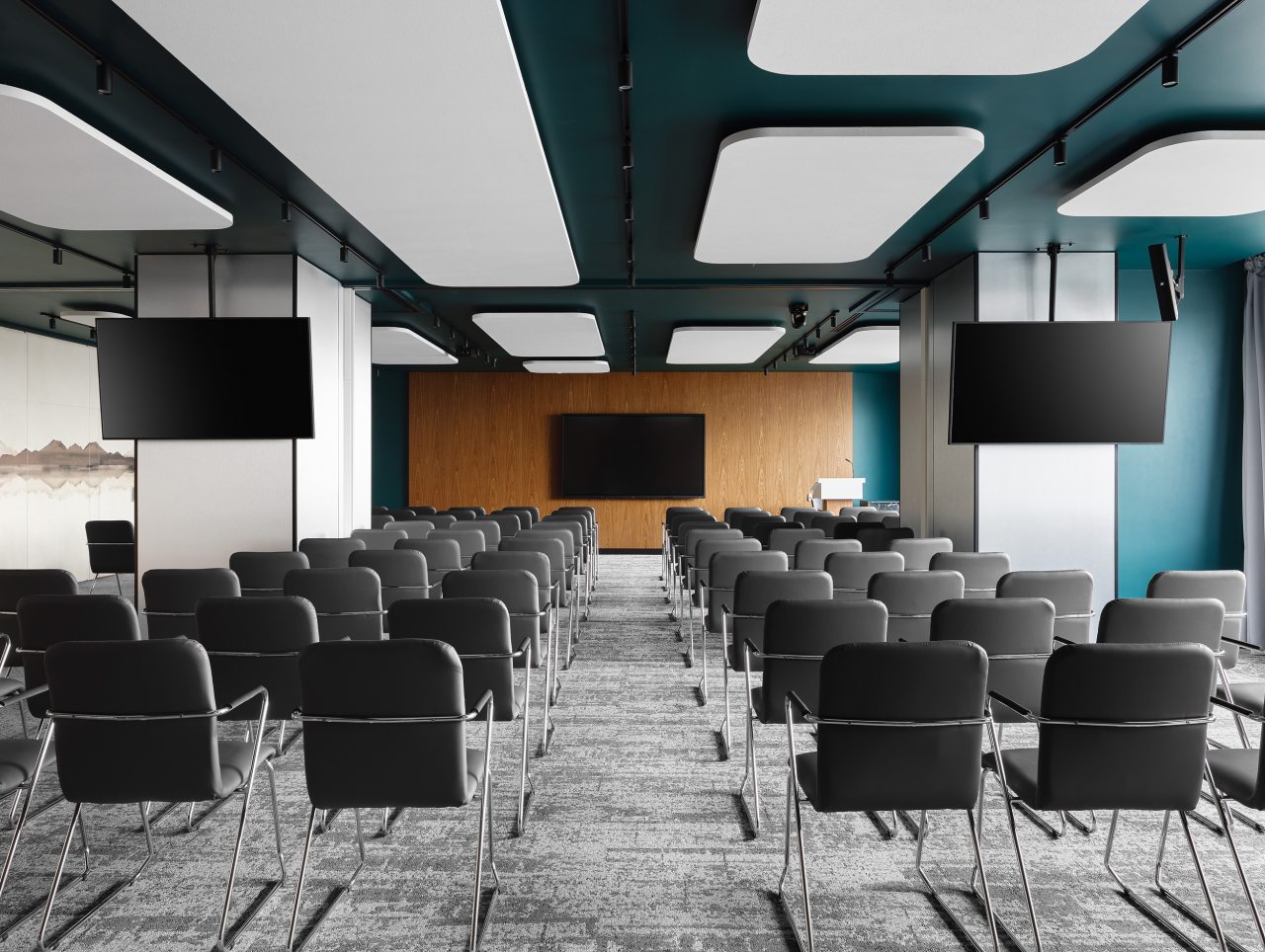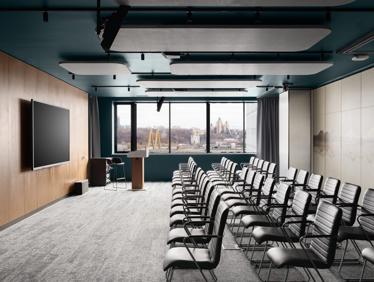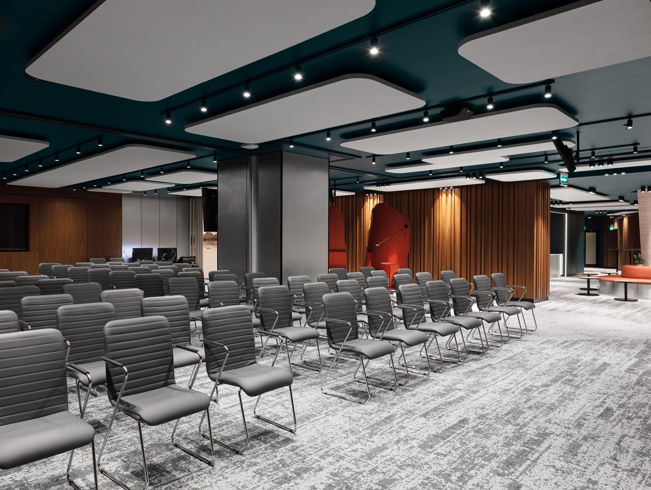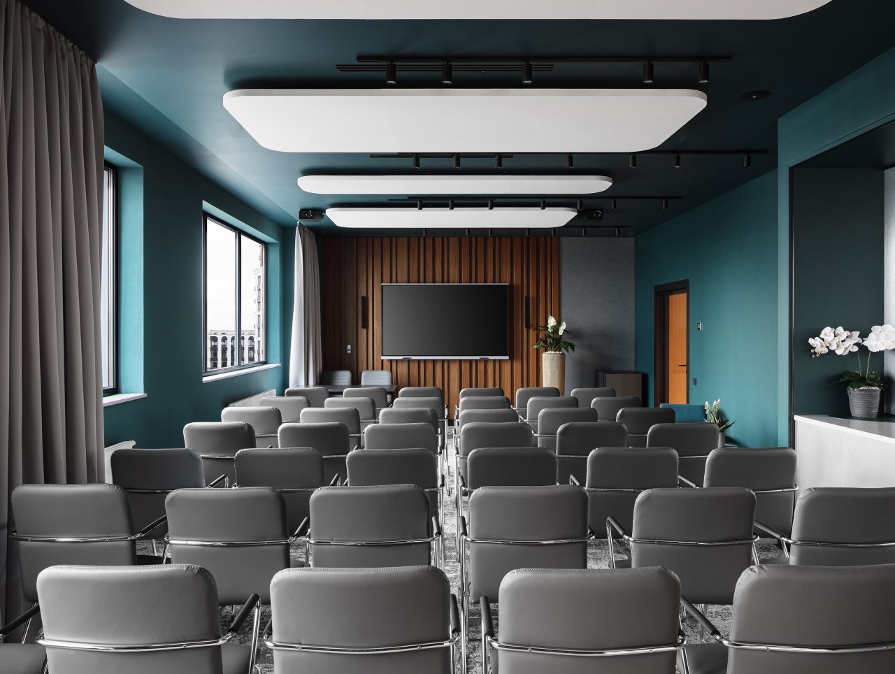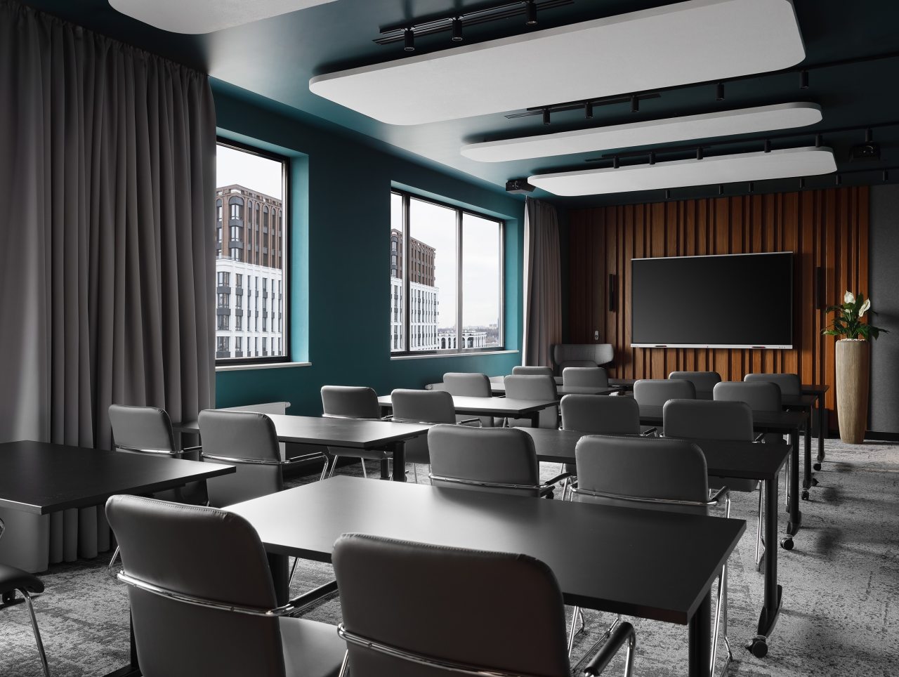 Дополнительно предусмотрены коворкинг-пространства, переговорные и конференц-залы, где есть необходимая мебель и техника для деловых мероприятий.
