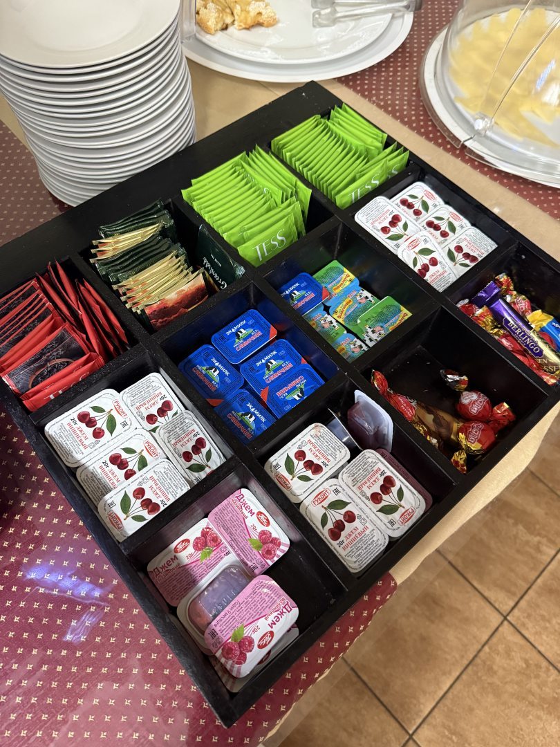 Завтраки довольно разнообразные, на выбор каша или омлет, варенные яйца, колбаса, сыр, пончики, сырники. Разнообразные чаи, кофе, если добавить немного овощей или фруктов, будет идеально