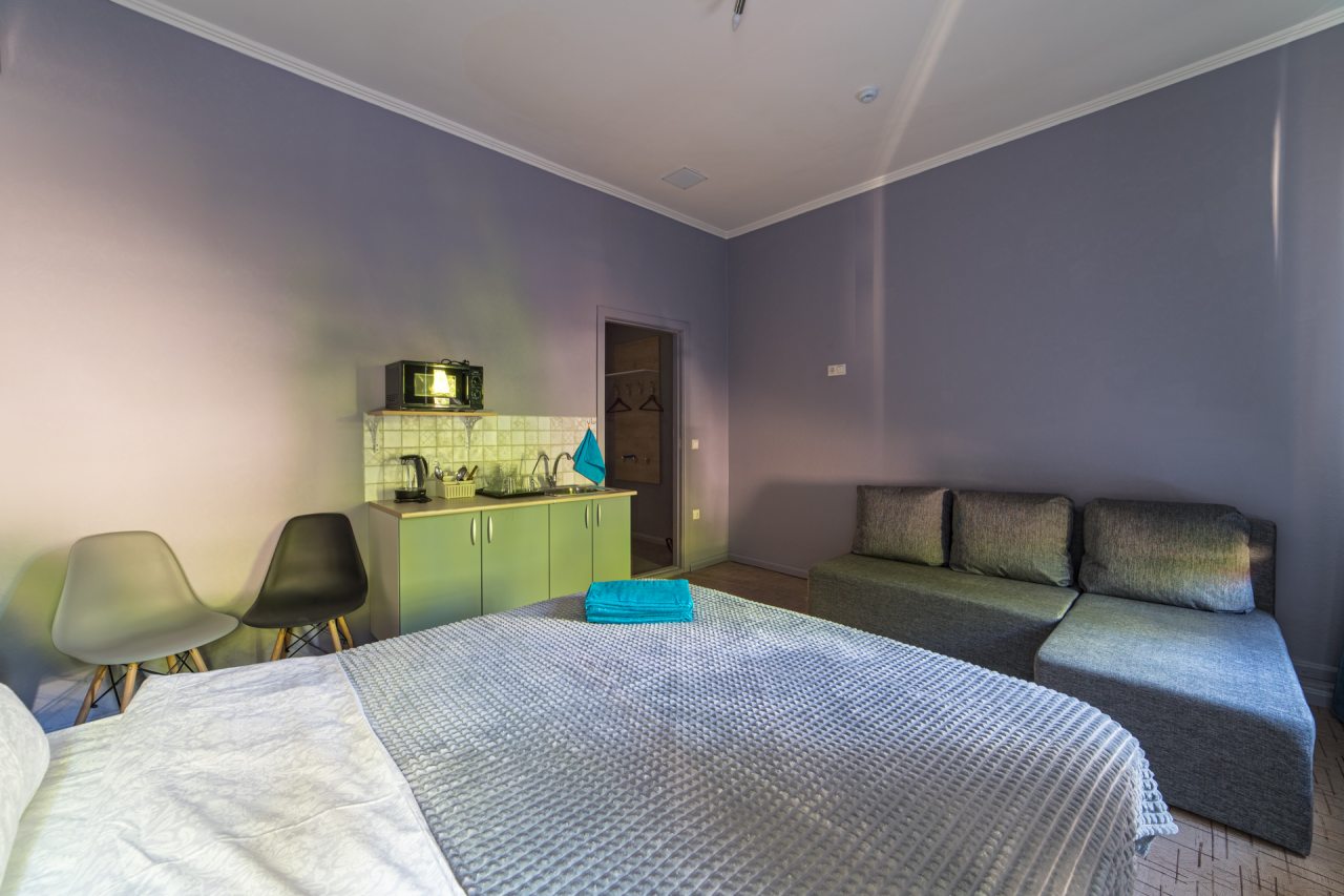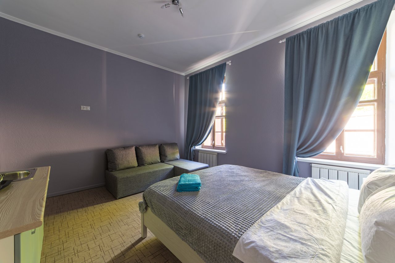 - Четырехместный (Номер с кондиционером 1 двуспальная кровать + 1 двуспальный диван с удобствами на блок без TV)