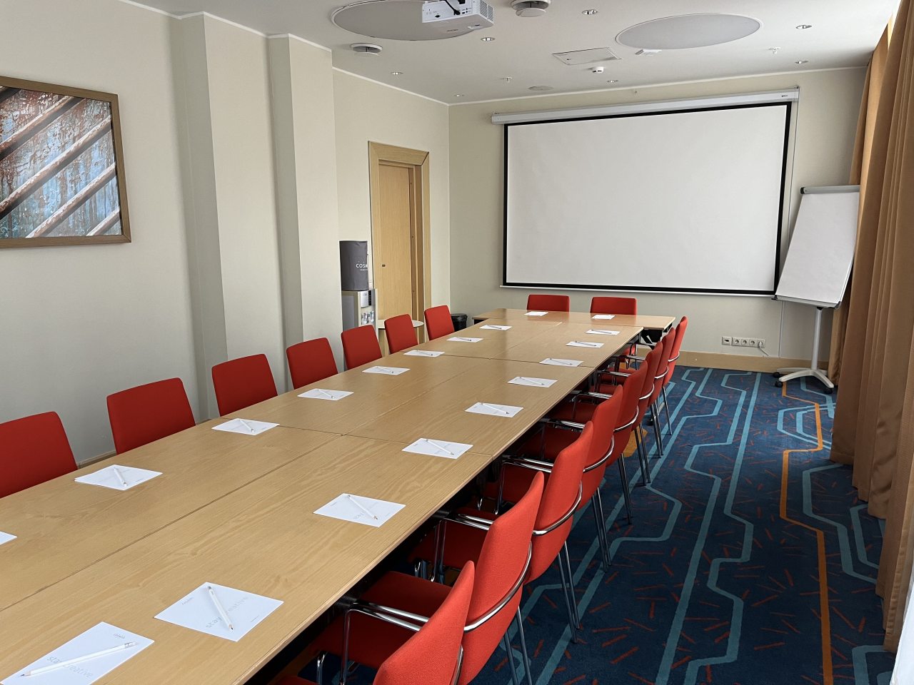 Небольшой, но вместительный конференц-зал до 25 человек, отлично подойдет для презентаций и бизнес-встреч. Просторный и лаконичный зал с удобными сиденьями имеет все самое необходимое для проведения переговоров: