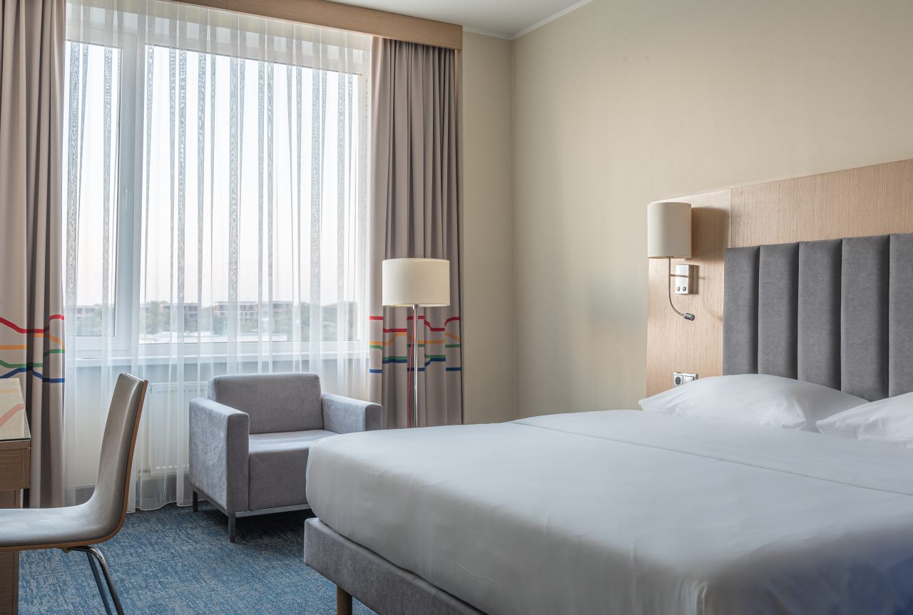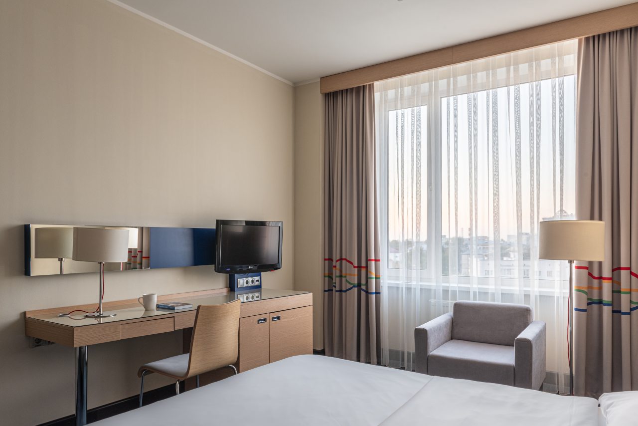 Номера содержат все необходимое для комфортного проживания: удобная кровать, затемненные шторы, письменный стол, телевизор и Wi-Fi. Также есть своя ванная комната и небольшая прихожая.