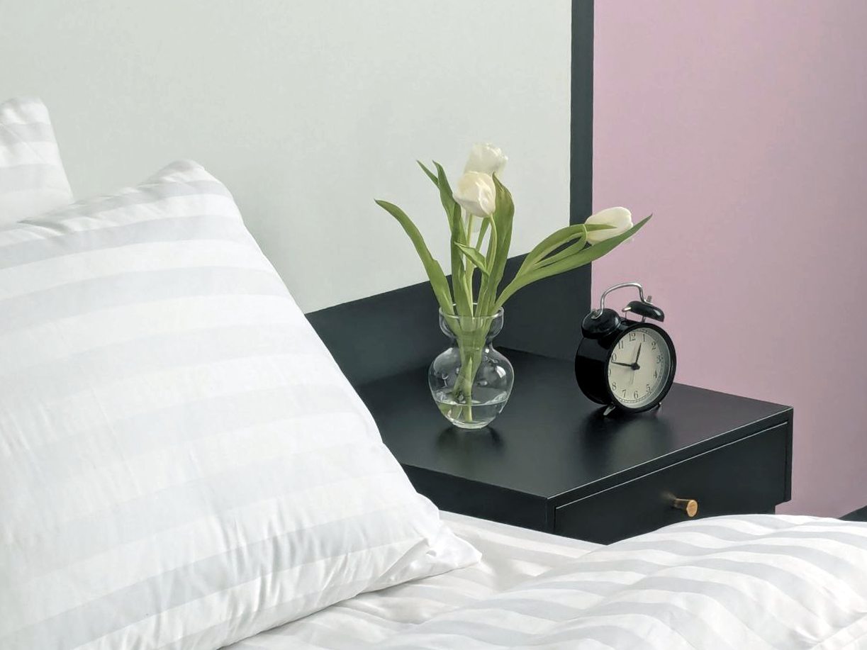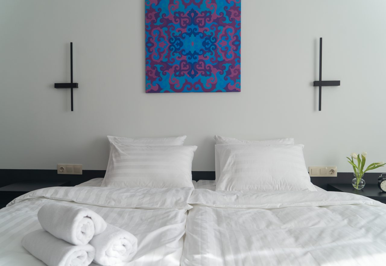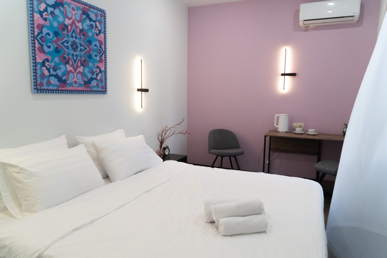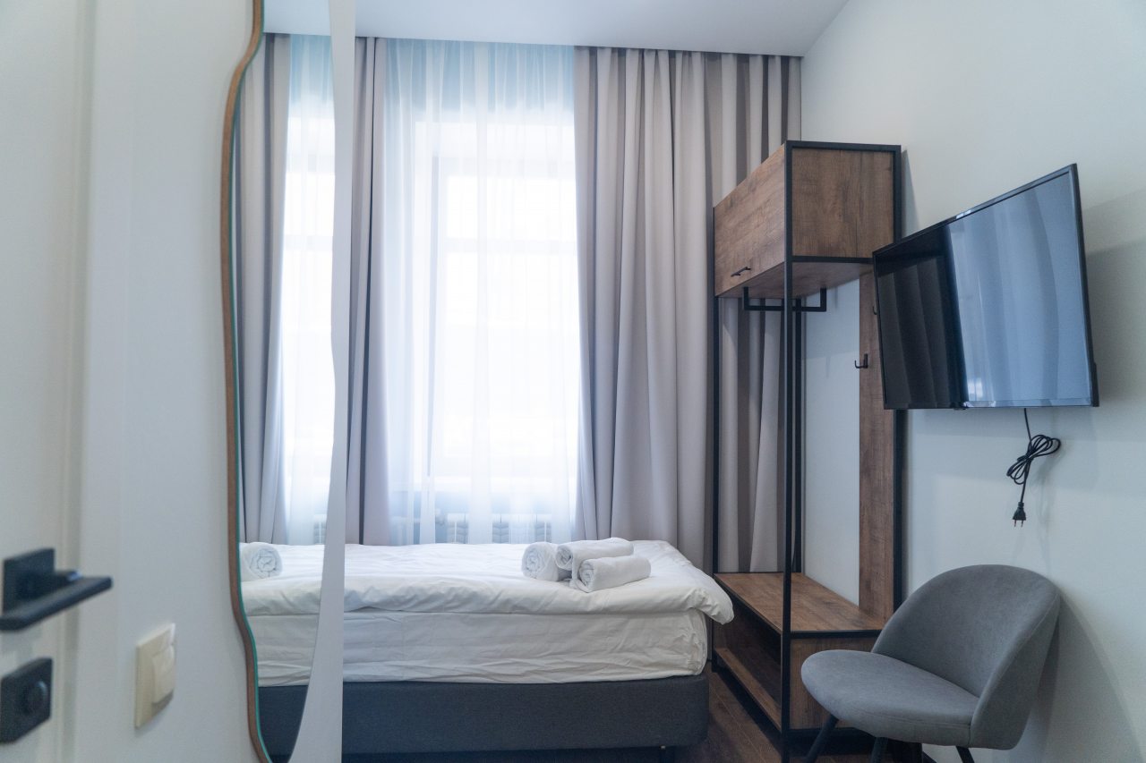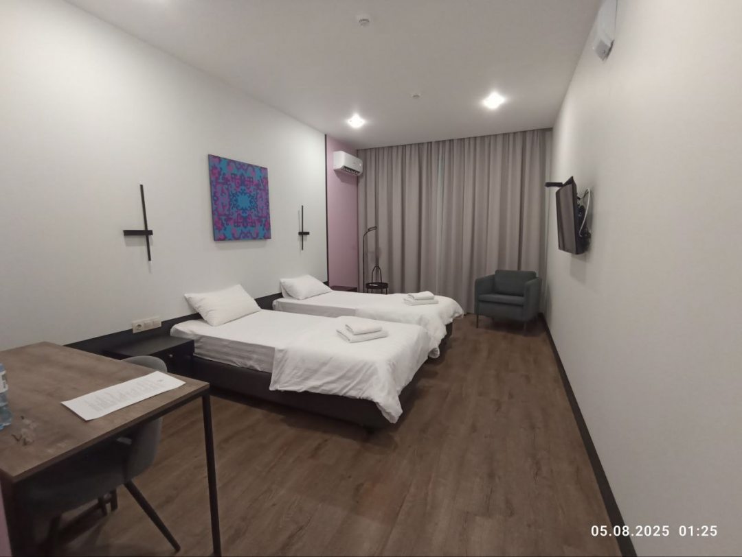 В номерах имеется: одна- и двуспальная кровати с ортопедическим основанием, подставка под чемодан, стол, стулья, шкаф. В отдельной ванной есть душ, туалет, тапочки, фен, полотенца, раковина.