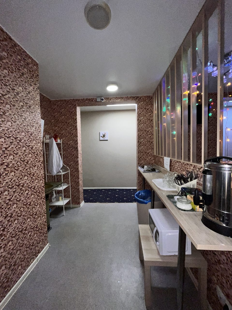 На этаже есть питьевая вода и кипяток, микроволновка и тостер. Также есть столики, где можно покушать.