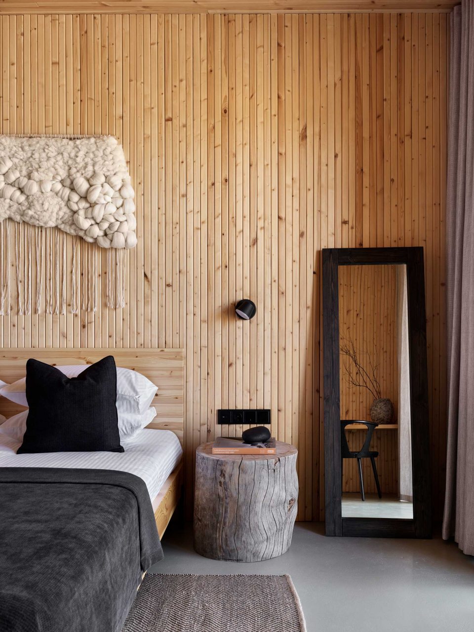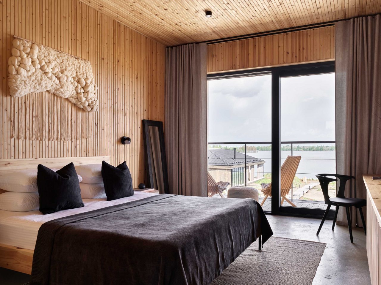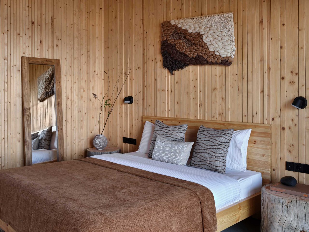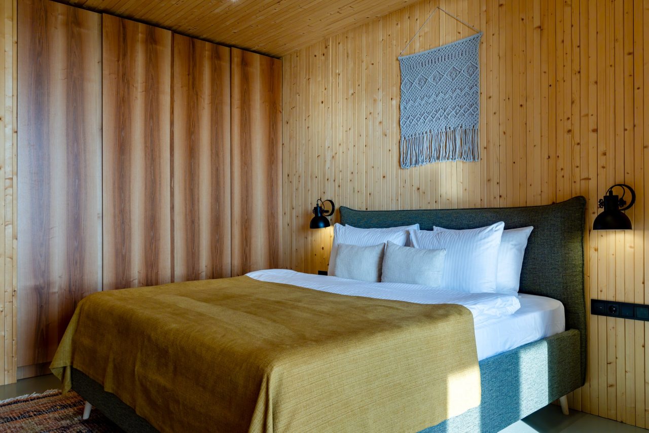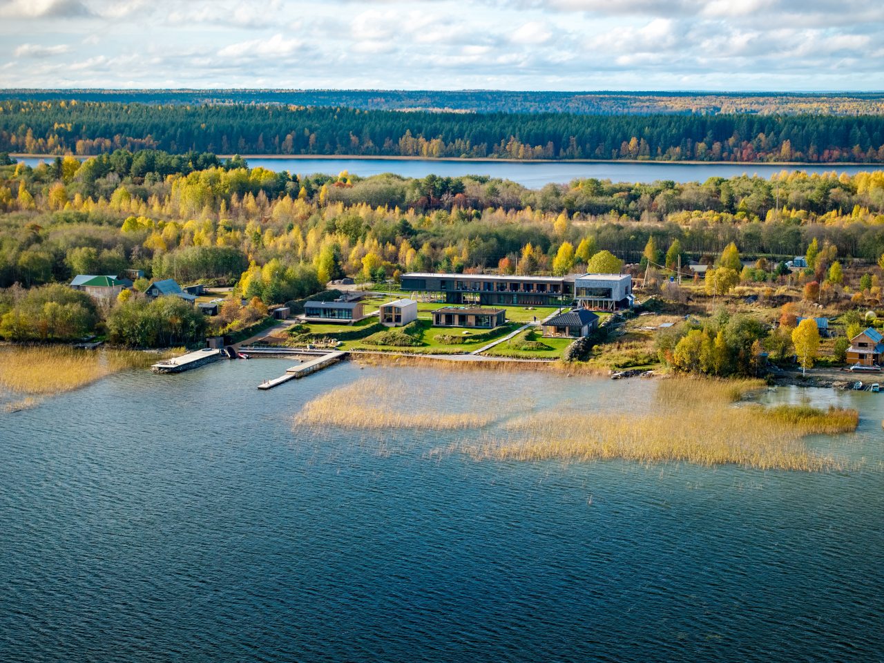 Гости могут расположиться в одном из 13 номеров или снять один из 4 гостевых домов. Каждый вариант размещения отличается стильным интерьером и современными удобствами: ванная комната с набором полотенец и косметики, телевизор со Смарт-ТВ и Wi-Fi, красивый вид на озеро или лес с выходом на террасу.