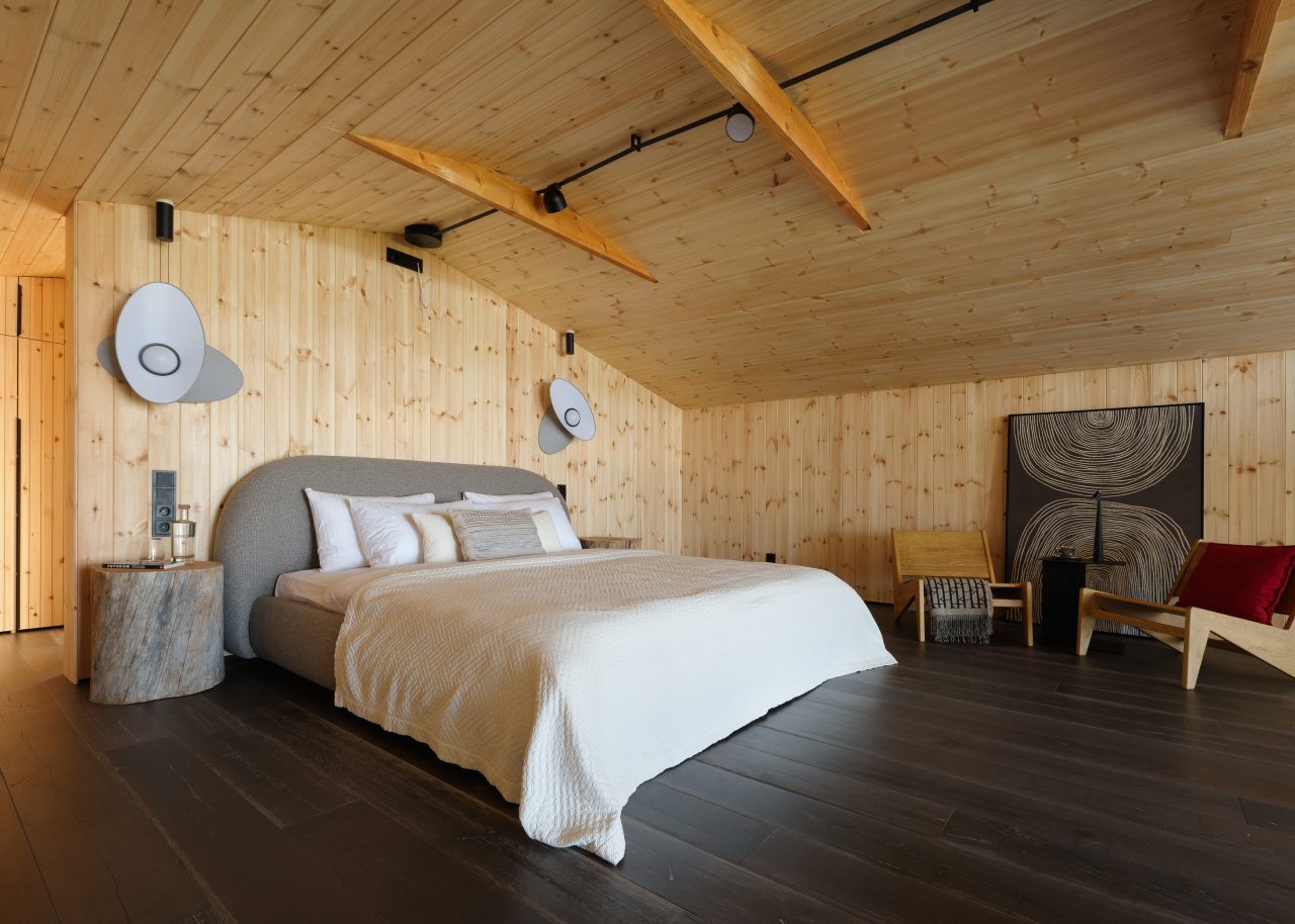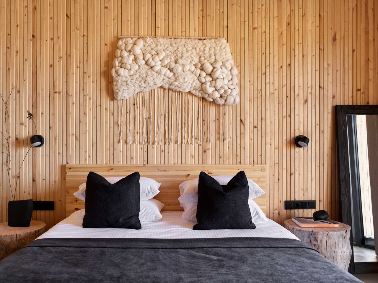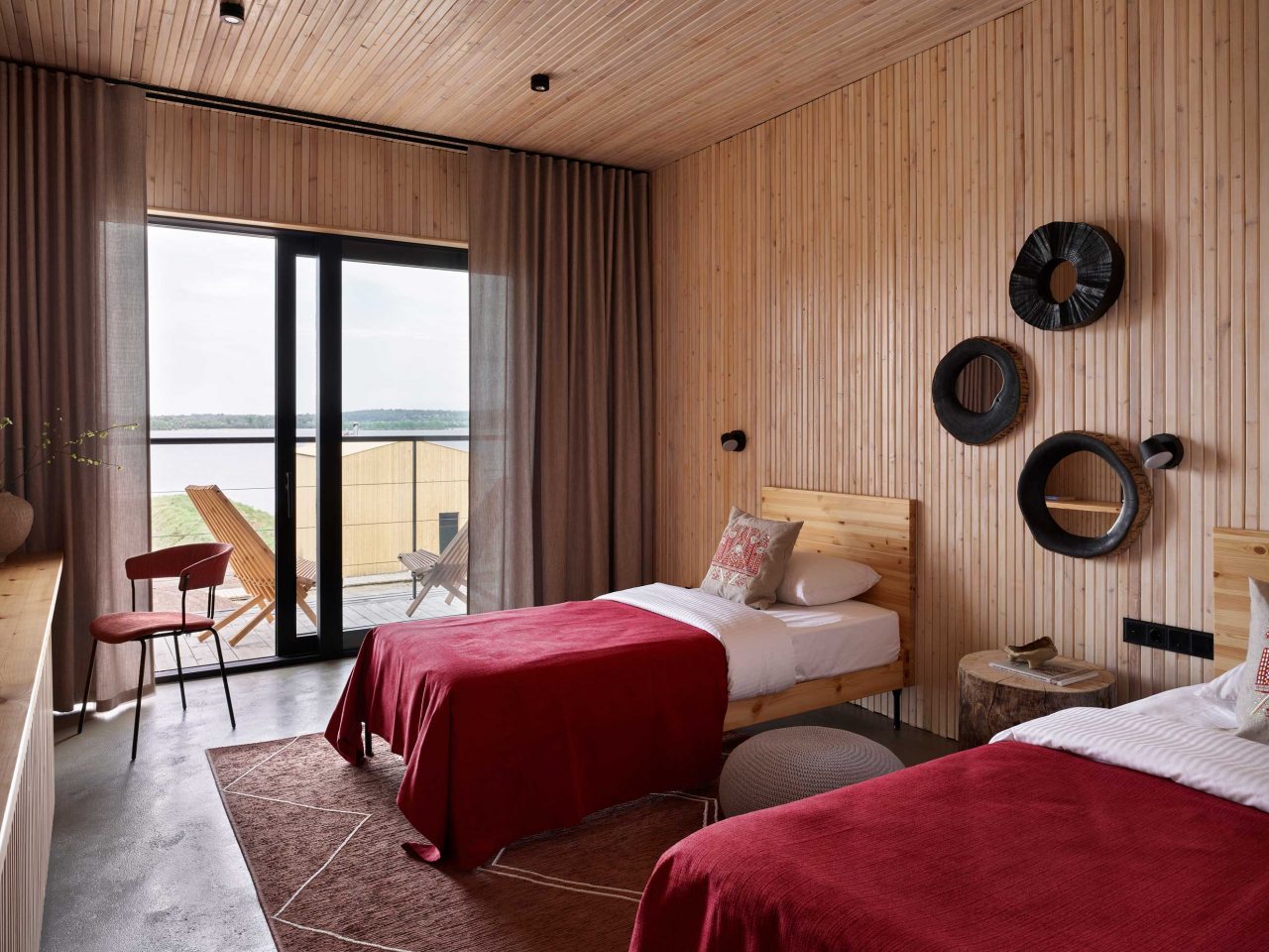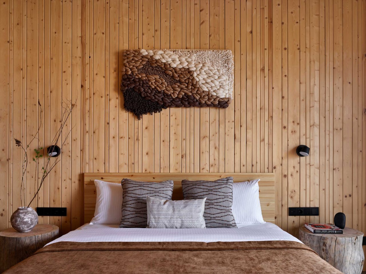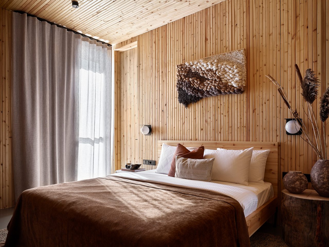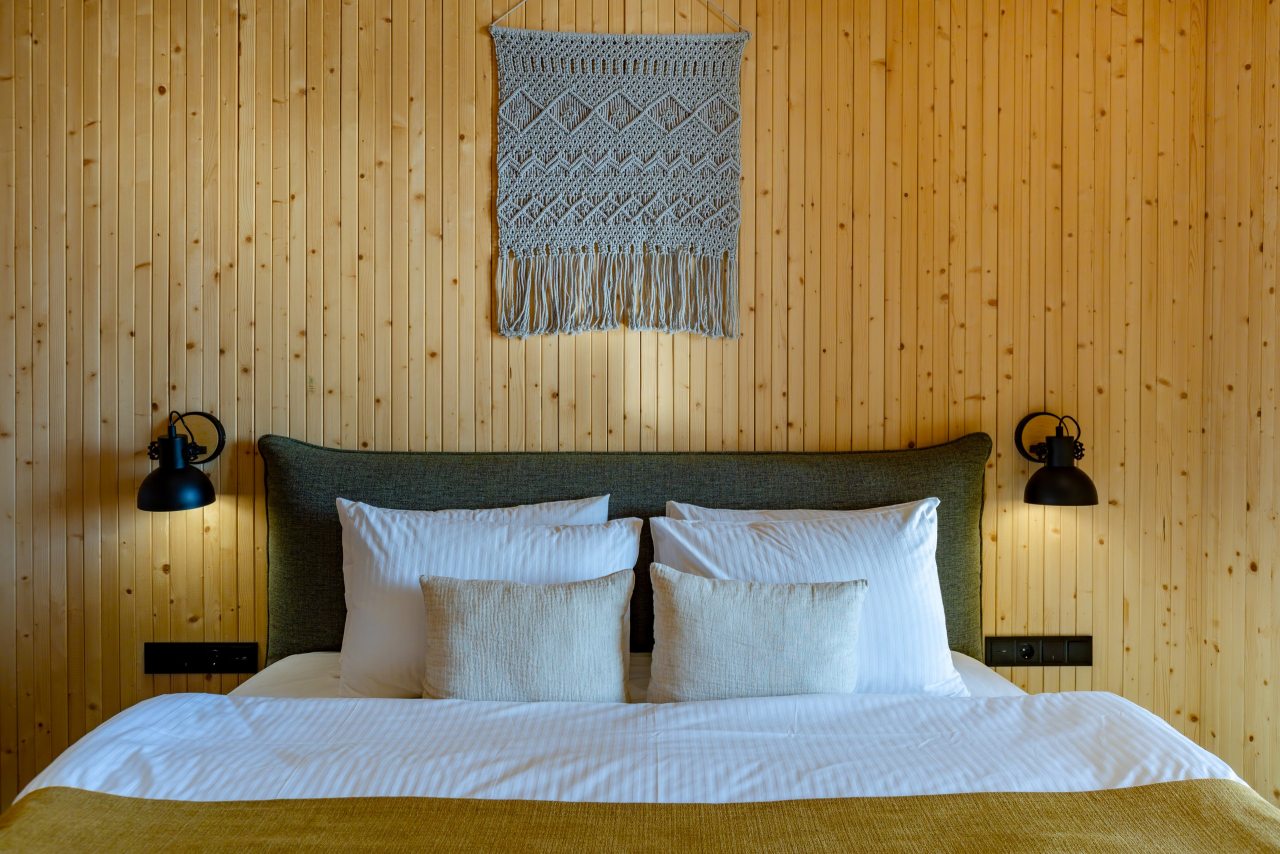 Гости могут расположиться в одном из 13 номеров или снять один из 4 гостевых домов. Каждый вариант размещения отличается стильным интерьером и современными удобствами: ванная комната с набором полотенец и косметики, телевизор со Смарт-ТВ и Wi-Fi, красивый вид на озеро или лес с выходом на террасу.