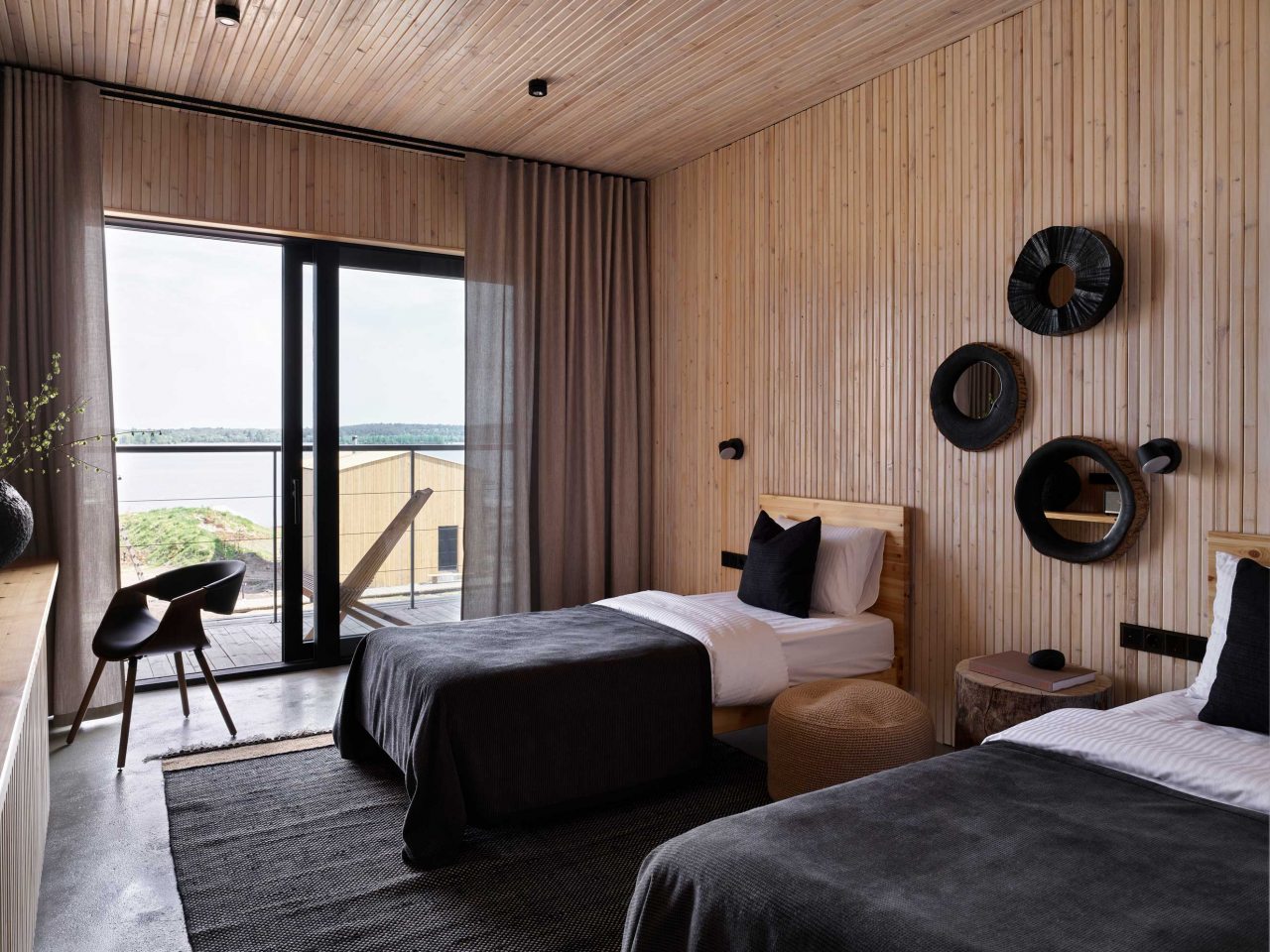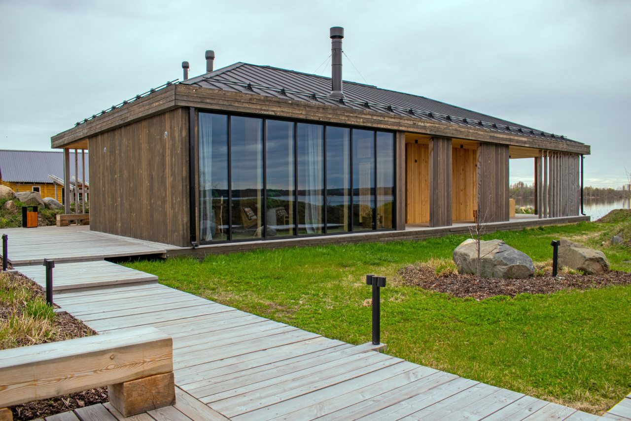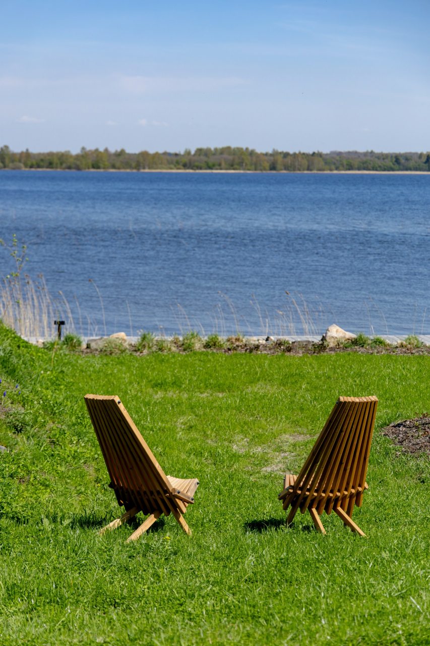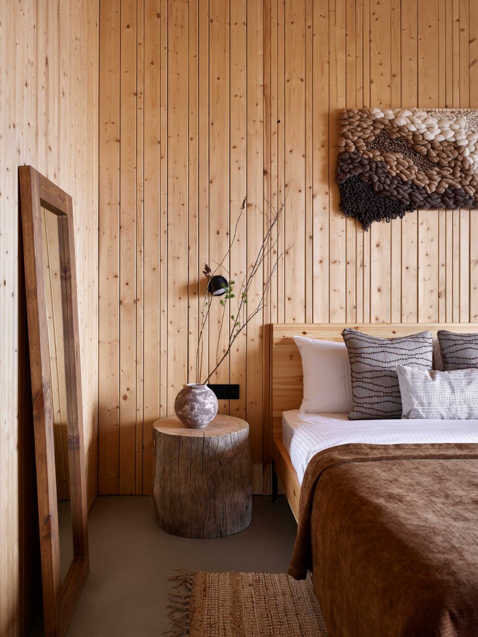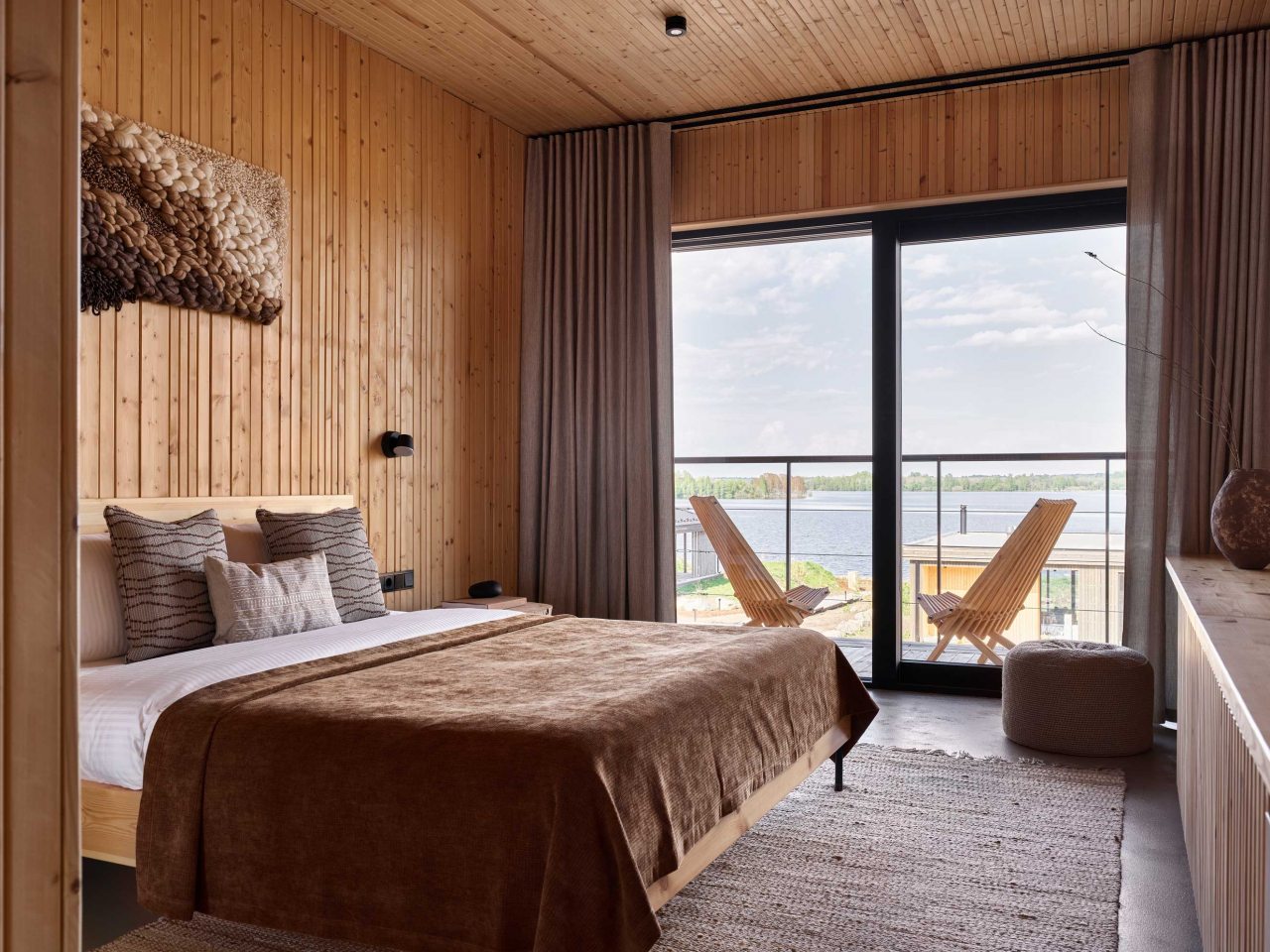 Гости могут расположиться в одном из 13 номеров или снять один из 4 гостевых домов. Каждый вариант размещения отличается стильным интерьером и современными удобствами: ванная комната с набором полотенец и косметики, телевизор со Смарт-ТВ и Wi-Fi, красивый вид на озеро или лес с выходом на террасу.