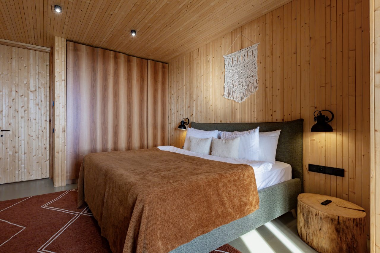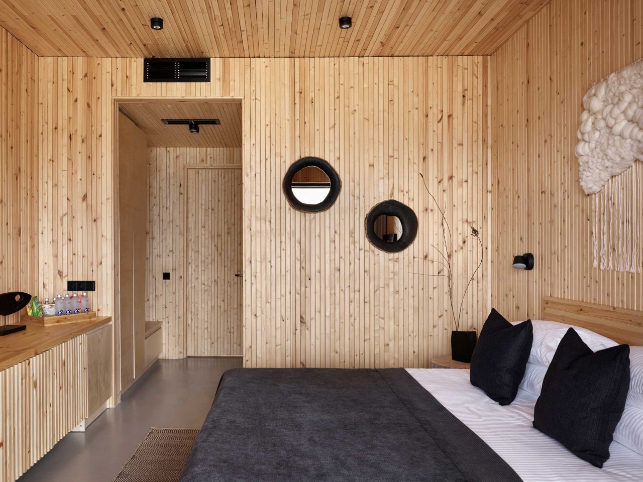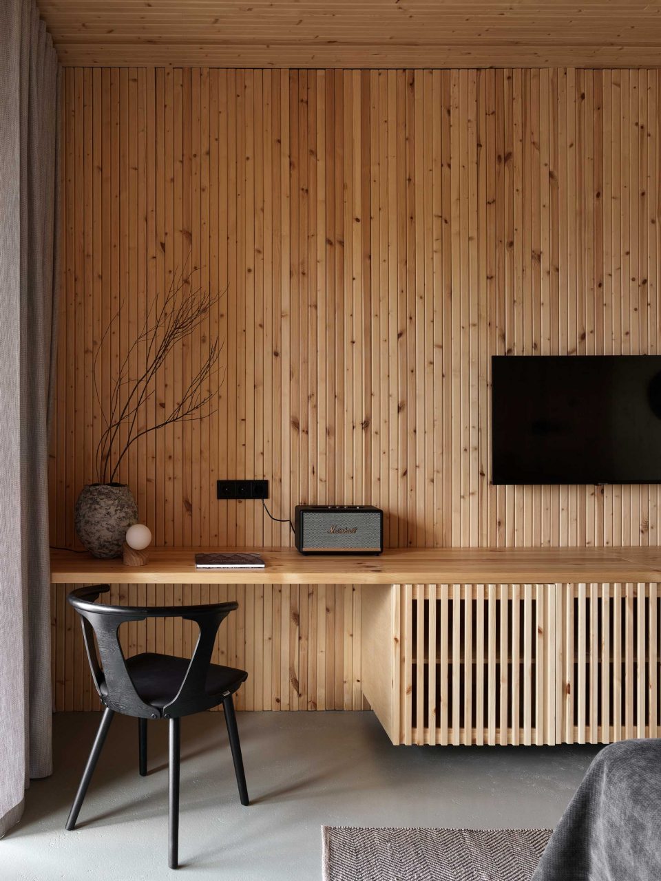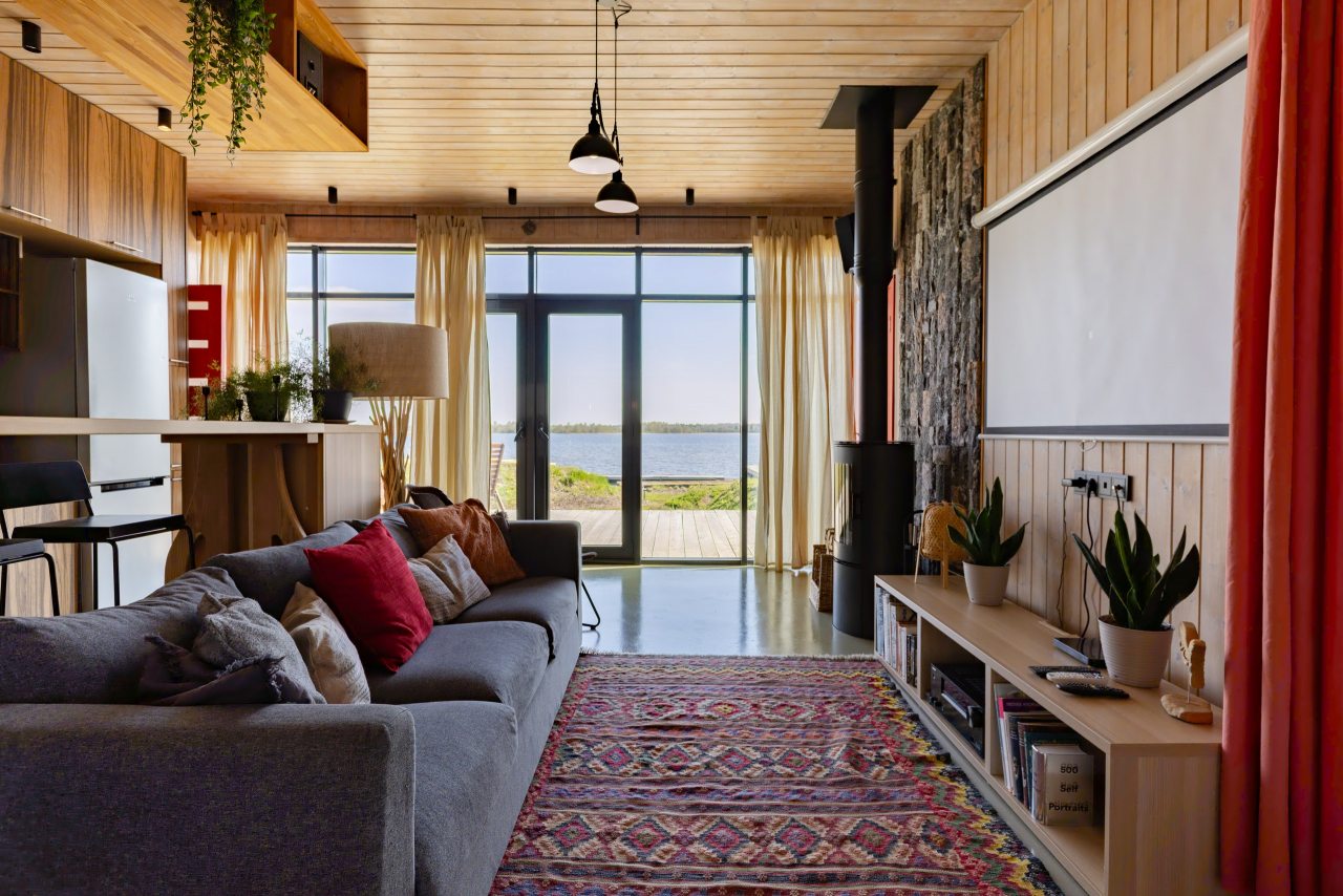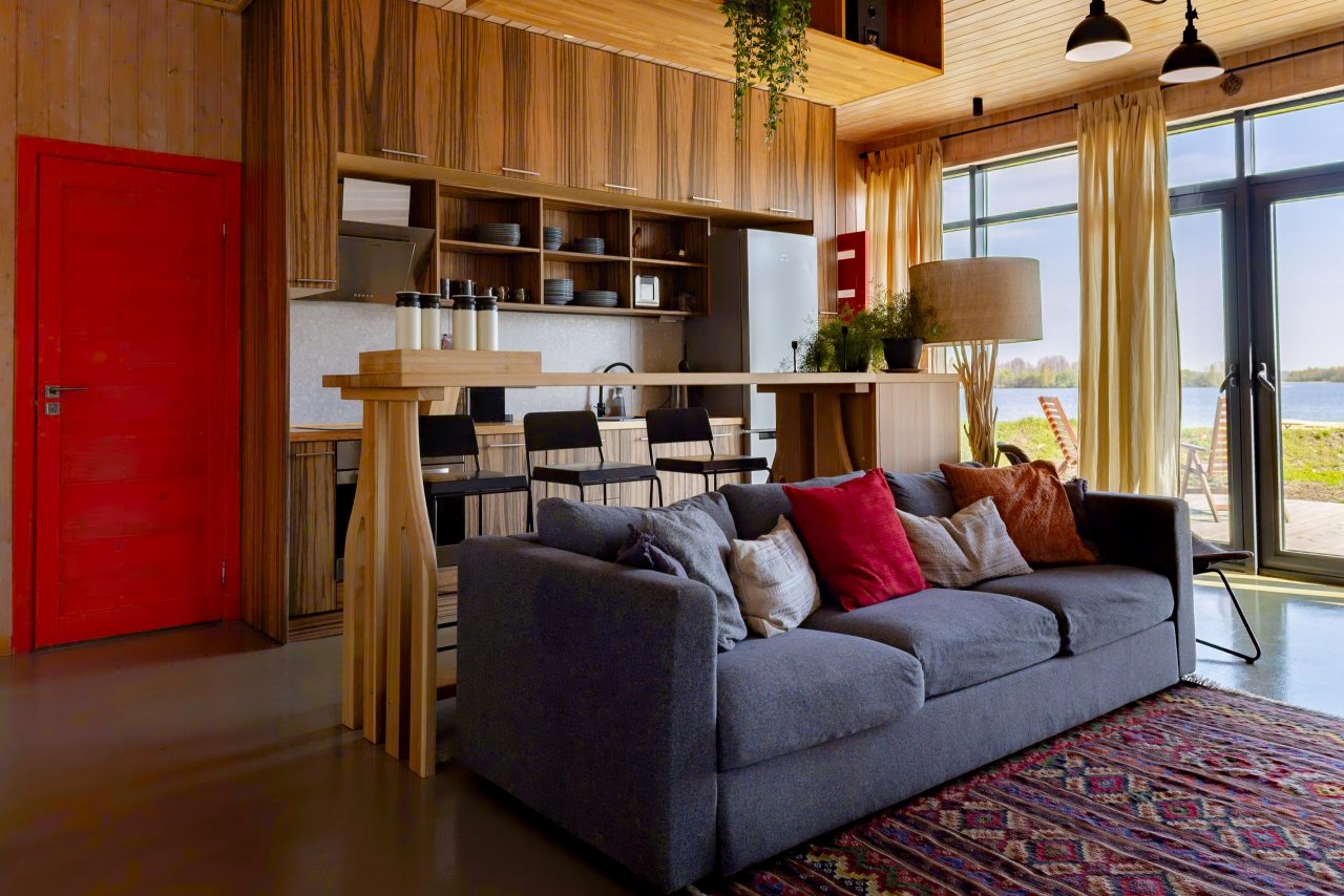 Гости могут расположиться в одном из 13 номеров или снять один из 4 гостевых домов. Каждый вариант размещения отличается стильным интерьером и современными удобствами: ванная комната с набором полотенец и косметики, телевизор со Смарт-ТВ и Wi-Fi, красивый вид на озеро или лес с выходом на террасу.