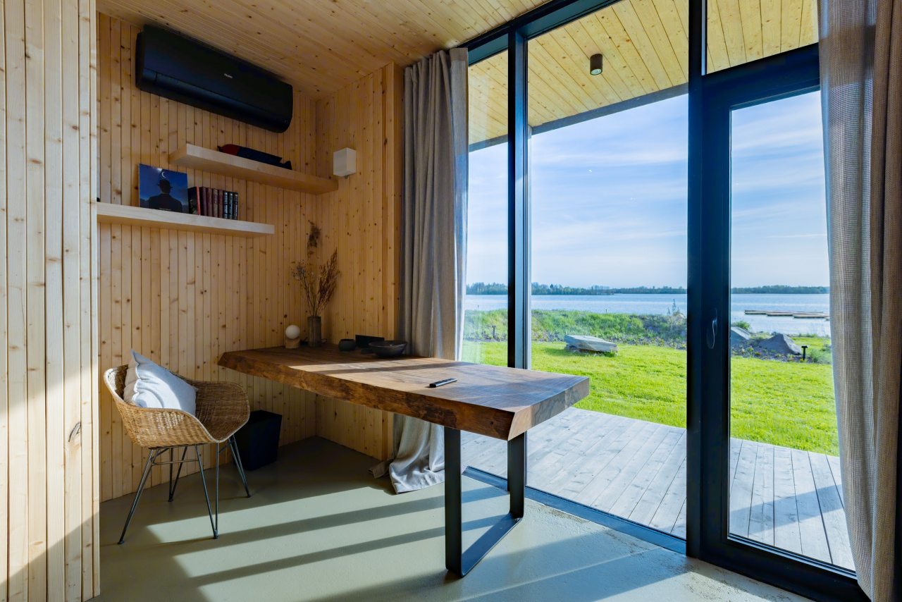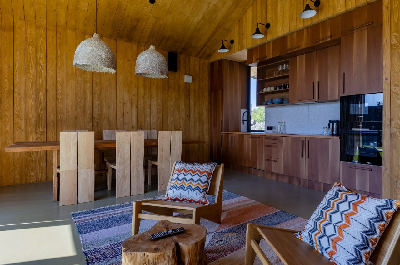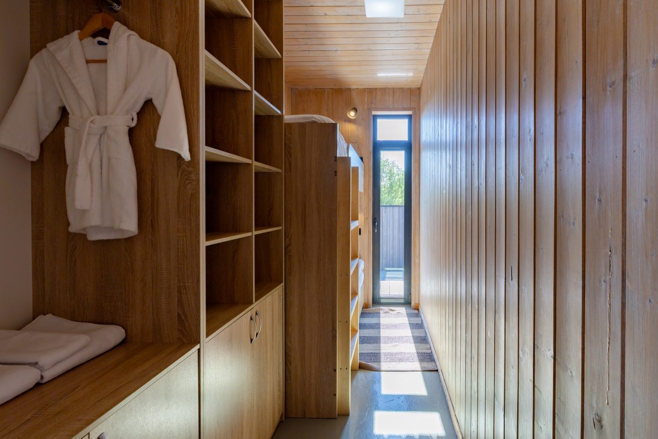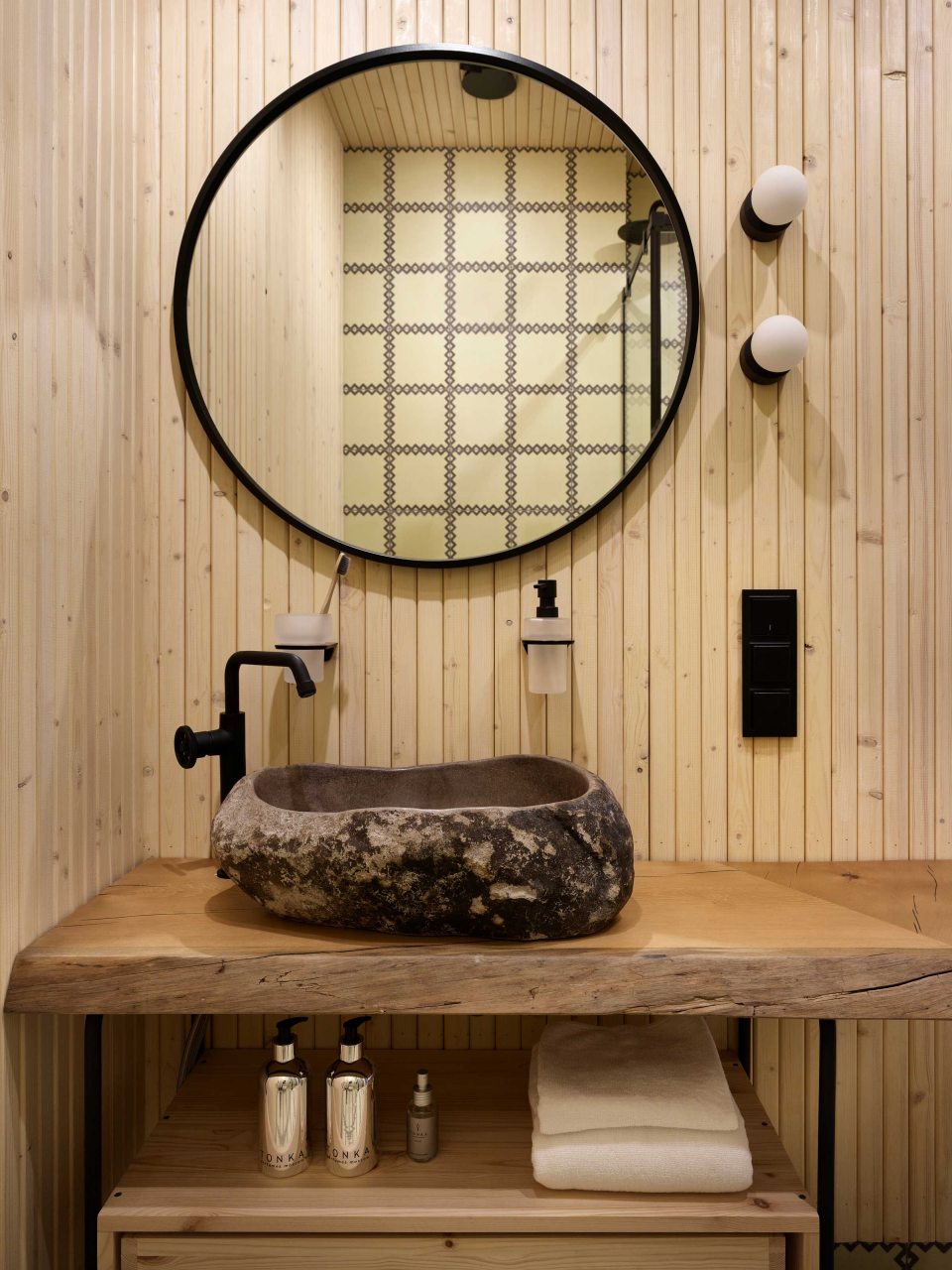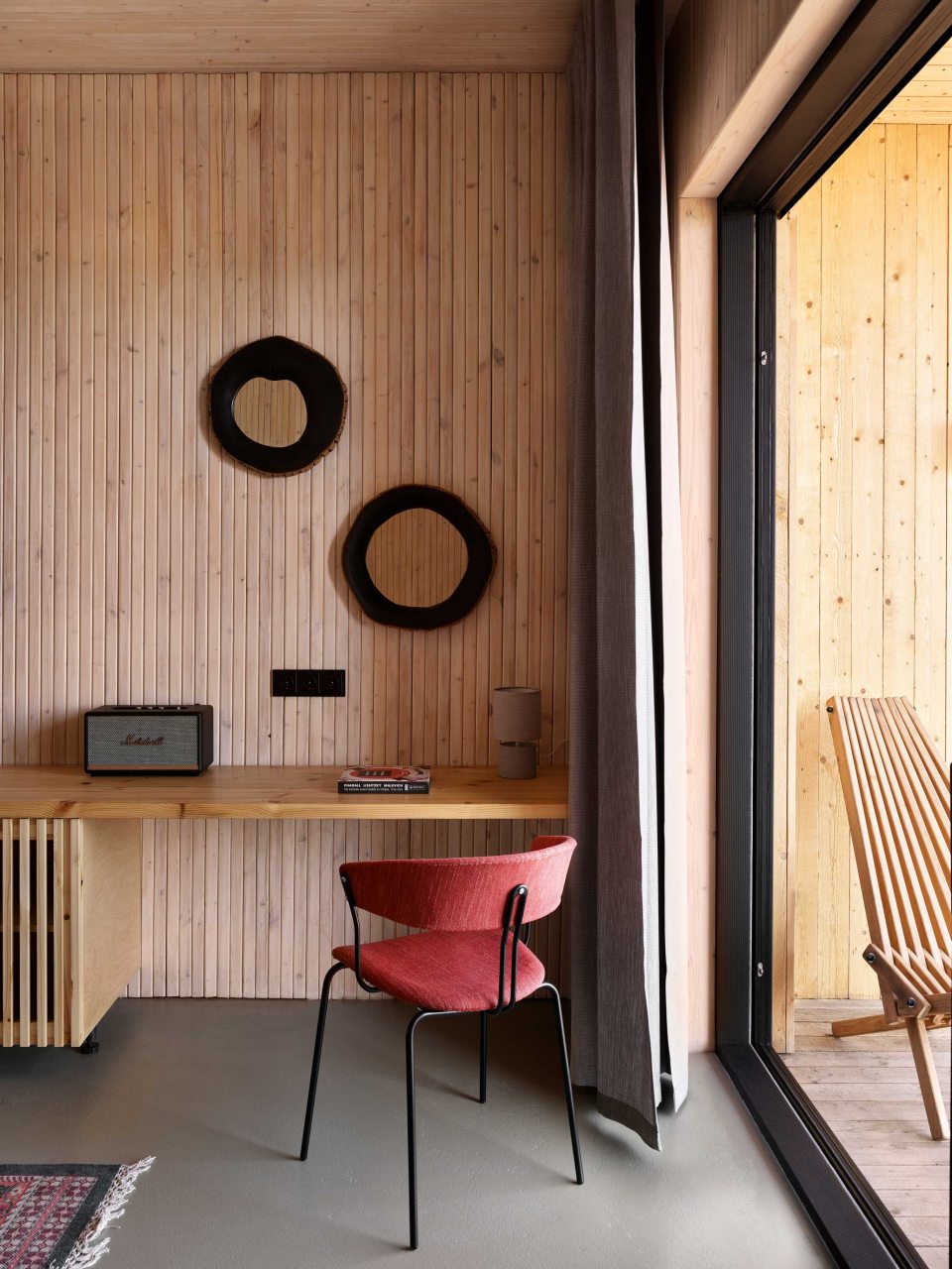 Гости могут расположиться в одном из 13 номеров или снять один из 4 гостевых домов. Каждый вариант размещения отличается стильным интерьером и современными удобствами: ванная комната с набором полотенец и косметики, телевизор со Смарт-ТВ и Wi-Fi, красивый вид на озеро или лес с выходом на террасу.