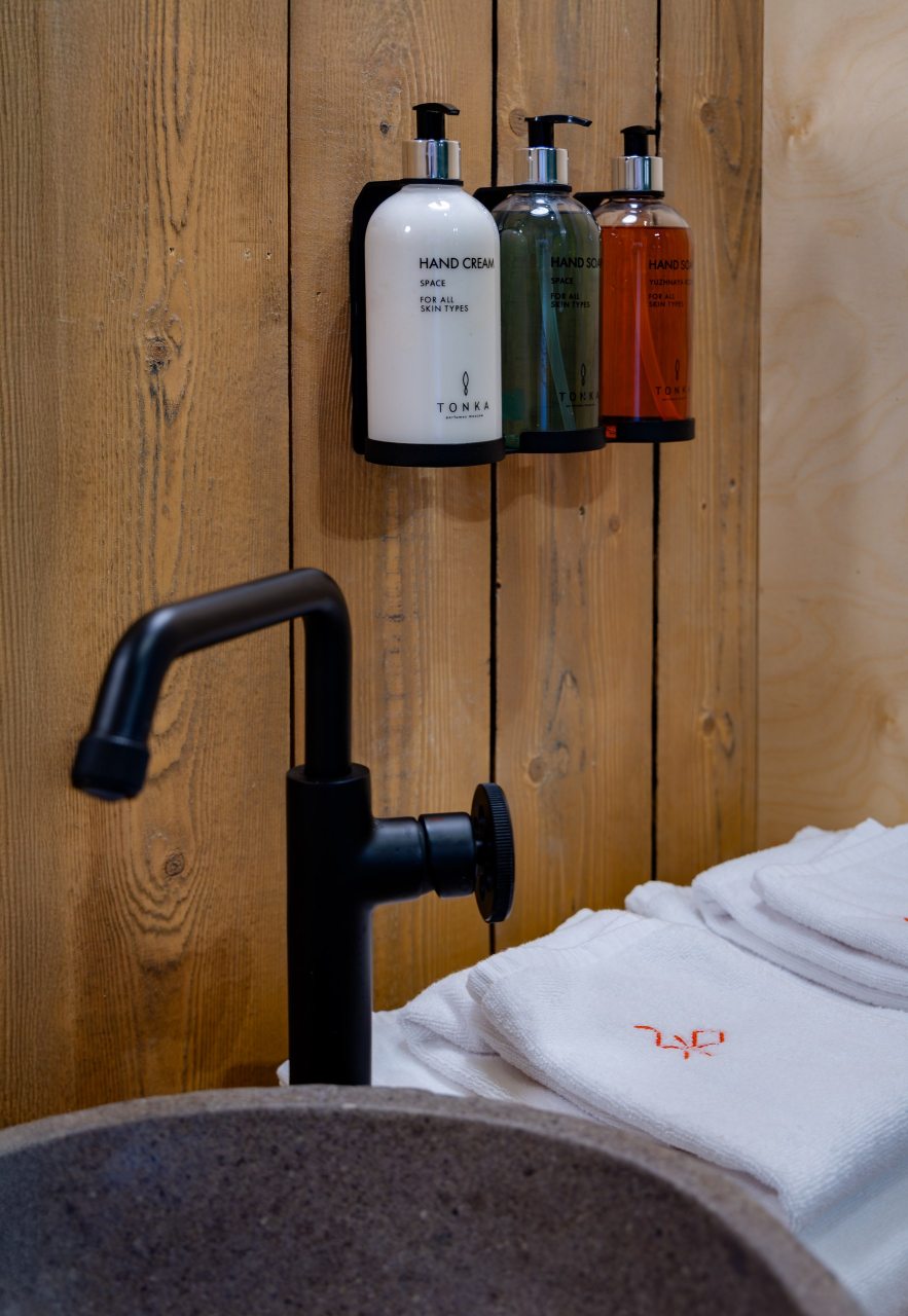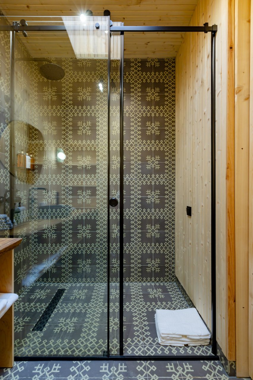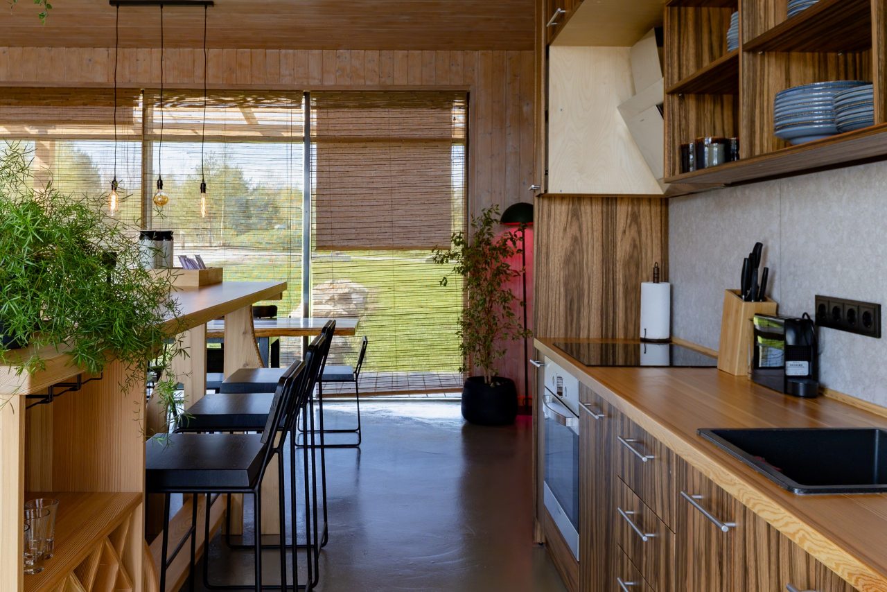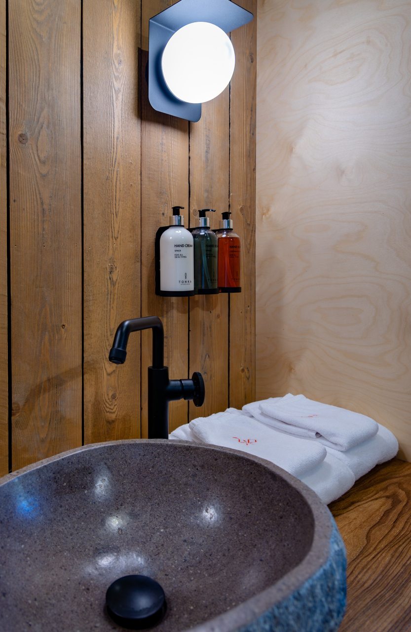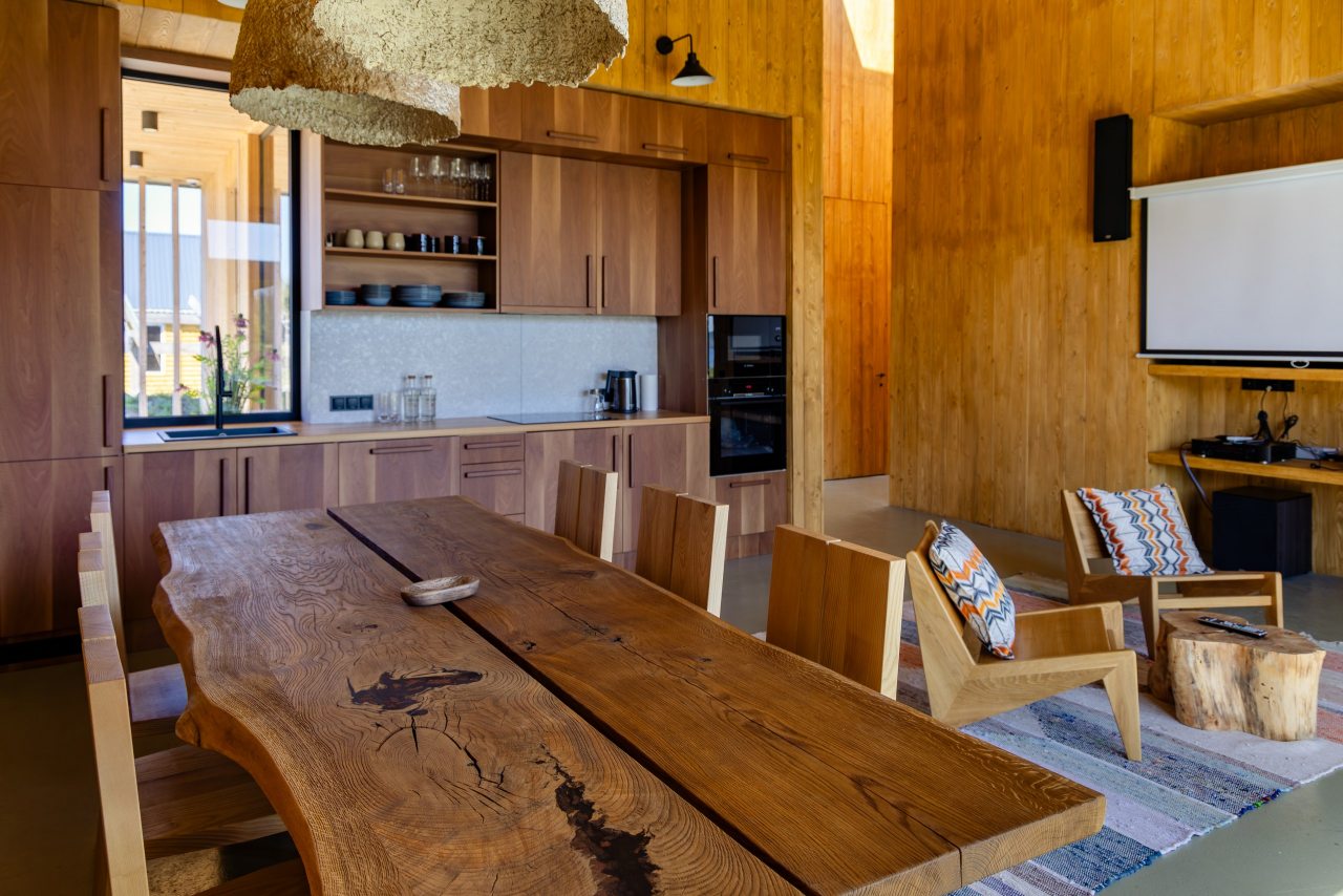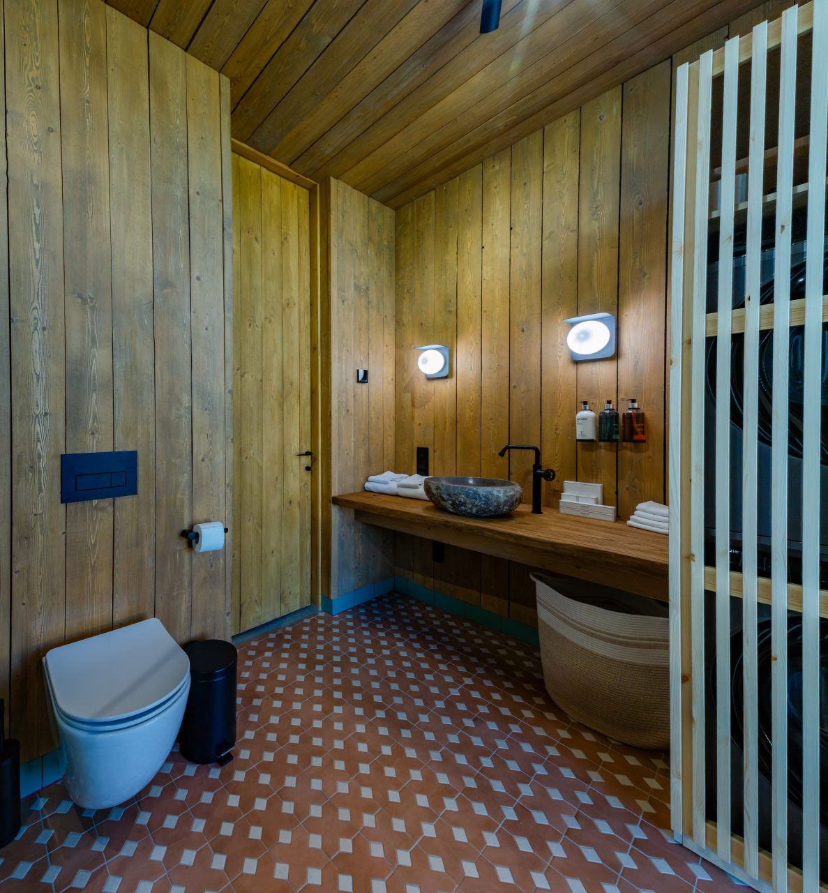 Гости могут расположиться в одном из 13 номеров или снять один из 4 гостевых домов. Каждый вариант размещения отличается стильным интерьером и современными удобствами: ванная комната с набором полотенец и косметики, телевизор со Смарт-ТВ и Wi-Fi, красивый вид на озеро или лес с выходом на террасу.