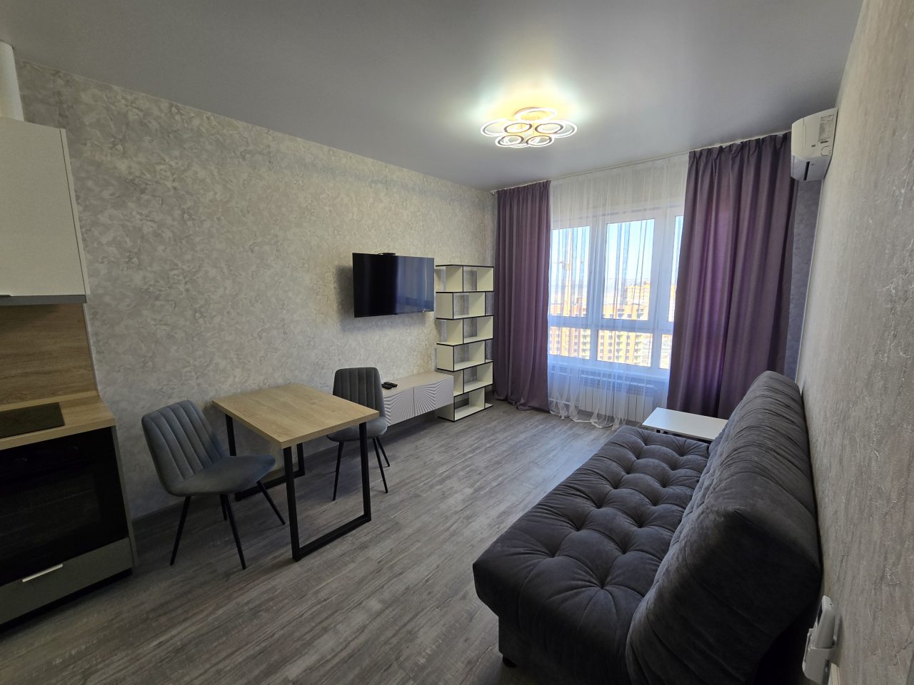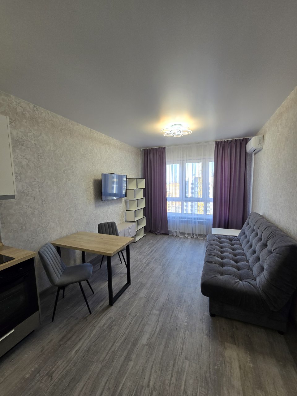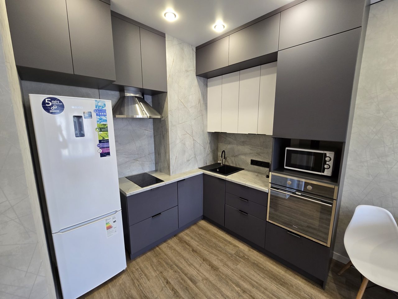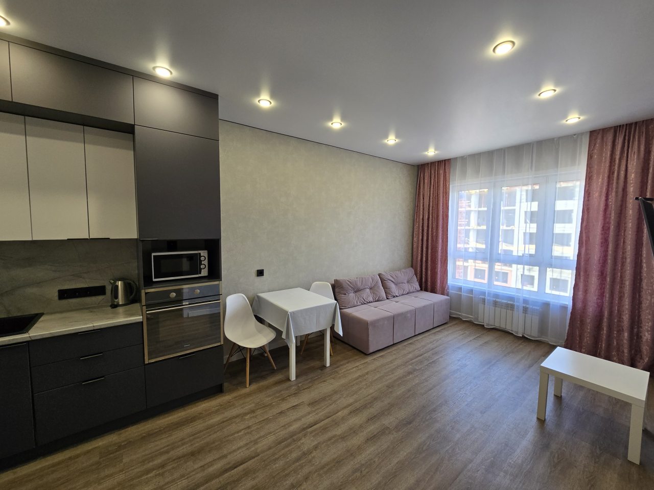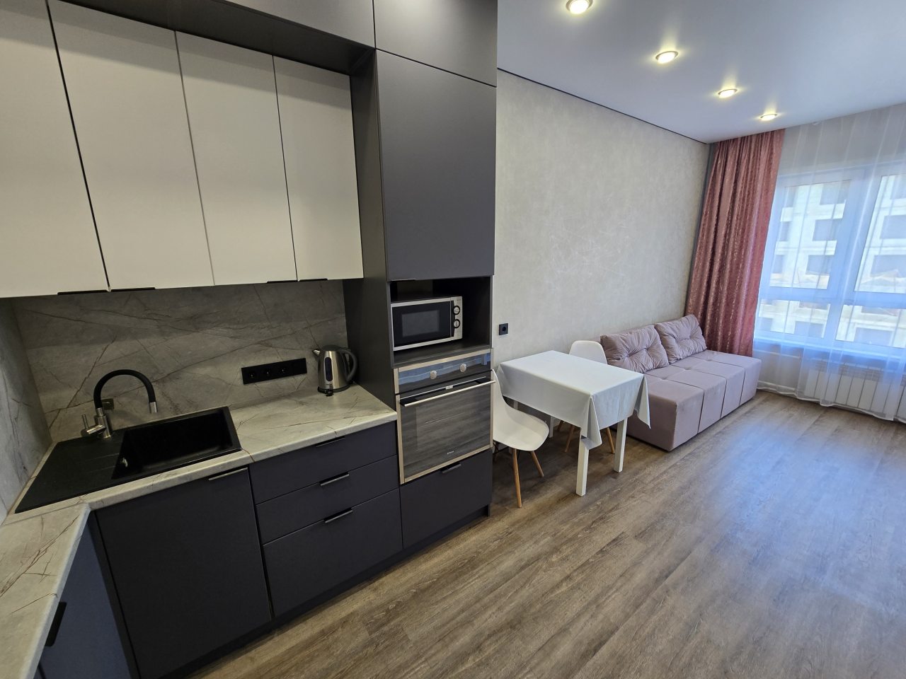На кухонной зоне имеется мягкий диван, кондиционер, обеденный стол на несколько персон, телевизор и кухонный гарнитур со стандартным набором бытовой техники. В соседнем доме располагается продуктовый магазин «Пятёрочка». В шаговой доступности кафе «Пицца в хату».