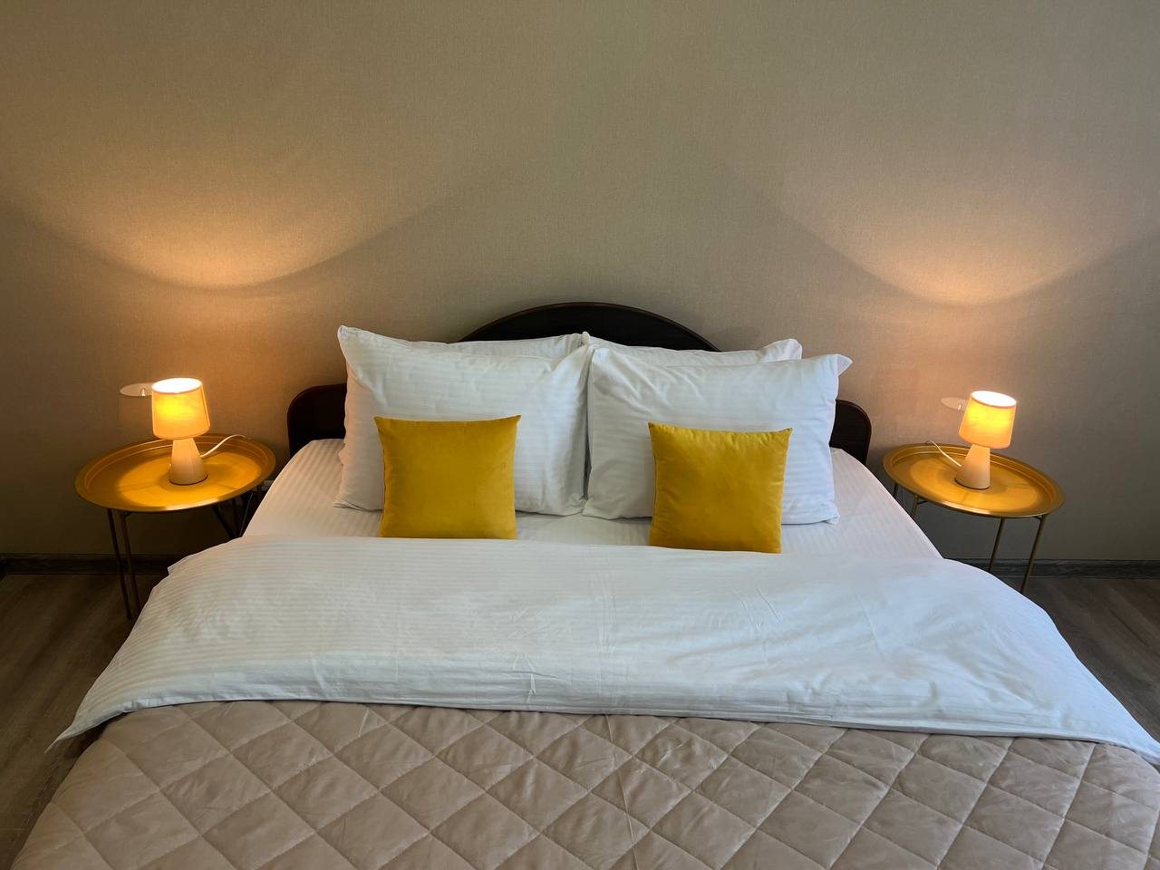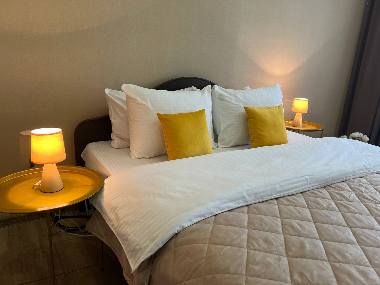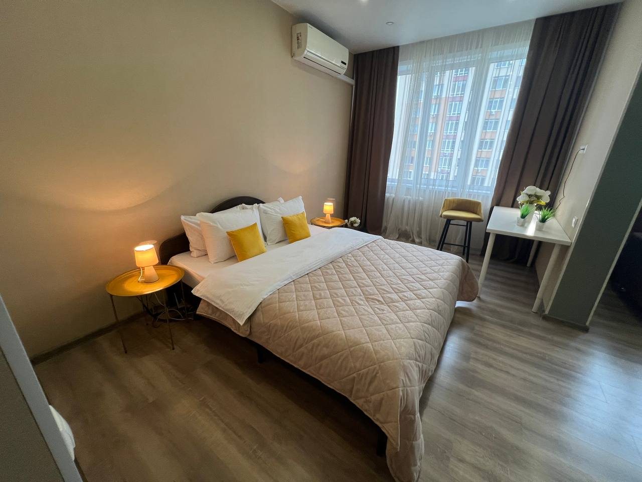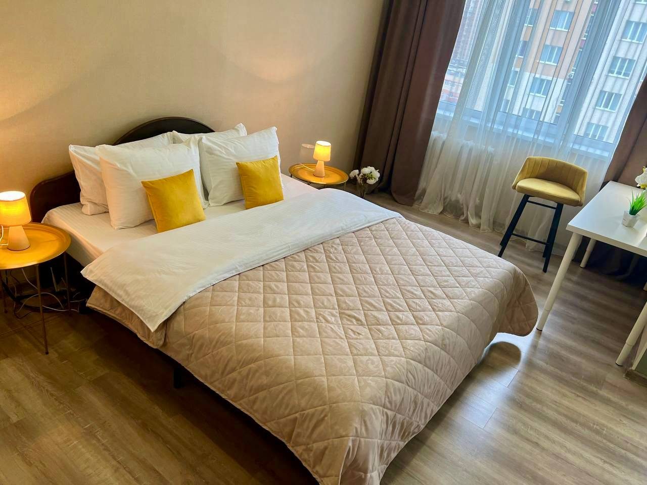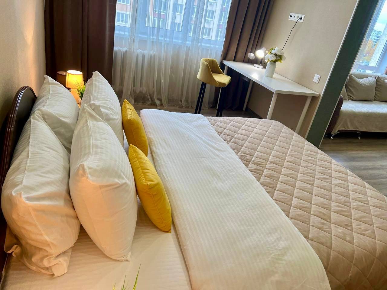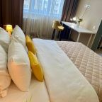 Комфортабельные апартаменты укомплектованы двуспальной кроватью, большими окнами, кондиционером, письменным столом, диваном, wi-fi, кухонной зоной и др. Санузел оборудован современной сантехникой и гигиеническими средствами.