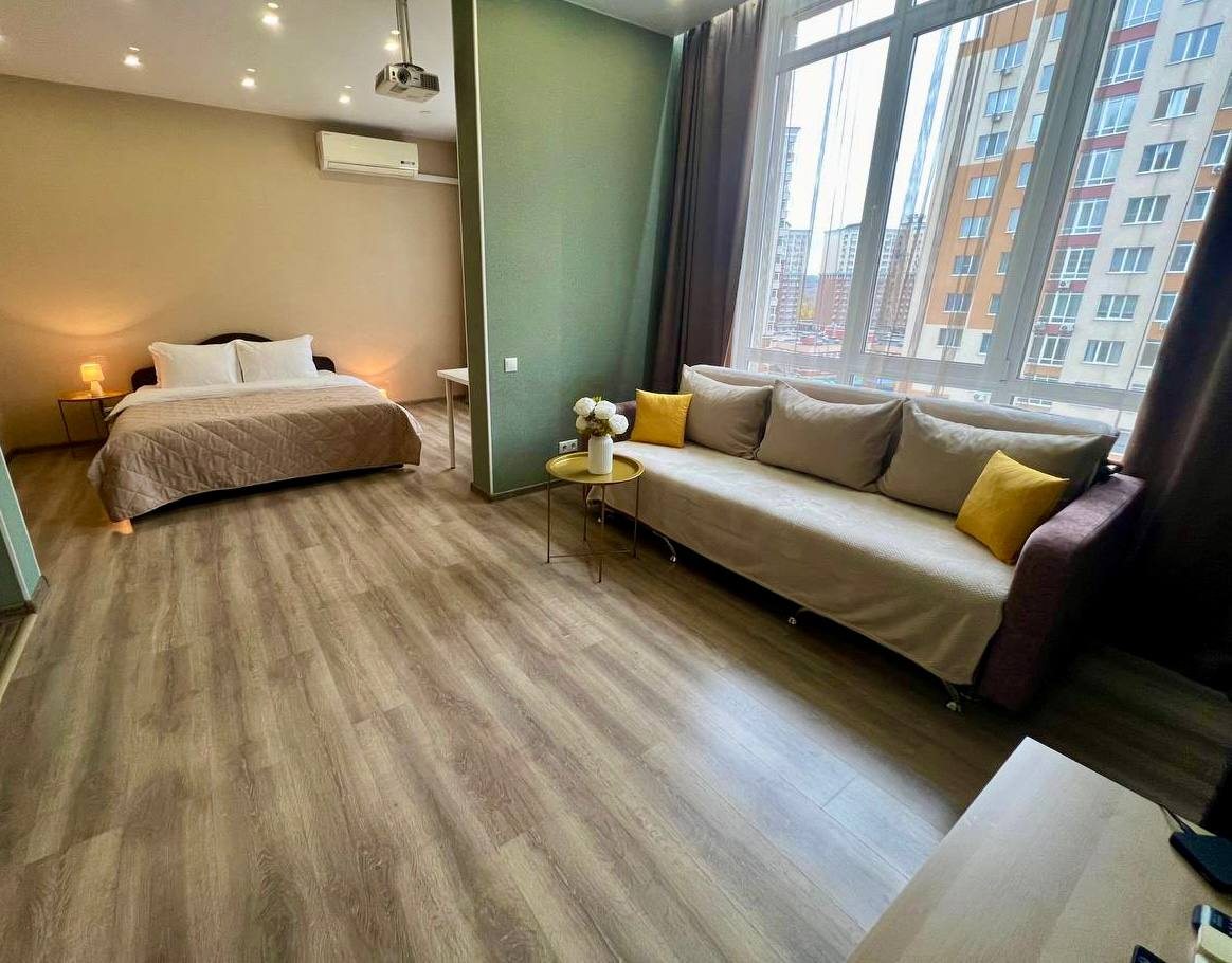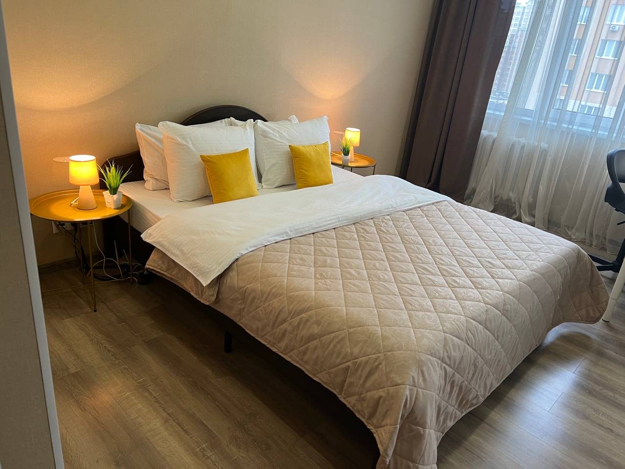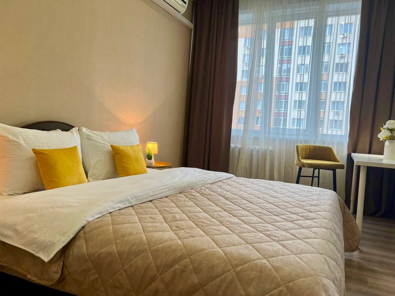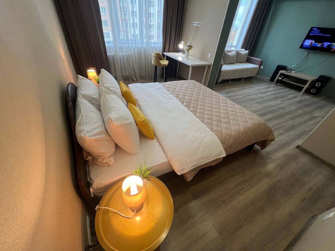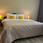 Комфортабельные апартаменты укомплектованы двуспальной кроватью, большими окнами, кондиционером, письменным столом, диваном, wi-fi, кухонной зоной и др. Санузел оборудован современной сантехникой и гигиеническими средствами.