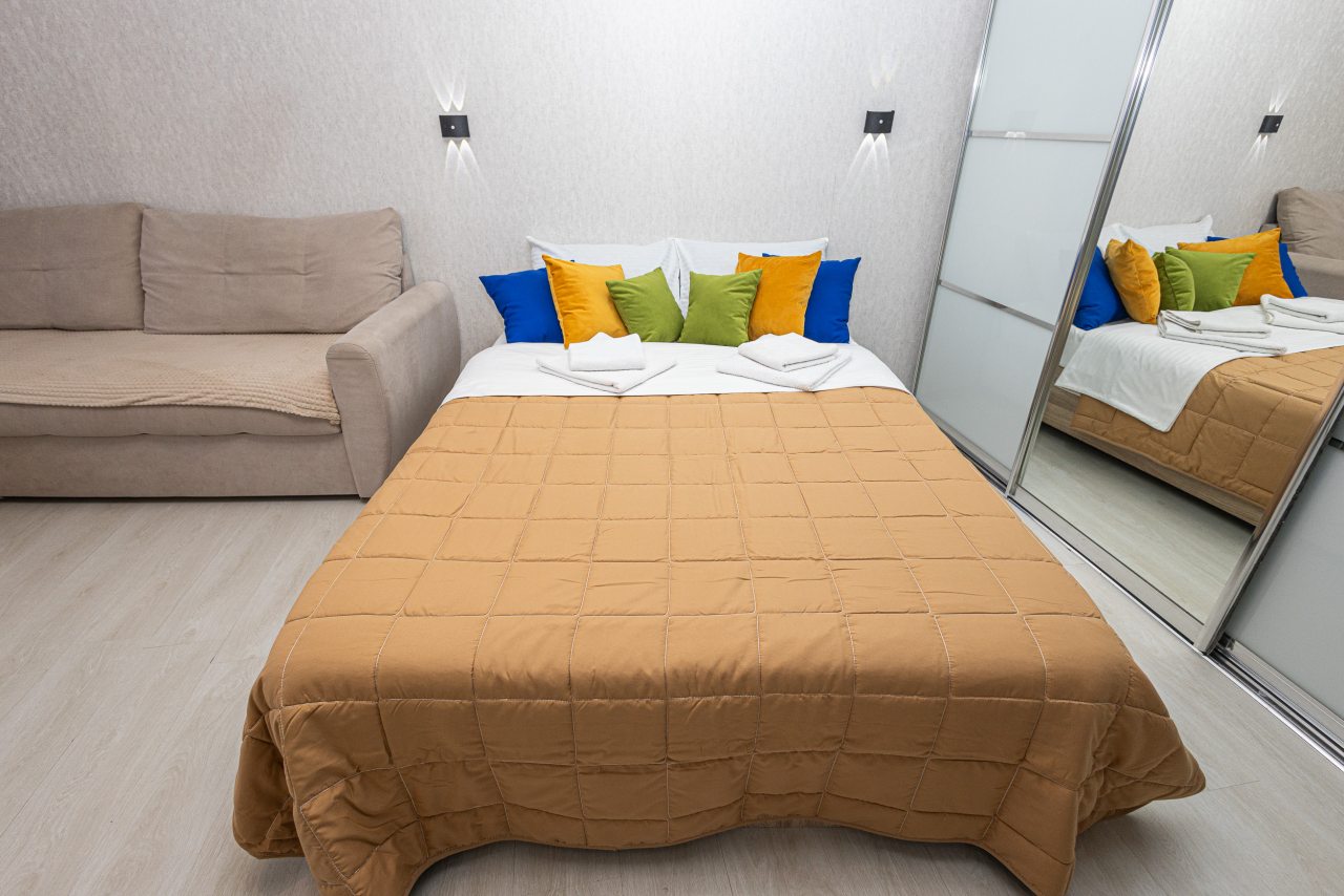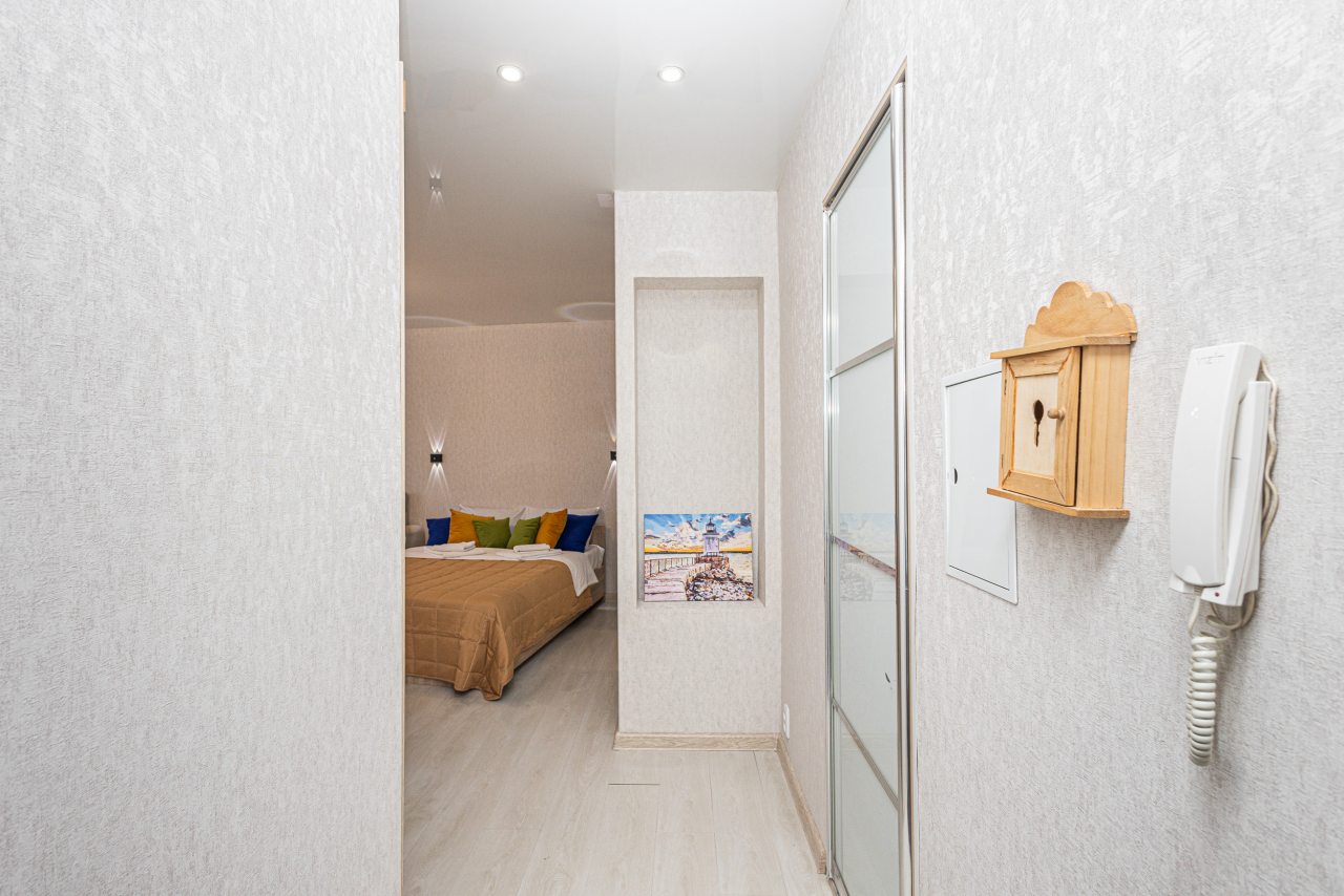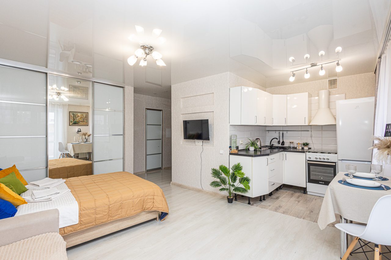 Светлые апартаменты оснащены удобными спальными местами, шкафом-купе, телевизором, кухонной зоной и собственной ванной комнатой. Доступна точка wi-fi. Санузел укомплектован современной сантехникой и средствами личной гигиены.