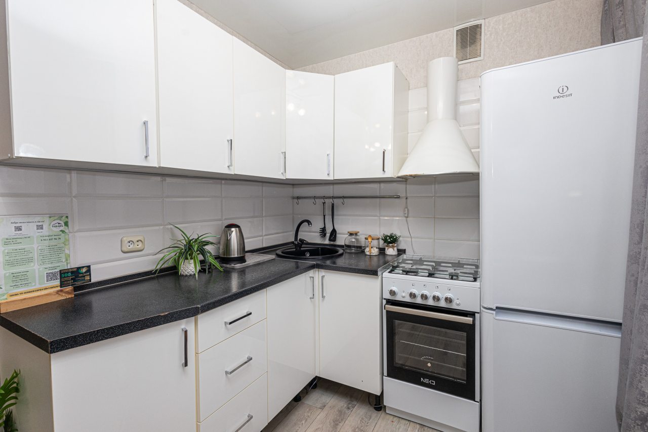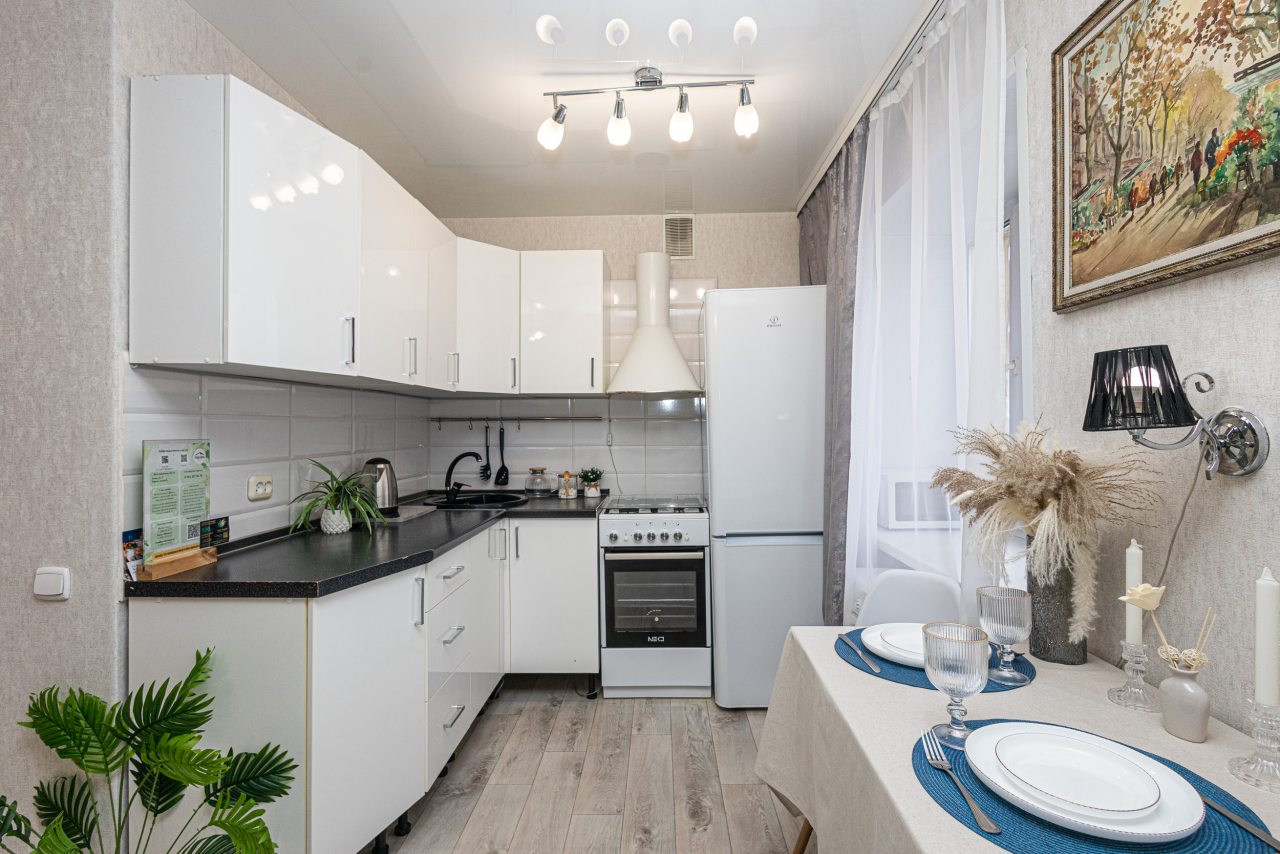 Кухня оборудована белоснежным гарнитуром, электрочайником, холодильником, газовой плитой, духовым шкафом и обеденным столом. В доступности большой выбор кафе и других заведений, где можно вкусно пообедать.